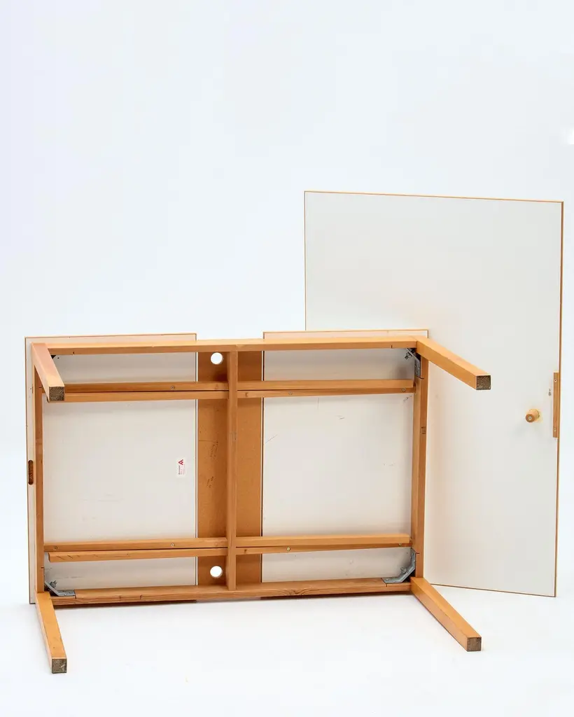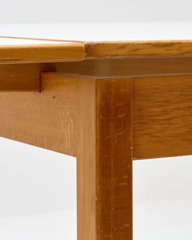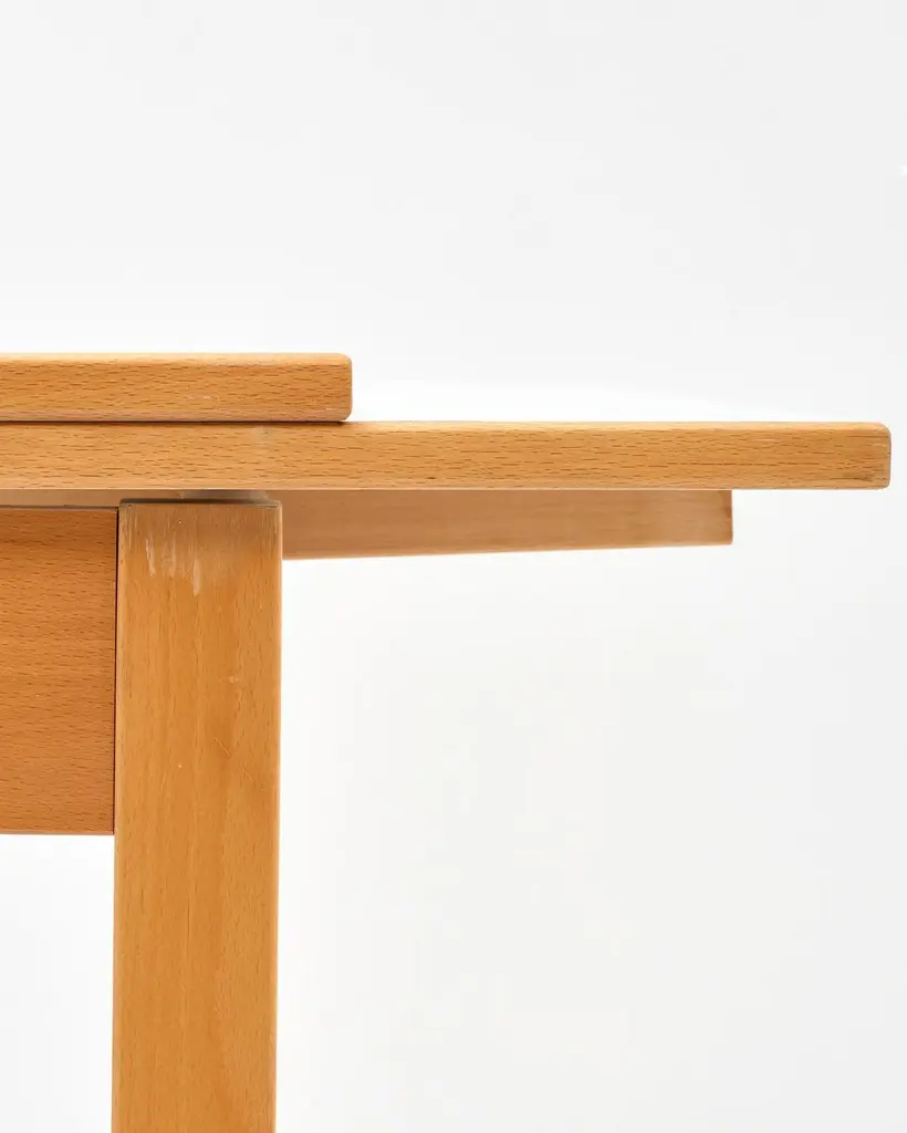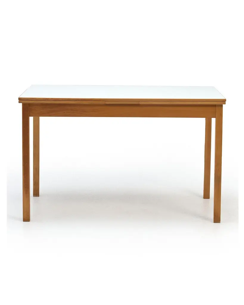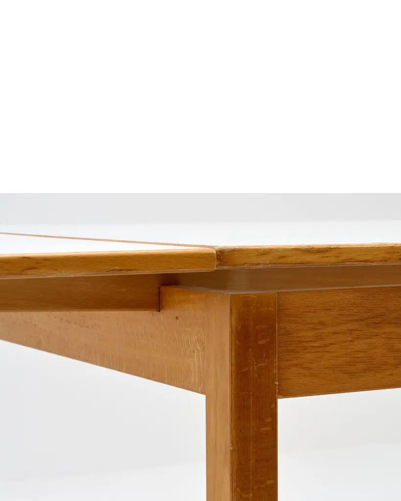 1970s Ansager Mobler Extendable Dining Table29.5" deep x 47.5" wide x 32" high Ansager Mobler refractory dining table DenmarkWhite laminate, birch. White formica dining table with two draw leaves, extending the length from 47.5" to 87". Marked to the underside.ConditionFair condition, noting some partial ring stains and general wear to the top. MaterialsShare