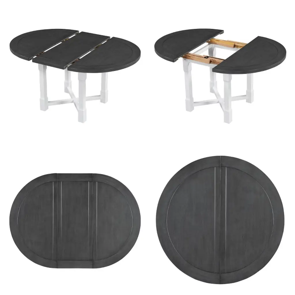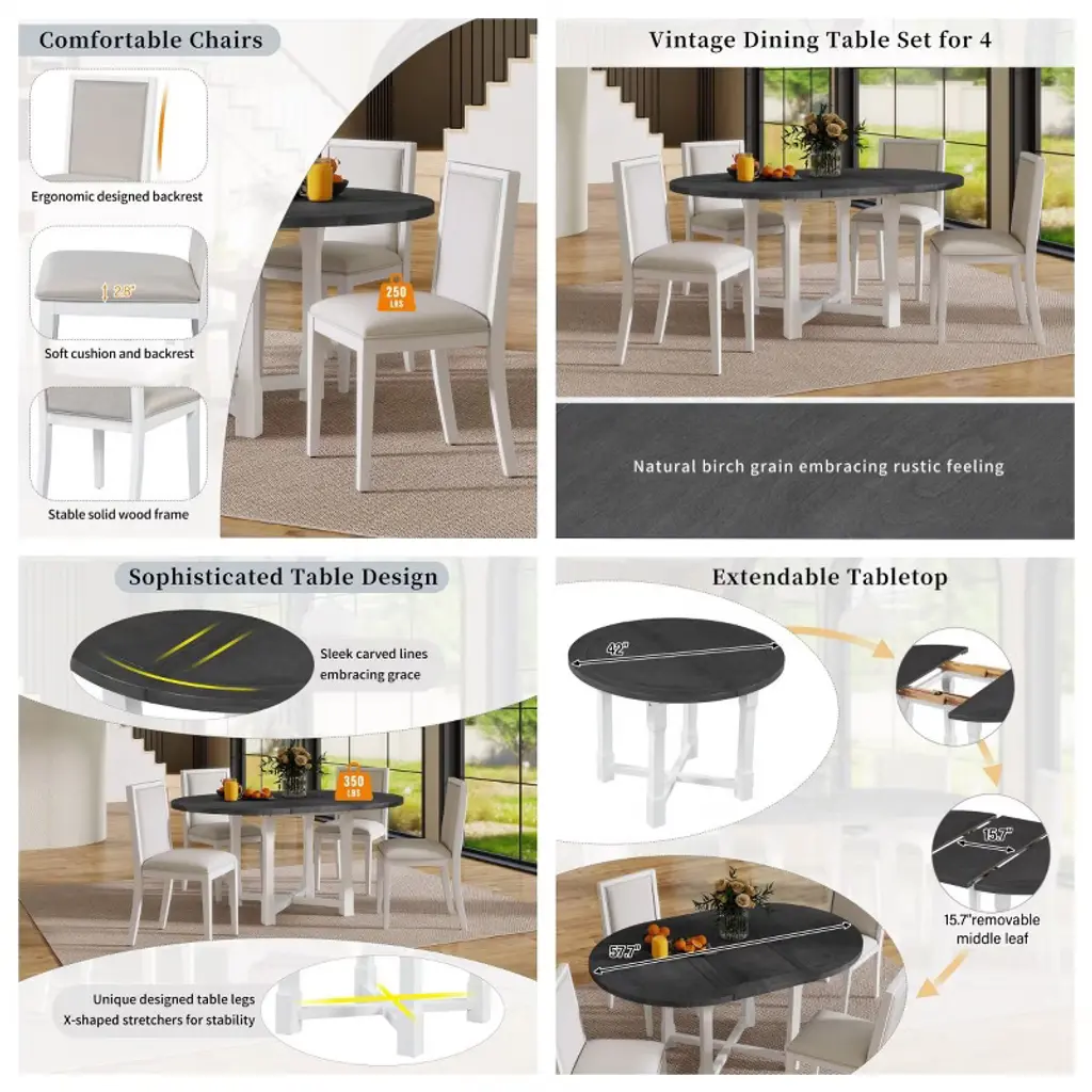 Transform your dining room or kitchen with the timeless charm and flexible functionality of this 5-piece extendable round dining table set. Designed for today’s homes, this farmhouse kitchen table set features a beautiful birch wood veneer top and solid rubber wood legs, blending vintage appeal with modern durability. The elegantly carved legs and X-shaped stretchers bring a touch of sophistication, while the natural wood grain and warm finish set the stage for memorable meals and cozy gatherings. Enjoy effortless versatility with the extendable round dining table, which seamlessly expands from 42" to 57.7" with the simple addition of a removable leaf. Whether you’re hosting a lively dinner party or sharing an everyday meal, this solid wood expandable dining table easily adapts to your needs, comfortably seating 4 to 6 people. The robust construction supports up to 350 lbs, making it both a beautiful centerpiece and a practical choice for busy households. Each upholstered dining chair is crafted for maximum comfort and support, featuring a sturdy solid wood frame, a 2.8-inch thick padded seat, and an ergonomically curved backrest. These dining chairs with soft upholstery offer extended comfort and proper posture, making every meal more enjoyable. With a farmhouse-inspired design, this kitchen table set for 4 to 6 adds warmth and hospitality to any space, while the durable materials and expert craftsmanship ensure years of dependable use. Assembly is straightforward with detailed instructions and all necessary tools included, so you can quickly enjoy your new dining room table set. This birch veneer dining table set is a versatile addition to dining rooms, kitchens, or breakfast nooks, perfect for those who appreciate classic style and modern convenience.