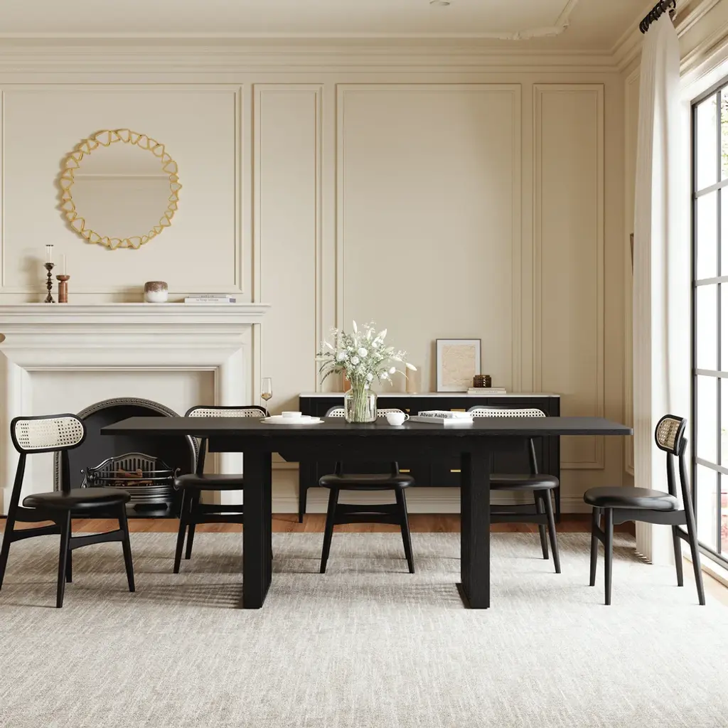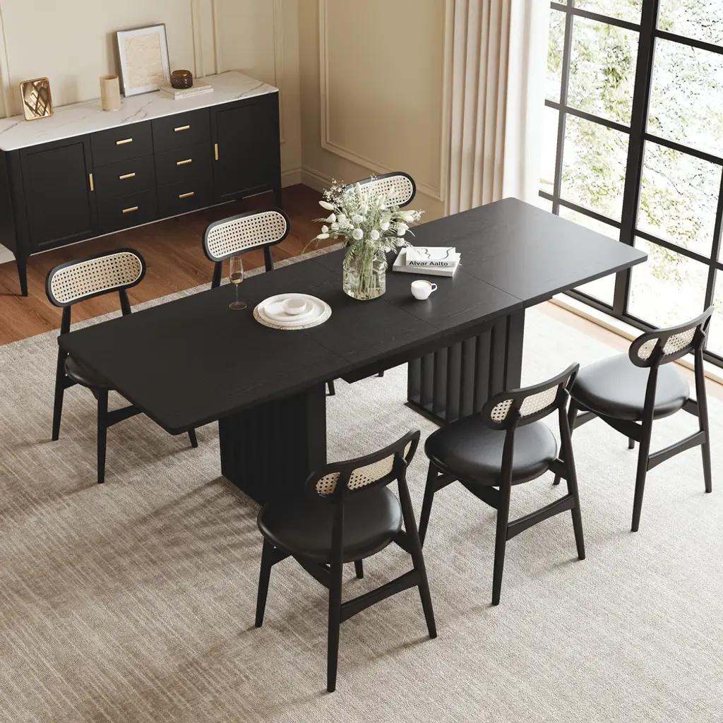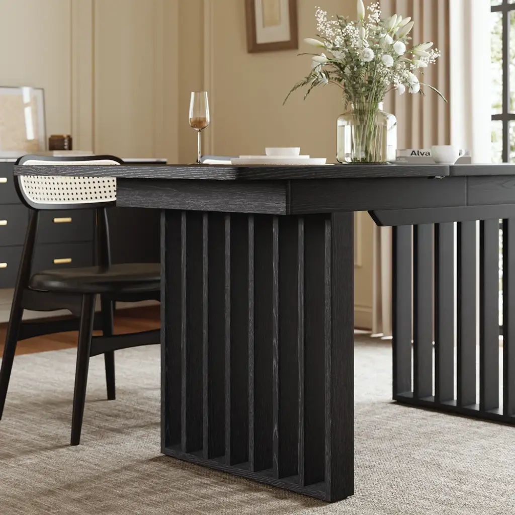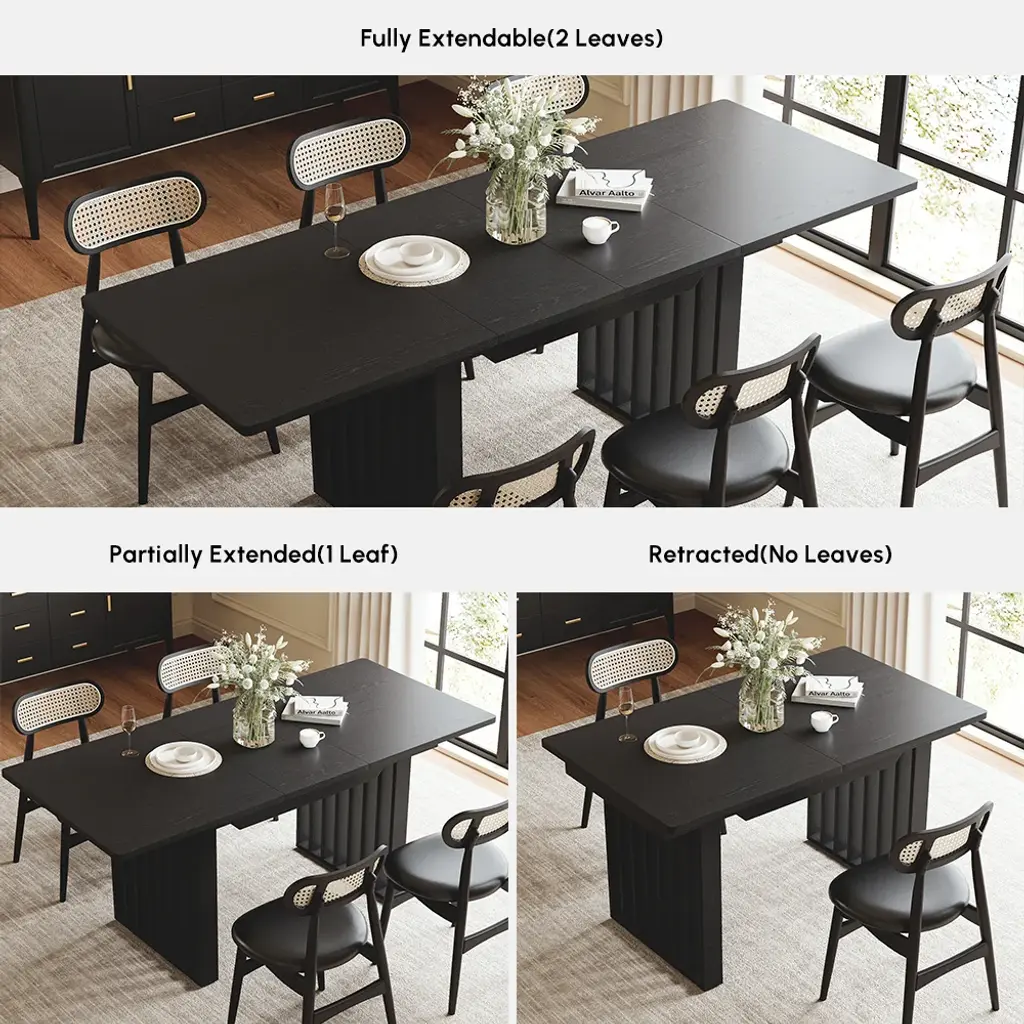 This extendable dining table in sleek black smoothly extends from 55" to 87" and sits 4-8 people comfortably. The modern design, added to its versatile functions, makes it the ultimate choice for intimate dinners to bigger gatherings. It will be perfect in any dining space, blending style with practicality.
