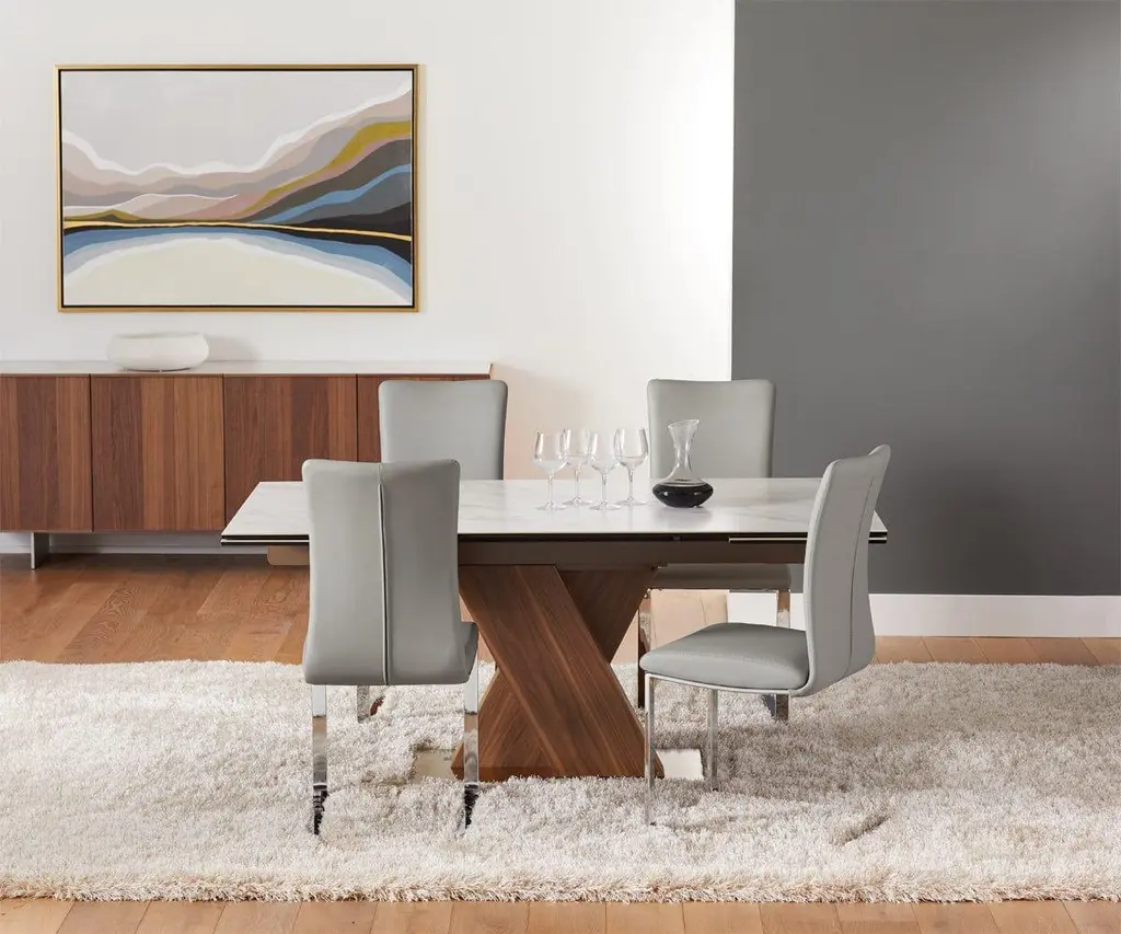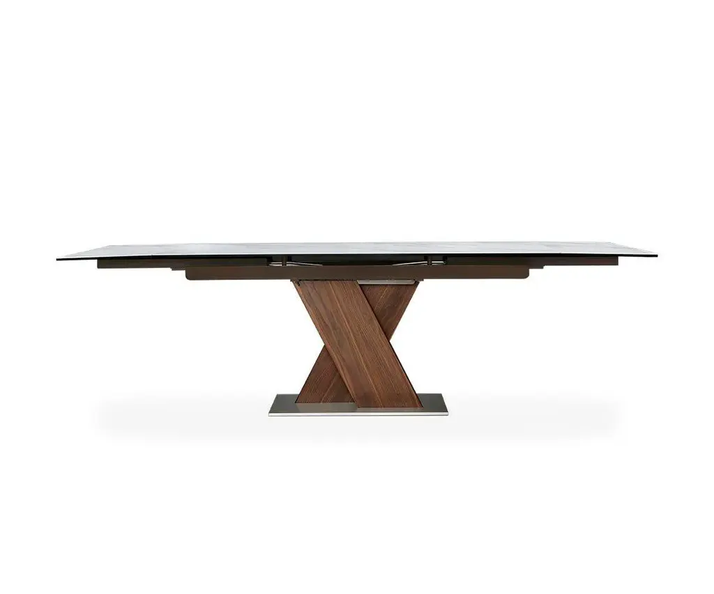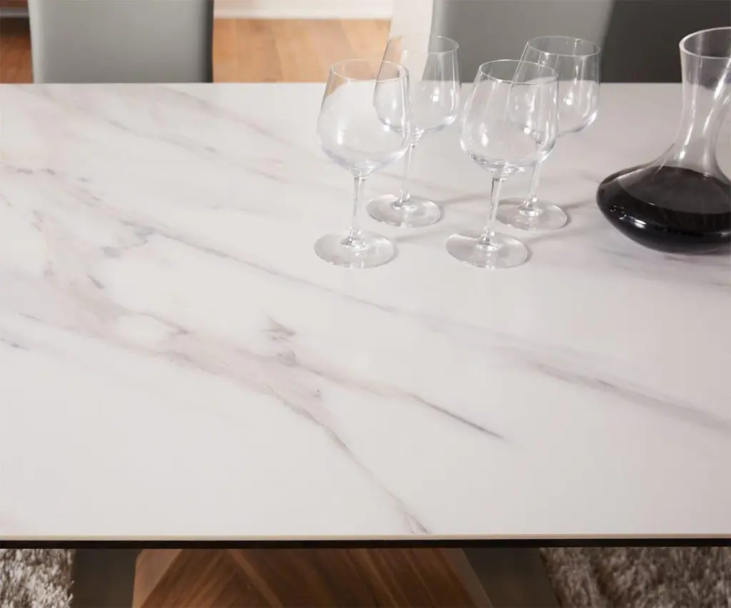 The Acero Extension Dining table blends function with Scandinavian aesthetics. It's crafted with a heat and moisture-resistant ceramic table-top. The pale, neutral tone contrasts with rich walnut veneer legs for a classic Scandinavian aesthetic. Plus, for larger gatherings or dinner parties, you can easily extend the table with 2 leaves to seat up to ten guests!