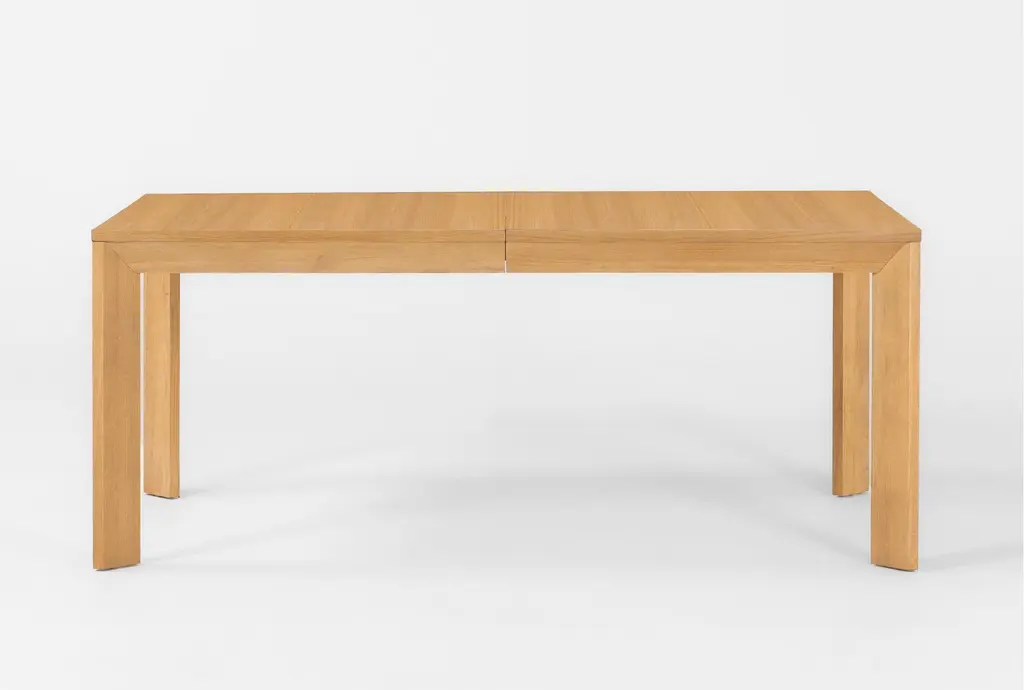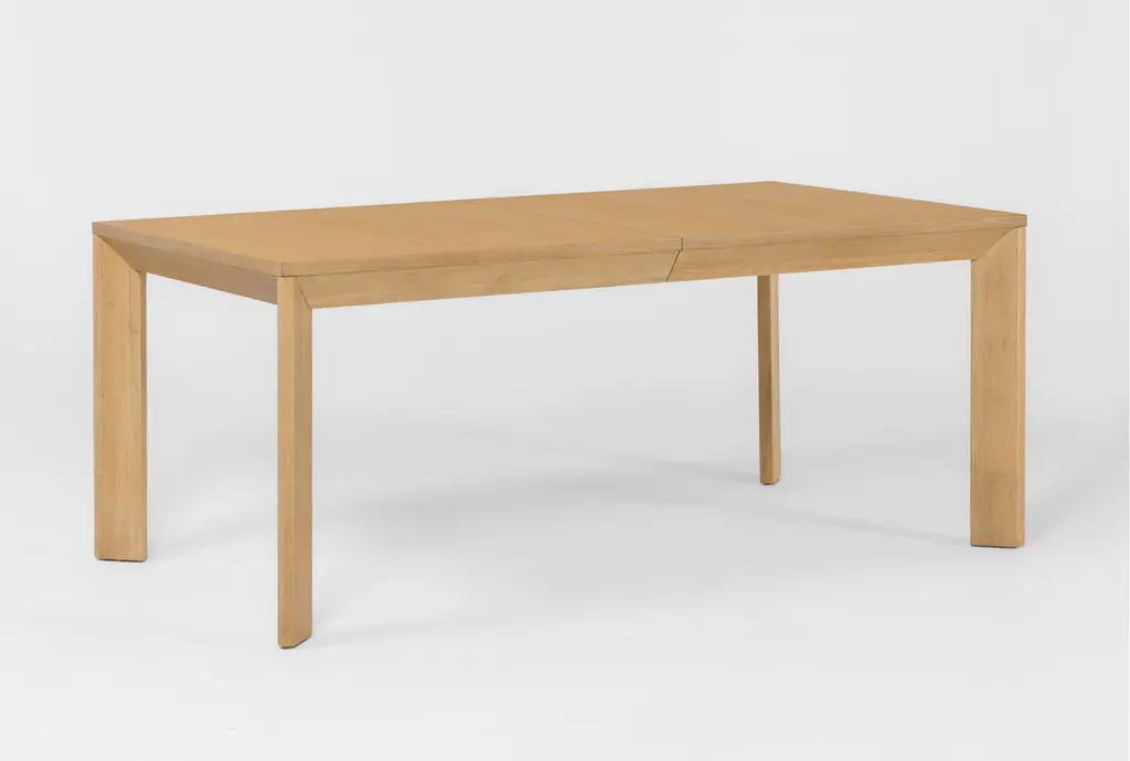 The Adamas Natural + Toast Oak Wood 72-90" Extendable Faceted Parsons Dining Table brings modern style into your dining room. Its natural wood finish and oak veneer create a warm and inviting atmosphere. Perfect for large gatherings, this table extends to accommodate up to eight guests comfortably.