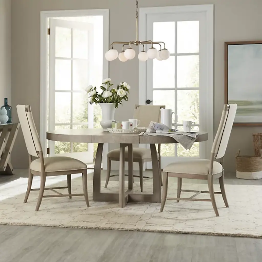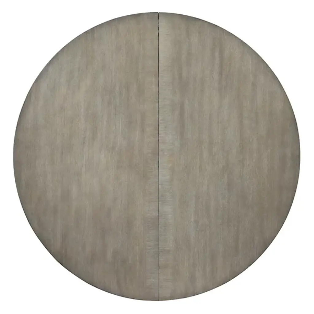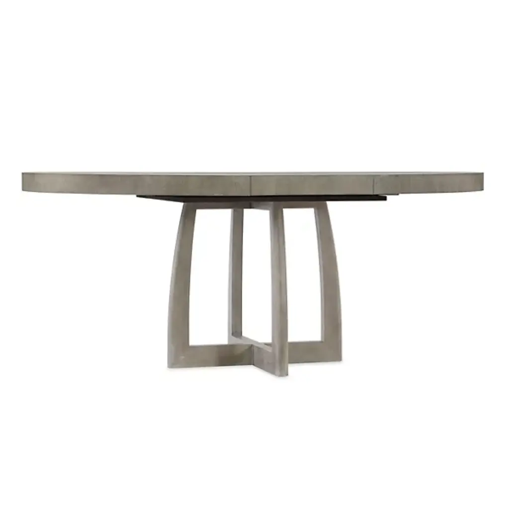 The Affinity Extendable Dining Table from Hooker Furniture presents a modern form with rustic surfacing, sheathed in gray oak veneer and wire-brushed for extra texture. The table features geared wooden machinery to employ the central leaf, taking the table to 66 inches of reach when added, offering space for four or more. The soft curves of the open plinth base contrast well with the flat planes of the solid wood tabletop, showing off an open interior offset by the more rustic textures.
