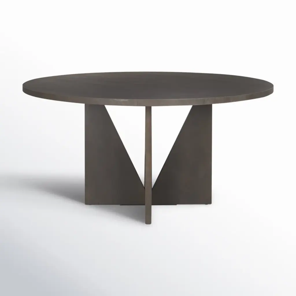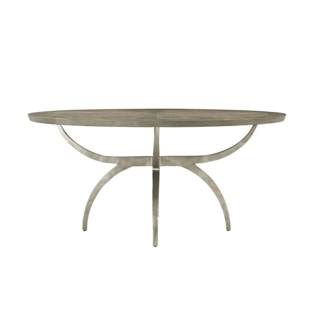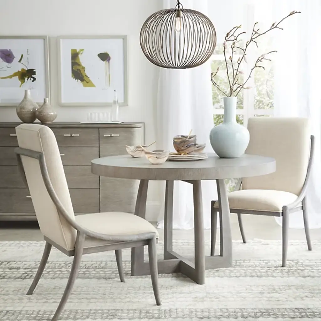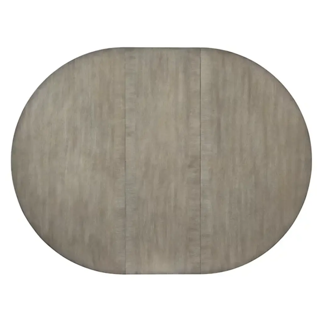 The Affinity Extendable Dining Table from Hooker Furniture presents a modern form with rustic surfacing, sheathed in gray oak veneer and wire-brushed for extra texture. The table features geared wooden machinery to employ the central leaf, taking the table to 66 inches of reach when added, offering space for four or more. The soft curves of the open plinth base contrast well with the flat planes of the solid wood tabletop, showing off an open interior offset by the more rustic textures.