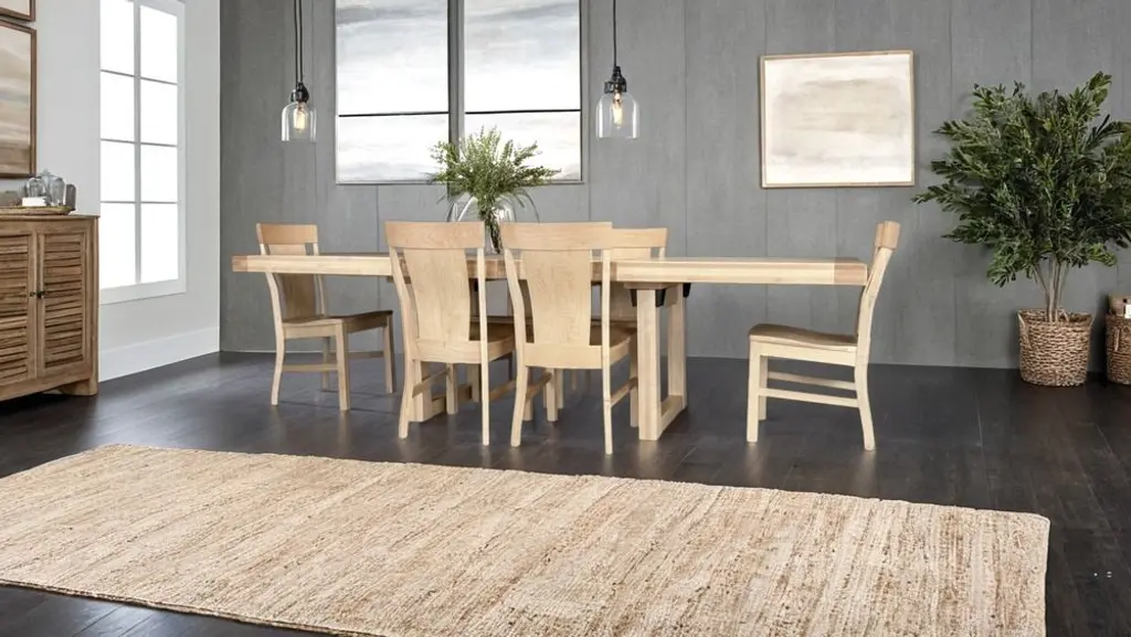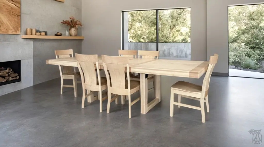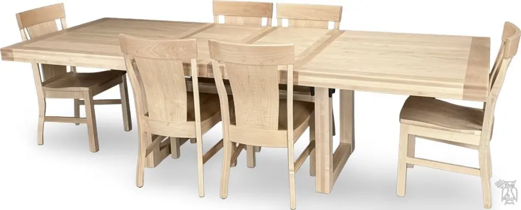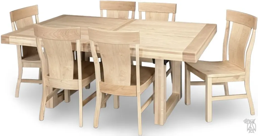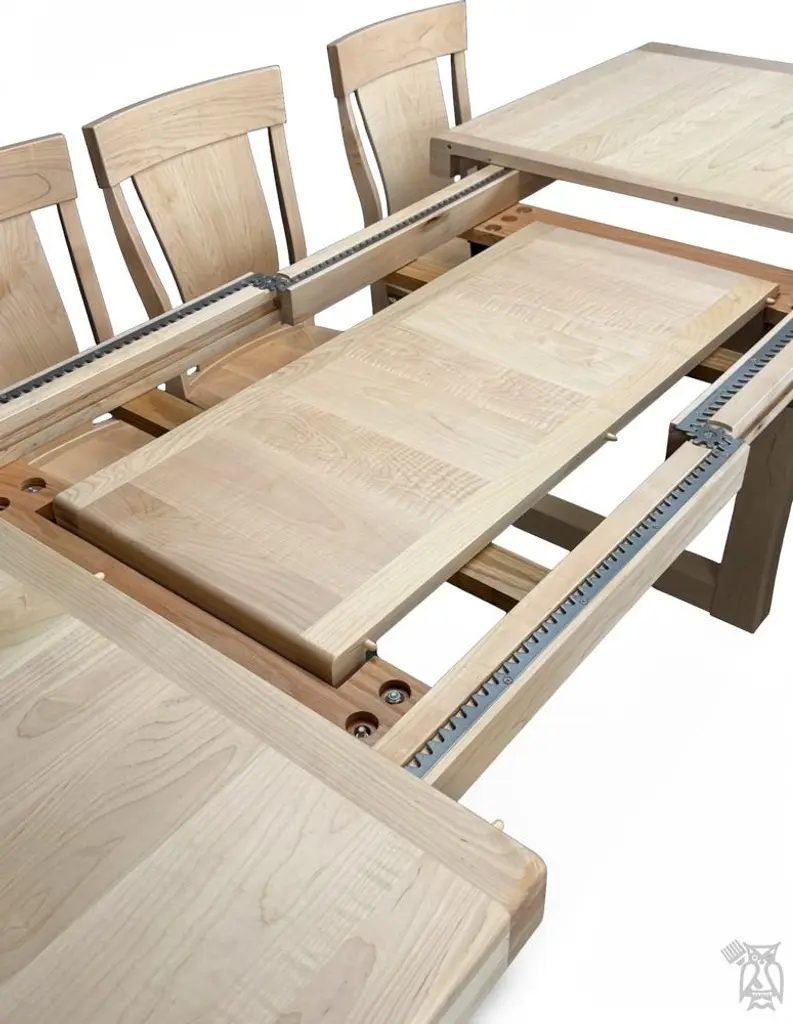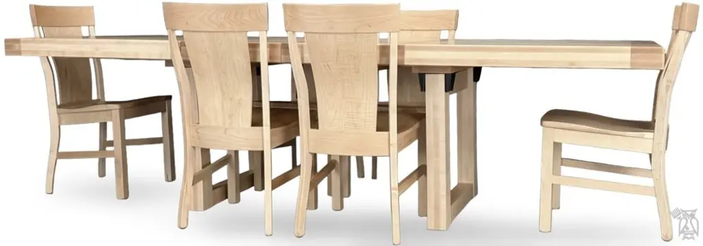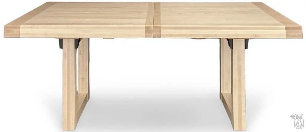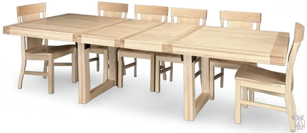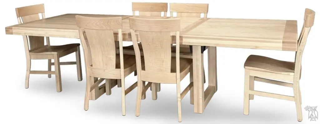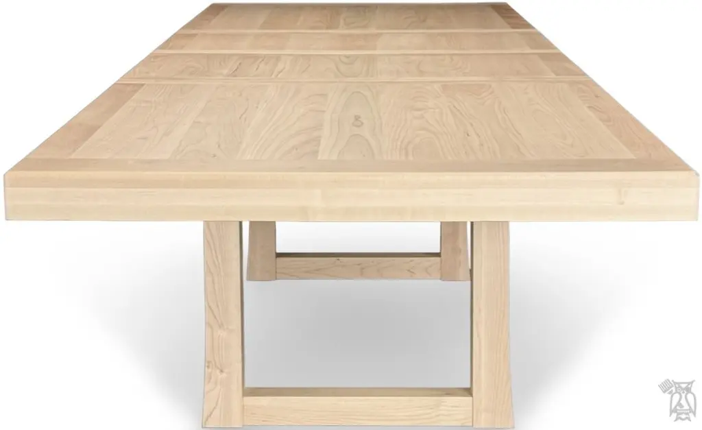 Amish Crafted Solid Red Leafy Maple Wood Trestle Extension Table in Elegance Finish. This item is stocked in Solid Red Leafy Maple with Invisible Elegance finish with low sheen and UV protector or special order wood and color. Designed with a comfort aesthetic at its forefront, this table features a smooth roundover top edge profile and a 3" thick top. This table comes with 2-18" leaves. One leaf will store inside the table. Iron stabilizers on base to ensure integrity, stability, and strength. This table comes standard with gear glides for easy opening and closing. The Invisible Elegence finish includes a UV protector to reduce yellowing in sunlight. Red Leafy Maple is a versatile hardwood known for its smooth, close grain and attractive reddish-brown tones that take stain well. Janka scale: 950. Each collection has a full range of table sizes, side chairs, arm chairs, benches, servers and chinas. Size options: 42x66 (seats 6) or 42x66w/ 1-18" SL leaves (seats 8) or 42x66w/ 2-18" 1-SL, (seats 10) 42x72 (seats 6) or 42x72w/ 1-18" SL leaves (seats 8) or 42x72w/ 2-18" 1-SL, (seats 10) 48x72 (seats 8) or 48x72w/ 1-18" SL leaves (seats 8) or 48x72w/ 2-18" 1-SL, (seats 10) 48x72 (seats 8) or 48x72w/ 1-18" SL leaves (seats 8) or 48x72w/ 2-18" 1-SL, (seats 10) or 48x72w/ 3-16" 1-SL, (seats 12) 42x84 (seats 8) 42x96 (seats 10) 3 chairs fit between base 42x108 (seats 10) 3 chairs fit between base 54x108 (seats 10) 3 chairs fit between base Build Options: (no change in price) Choose Red Leafy Maple, Brown Maple, Rustic Cherry, Rustic Hickory, Red Oak, Rustic Quartersawn White Oak, Rustic Red Oak, Ambrosia Maple, Tiger Maple, Flat Sawn White Oak or Elm Choose any single-tone or two-tone factory finish or paint. Add optional rub-thru or glazing. Hundreds of color options are available. Add optional light, medium, heavy distressing or change the amount of rough-sawn texture Reduce the width or length of the table top size (most tables available in 10 or more standard sizes) Leg tables may be upgraded to gear slides (although they will not self-store leaves) Change the top shape, edge profile, leg or pedestal style All Amish Heirloom Furniture is handcrafted by hand in the heart of Ohio just for you. All furniture is hand-crafted from 100% solid wood. The wood is protected by a sealant offering excellent moisture and heat resistance. Visit our store to see all of your options to personalize this furniture your way. Download the Amish Heirlooms Catalog in the Resources tab to see styles, sizes, woods & colors. Matching pieces sold separately. No particle board. Made in the USA. Tables require assembly in room. Manufacturer: Amish Heirlooms by Hoot Judkins.
