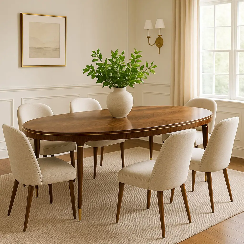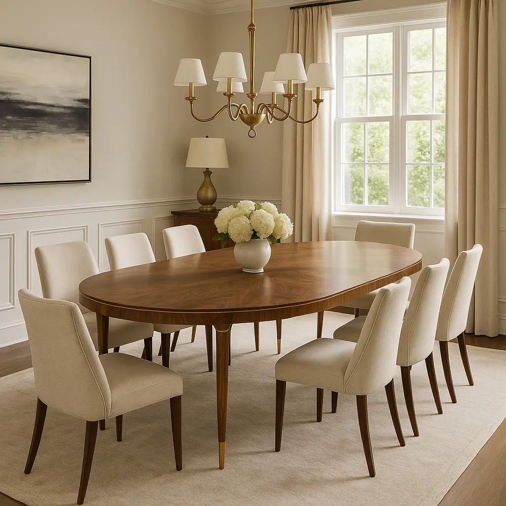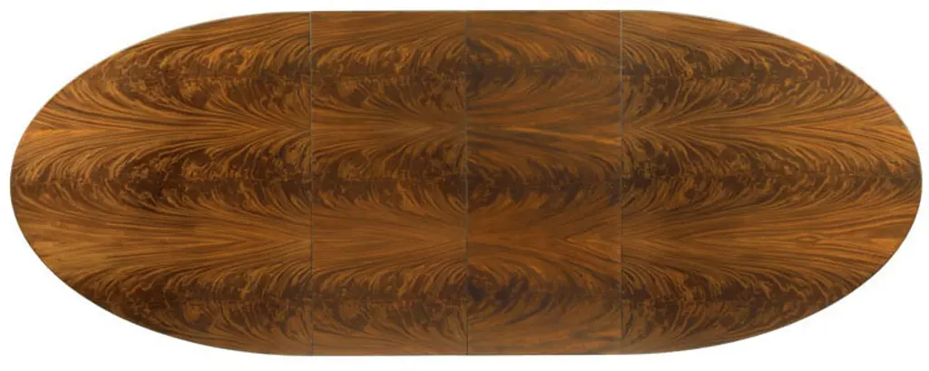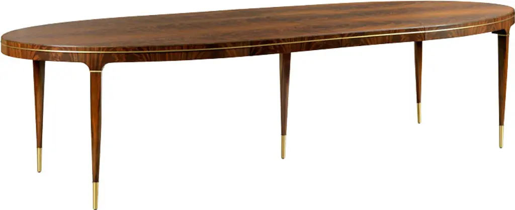 This dining table comes with two 20-inch leaves, enabling it to expand from 78 inches to 118 inches so that it can seat as many as 12 people. Brass ferrules call attention to the gracefully tapered legs, just as the brass trim along the apron accentuates the lavishly figured crotch mahogany veneer.