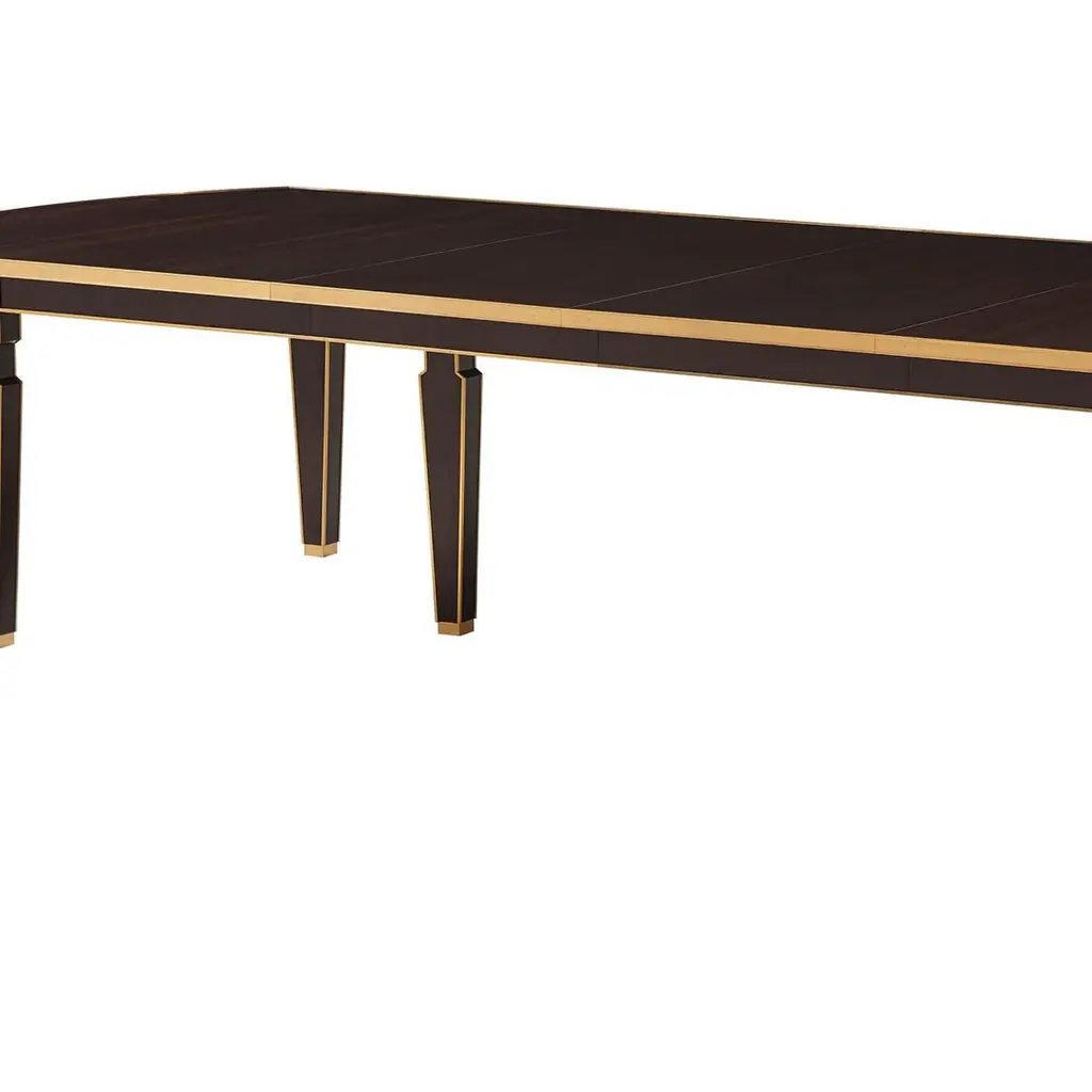 An Art Deco style extension dining table with a historic classic Silhouette. The rectangular dining table with curved ends and a brass-bound apron. Set on slatted baluster legs trimmed and outlined in gilt. Open dimensions: 162" W x 50" D x 30" HClosed dimensions: 90" W x 50" D x 30" HClearance: 25.5"3 x 24" leaves.