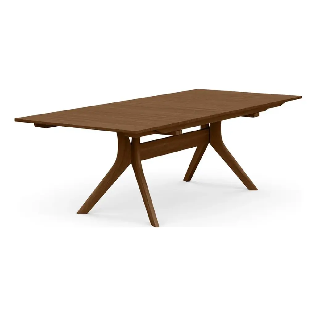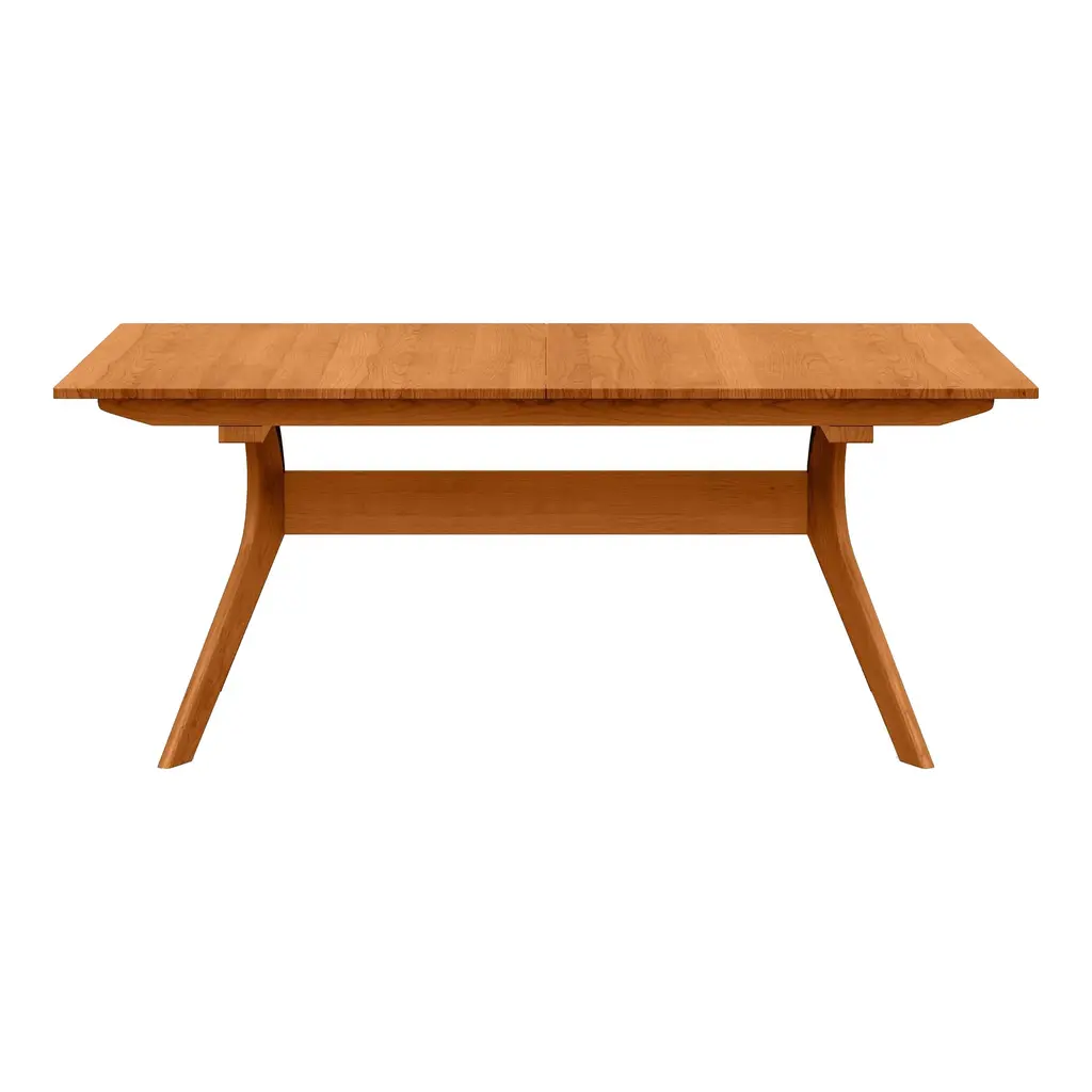 A well-crafted table designed for larger dining spaces to seat a crowd, the Audrey Extension Dining Table from Copeland Furniture combines quality craftsmanship with natural beauty for a high-end dining table design. Crafted right here in the United States from solid American black walnut or cherry wood, this dining table showcases a double X formation creating visual appeal beneath the table as well as providing a rigid base that gives diners plenty of unobstructed leg room. Open up the extension when extra guests stop by and pair with a coordinating solid wood seat or upholstered option for a beautiful and welcoming meal at home. Features
