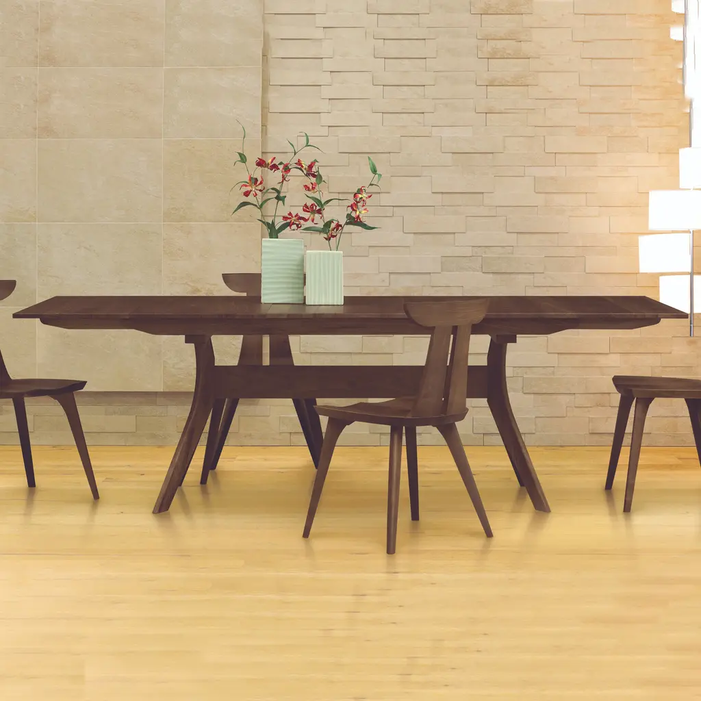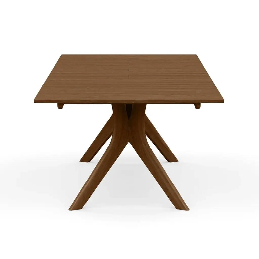 A well-crafted table designed for larger dining spaces to seat a crowd, the Audrey Extension Dining Table from Copeland Furniture combines quality craftsmanship with natural beauty for a high-end dining table design. Crafted right here in the United States from solid American black walnut or cherry wood, this dining table showcases a double X formation creating visual appeal beneath the table as well as providing a rigid base that gives diners plenty of unobstructed leg room. Open up the extension when extra guests stop by and pair with a coordinating solid wood seat or upholstered option for a beautiful and welcoming meal at home. Features