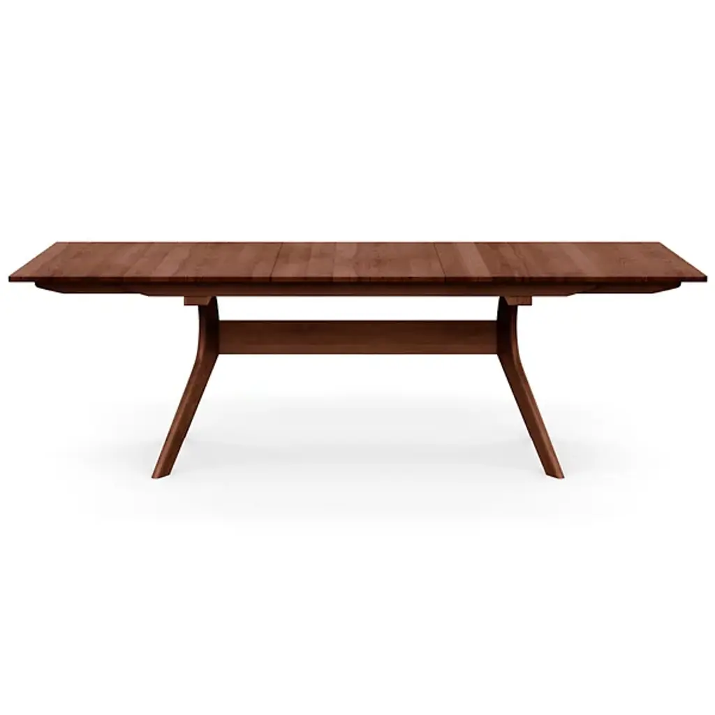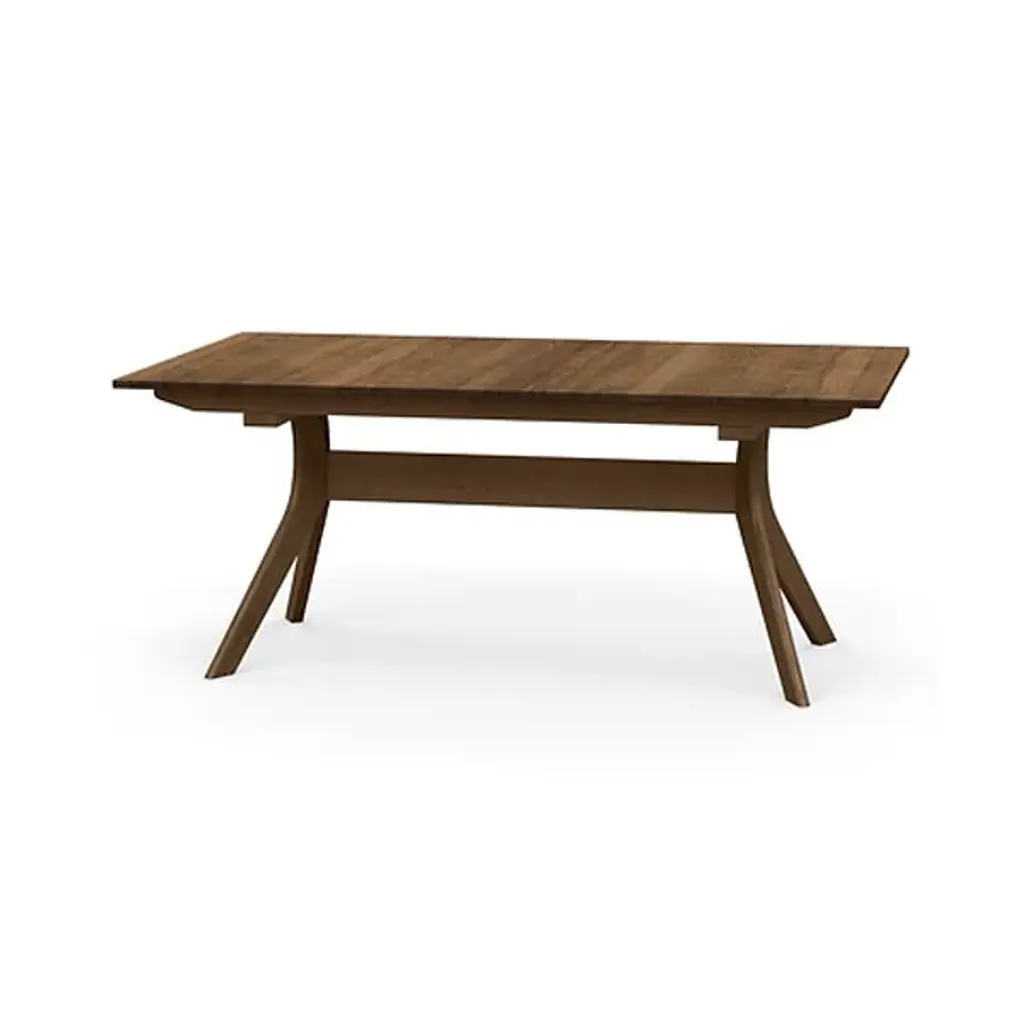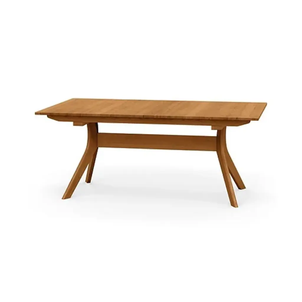 The double 'X' formation of the Audrey Wood Extension Table trestle creates a state of dynamic tension giving the design a rigid base that provides diners with plenty of unobstructed leg room. The eye-catching table opens with a single 24” self equalizing, ball bearing extension leaf. The self-storing butterfly leaf mechanism allows for single handed operation to easily expand or close the table in a matter of seconds.Audrey Wood Extension Table is crafted in solid cherry or solid American black walnut with a range of sizes and natural wood finish options. Copeland Furniture uses sustainably harvested hardwoods from the American Northern Forest. All lumber used by Copeland Furniture comes from within 500 miles of their factory in Vermont, thus reducing fossil fuel consumption and carbon dioxide emissions from transportation. The environmental values of preservation and stewardship are reflected in every piece of furniture produced by Copeland Furniture.