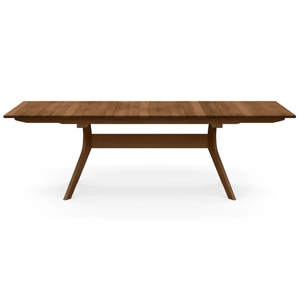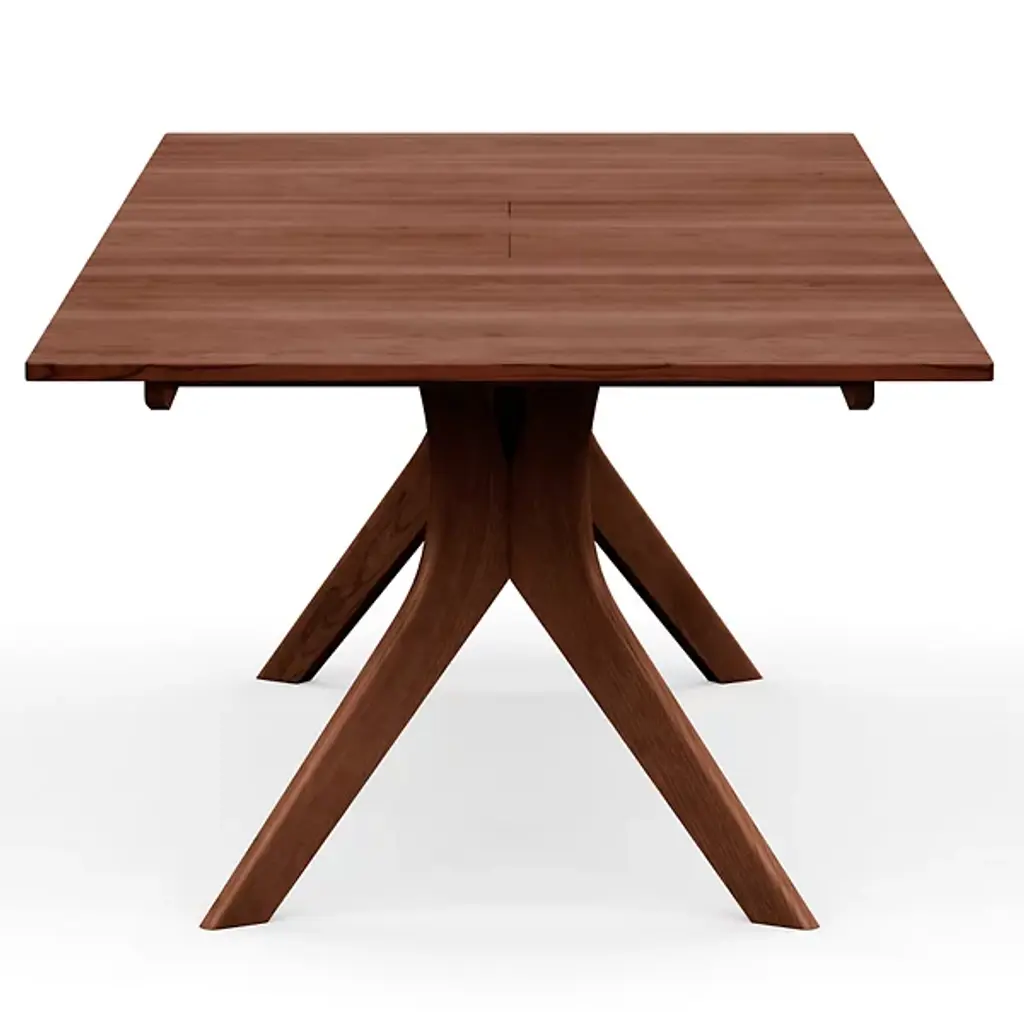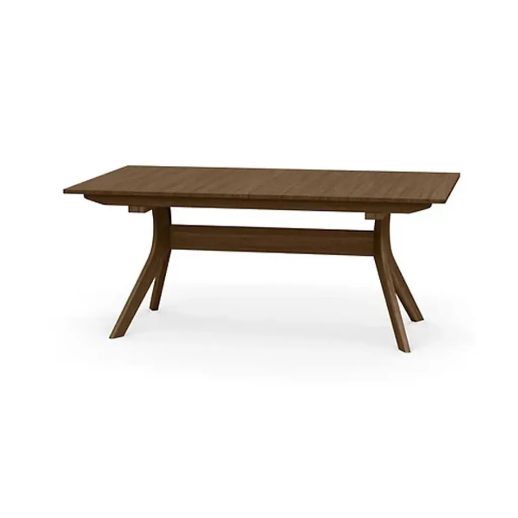 The double 'X' formation of the Audrey Wood Extension Table trestle creates a state of dynamic tension giving the design a rigid base that provides diners with plenty of unobstructed leg room. The eye-catching table opens with a single 24” self equalizing, ball bearing extension leaf. The self-storing butterfly leaf mechanism allows for single handed operation to easily expand or close the table in a matter of seconds.Audrey Wood Extension Table is crafted in solid cherry or solid American black walnut with a range of sizes and natural wood finish options. Copeland Furniture uses sustainably harvested hardwoods from the American Northern Forest. All lumber used by Copeland Furniture comes from within 500 miles of their factory in Vermont, thus reducing fossil fuel consumption and carbon dioxide emissions from transportation. The environmental values of preservation and stewardship are reflected in every piece of furniture produced by Copeland Furniture.
