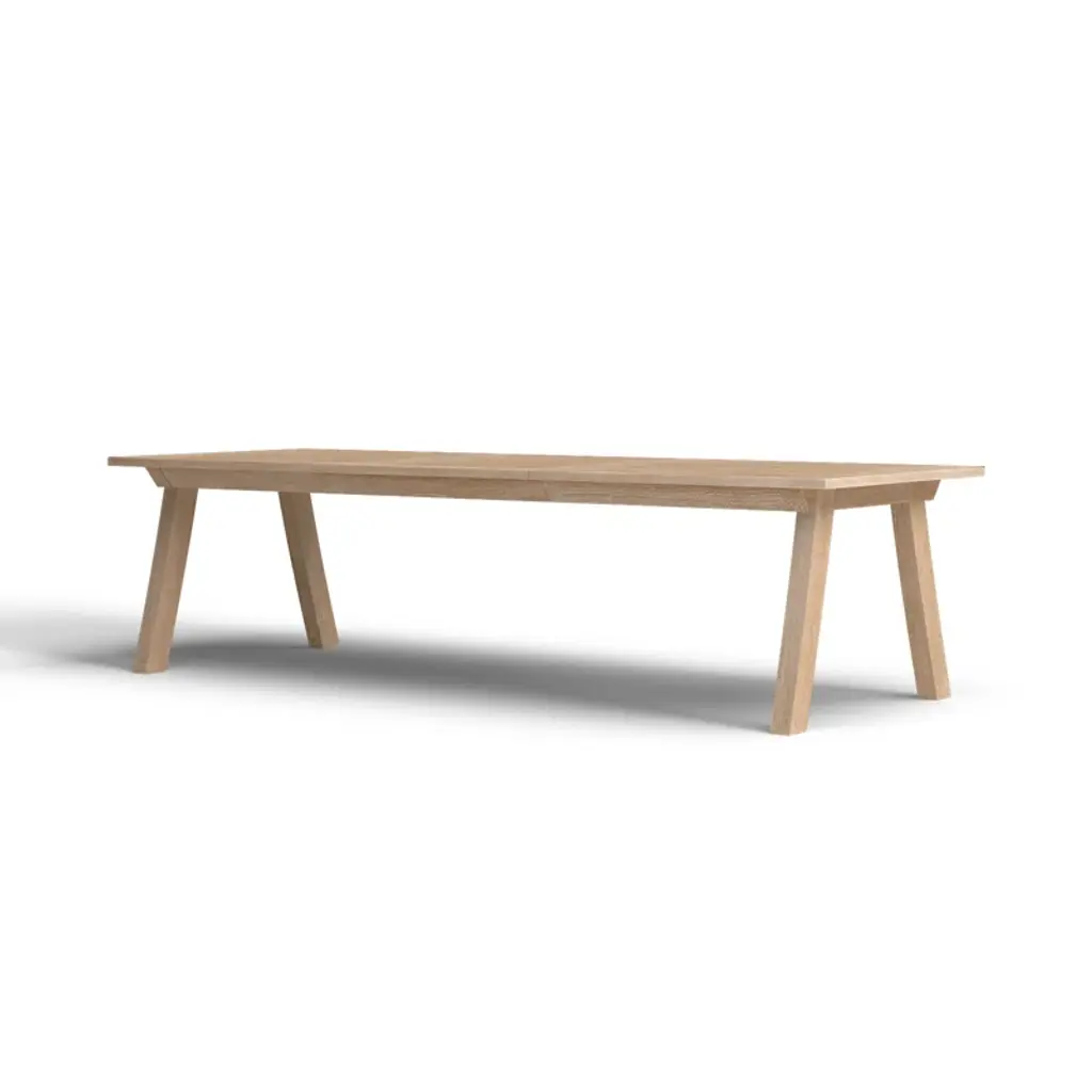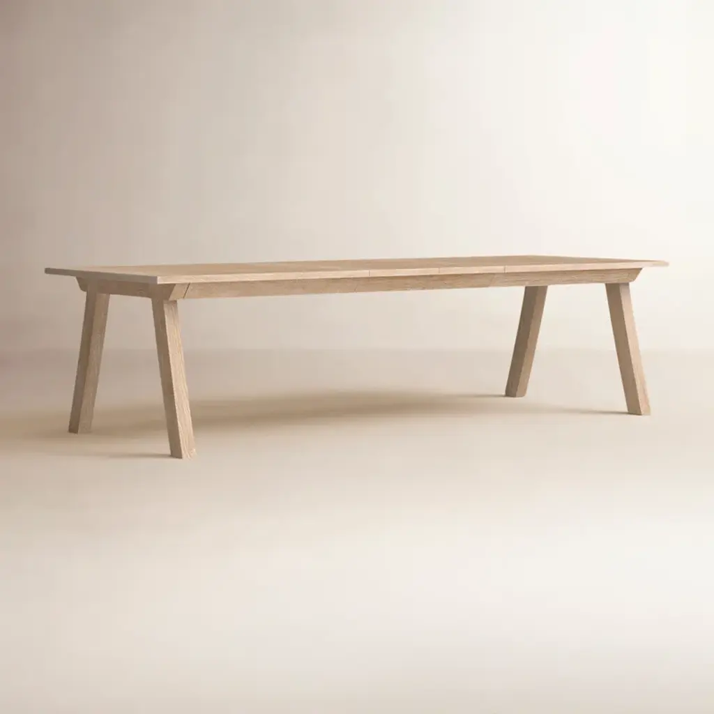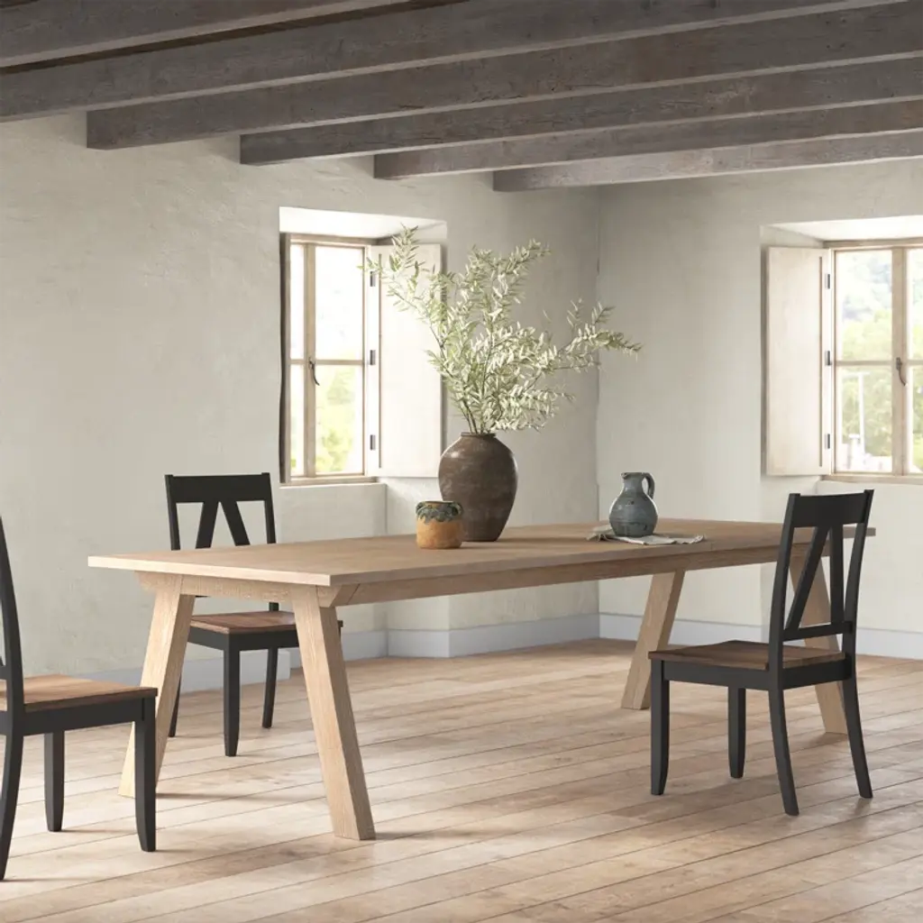 The Bilbrook dining table is a modern-rustic statement piece, featuring angled legs and a robust tabletop, all finished in a perfectly crisp white hue.