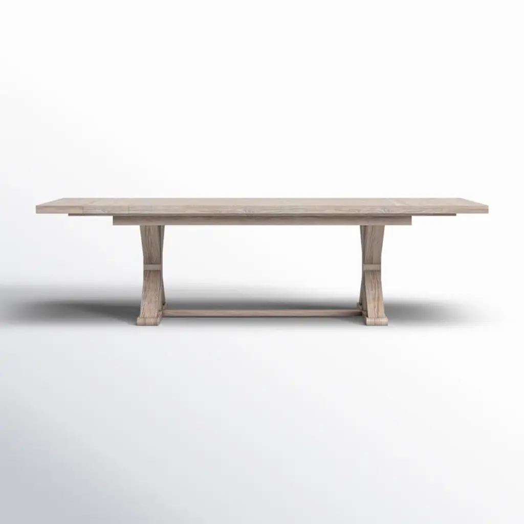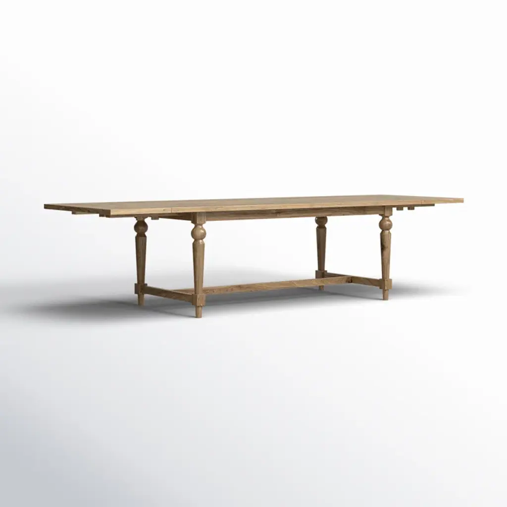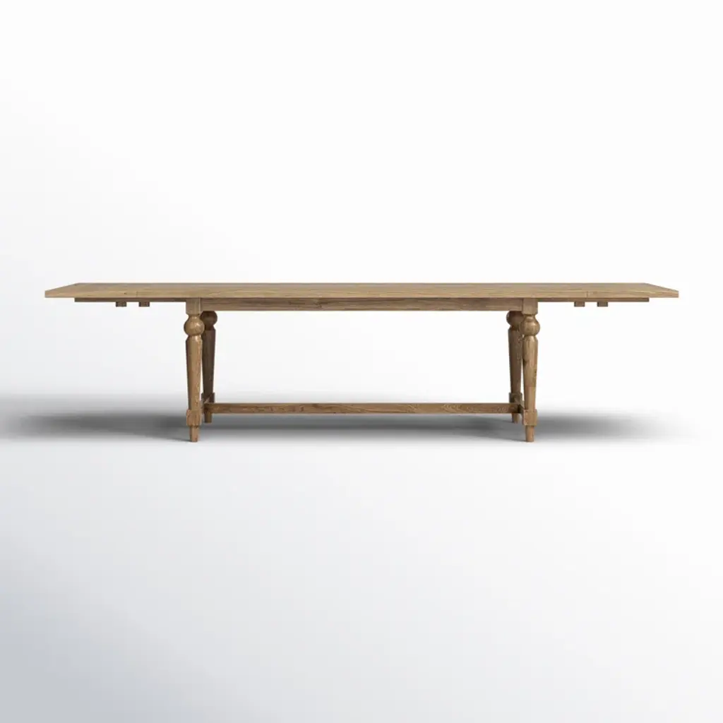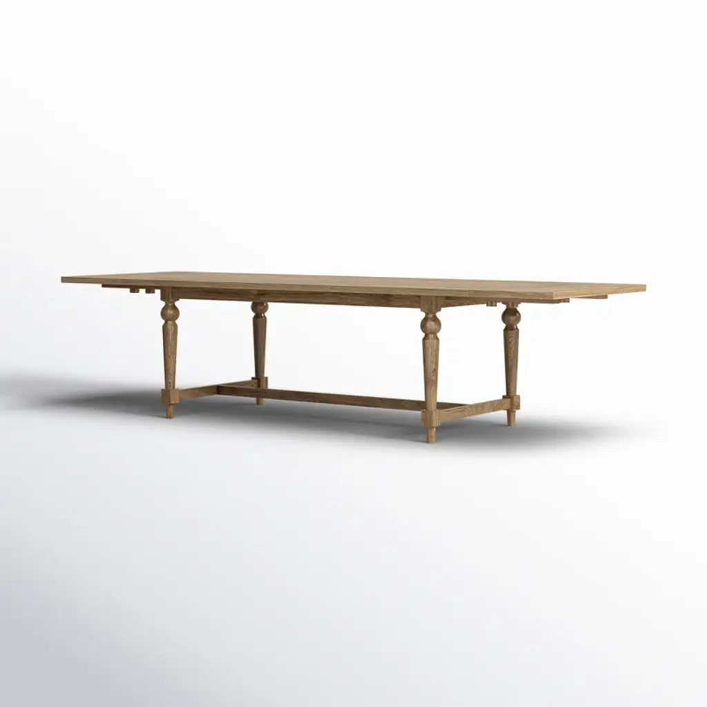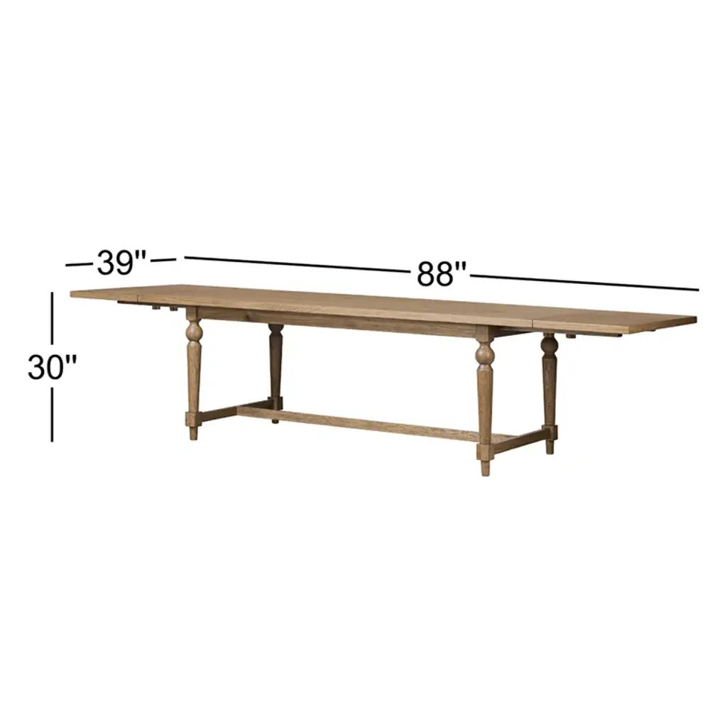 Bring a traditional look to the dining room for parties large or small. A turned, tapered base of solid oak support a rectangular tabletop of oak veneer, with a warm, worn finish. On both ends, breadboard extensions provide the option to expand to 124". Ships with screws for extension pieces.