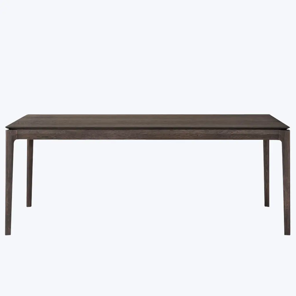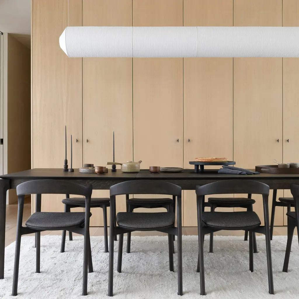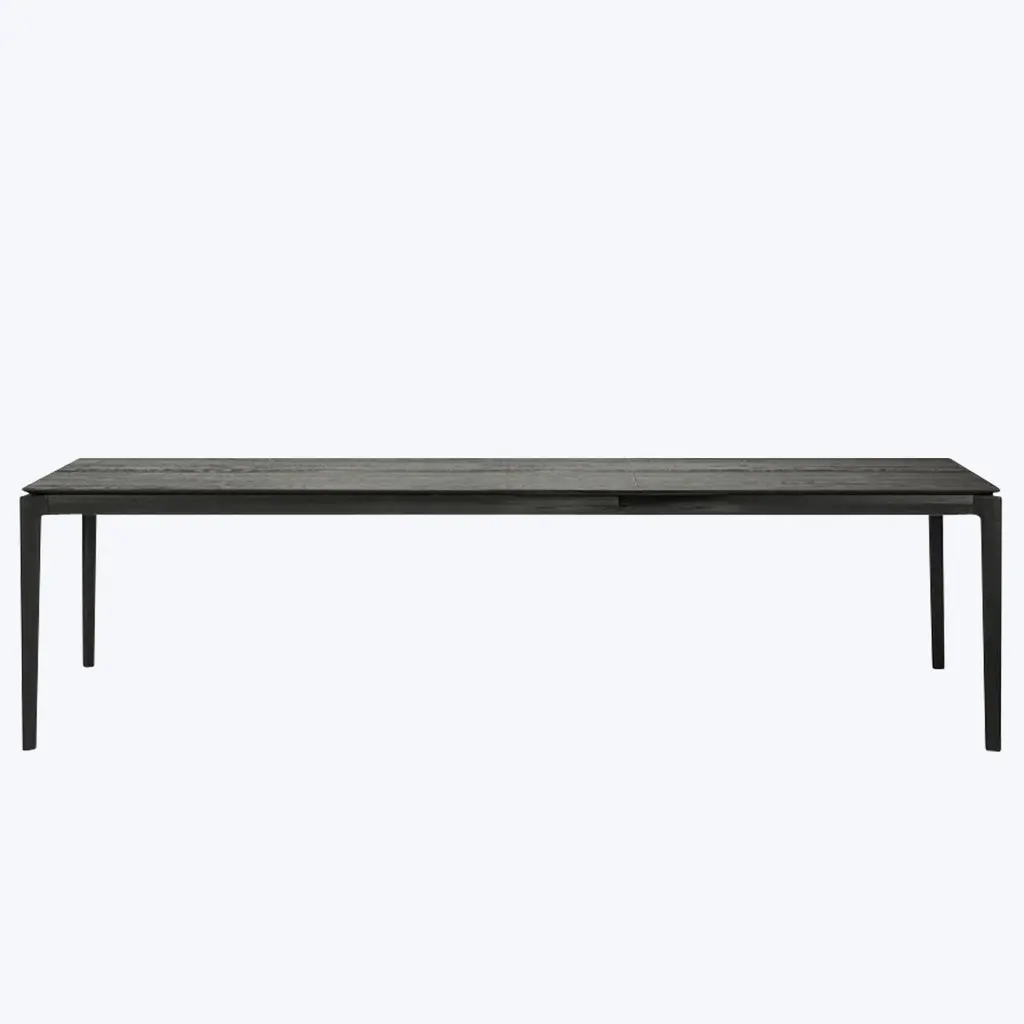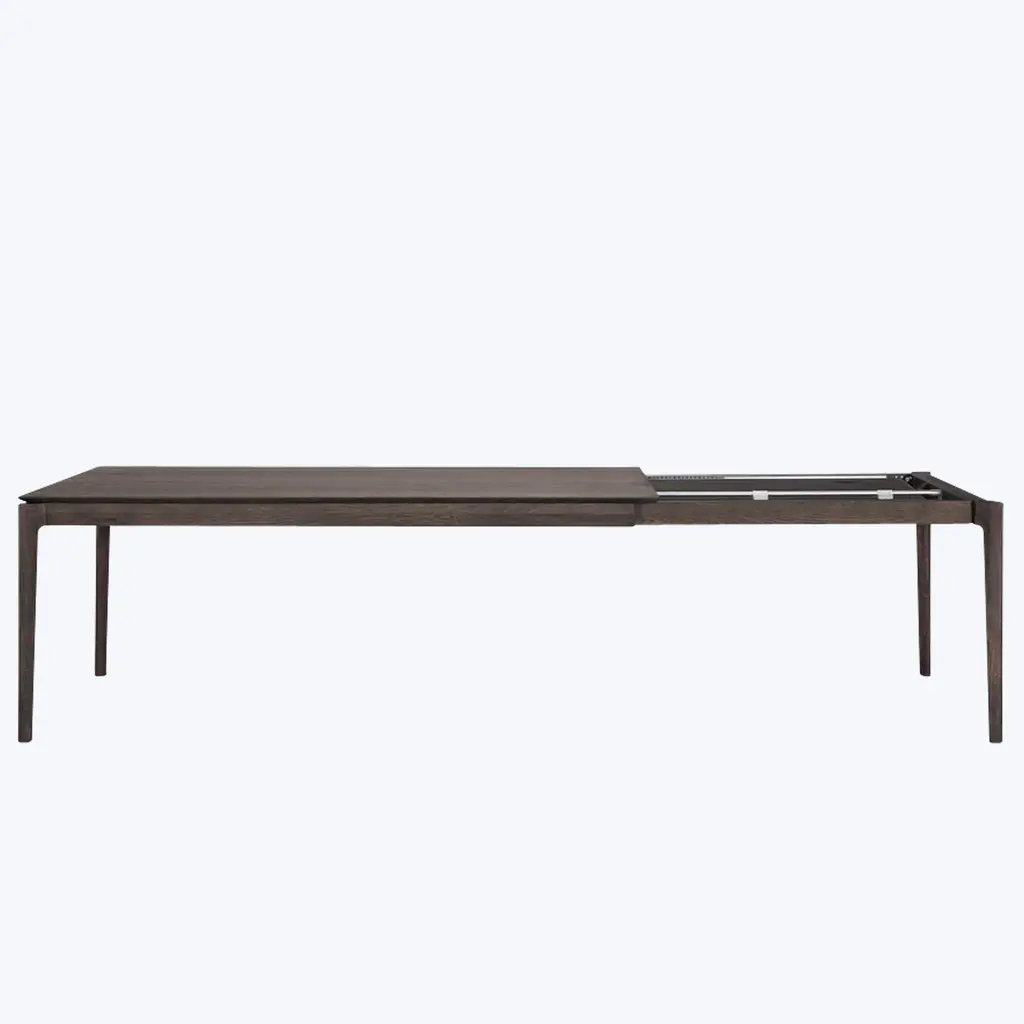 The Ethnicraft Bok Extendable Dining Table is a study in sculptural grace, where modern craftsmanship meets timeless design. A signature piece within the celebrated Bok collection, it carries an airy lightness that invites gathering, while its solid oak or teak construction offers a reassuring permanence. At once delicate and grounded, its lines speak of simplicity, yet its presence transforms a room with ease. Made to grow with the rhythms of life, the Bok extends smoothly and effortlessly, shifting from intimate suppers to long evenings filled with friends and family. The collection now offers four sizes, including the generous 79"L x 39.5"W design that opens to an expansive 118"L—ample enough to welcome twelve around its surface. Other sizes—55.5"L extending to 87", 63"L extending to 94.4", and 71"L extending to 110"—ensure that whether the moment is quiet or celebratory, there is always room at the table. Offered in three finishes, each tells its own story. The natural oak, protected with a pigmented hardwax oil, reveals the soul of the wood, its warmth deepening over time, gathering the marks of memory and use into a patina all its own. Black oak lends a bold, contemporary spirit, striking in its contrast, while brown oak offers a rich and grounding presence, timeless and assured. Beloved by our community at abc, the Bok Extendable Dining Table has become more than a place to dine. It is a space for conversation, for connection, for rituals small and grand. Sculptural, versatile, and enduring, it is a table designed to bring people together—and to keep them there, long after the meal has ended.