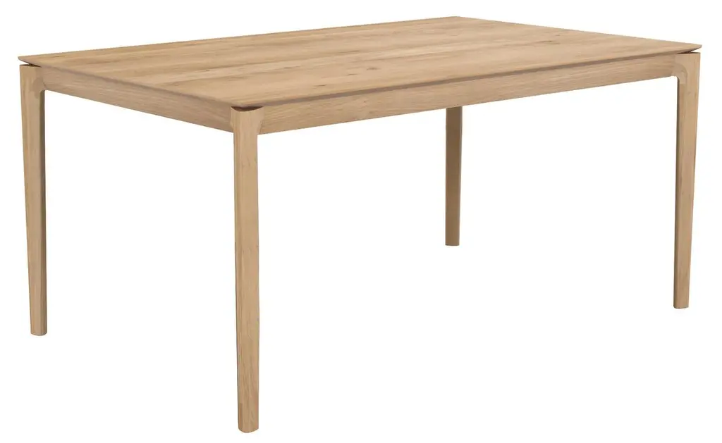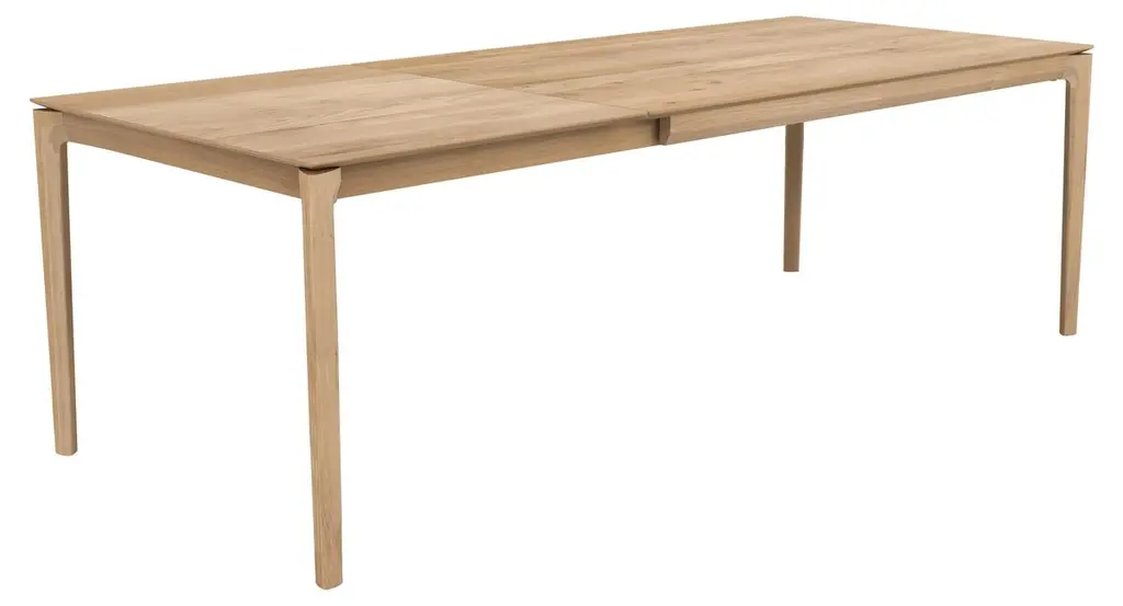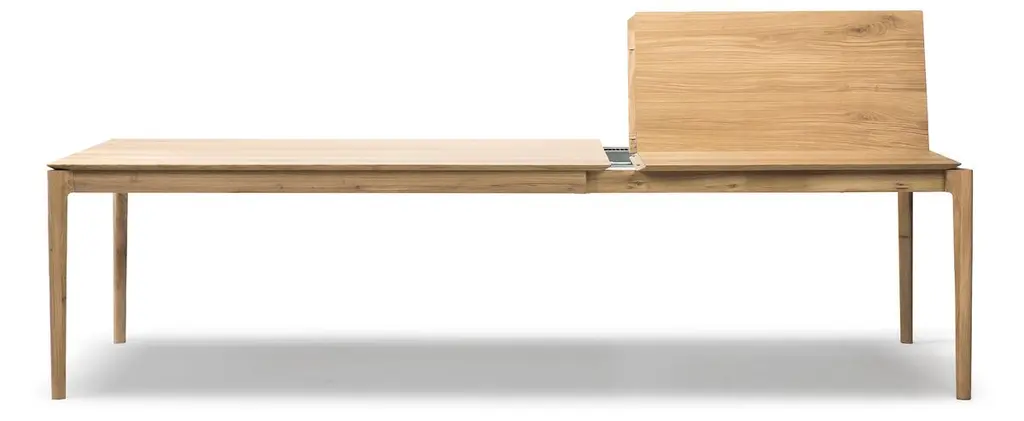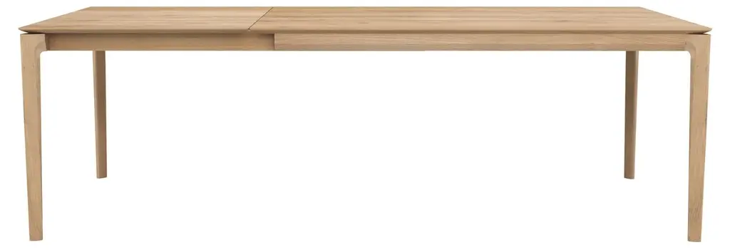 Crafted of solid oak, a hardwood known for its prominent grain and resistance to scratching and dust, this extension dining table features a thin top set on a sturdy base with subtly tapered legs. A hidden leaf folds out to accommodate additional guests.