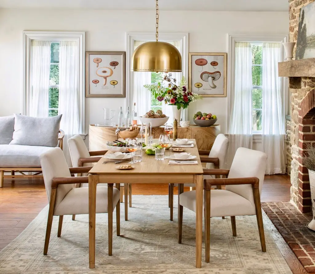 Crafted of solid oak, a hardwood known for its prominent grain and resistance to scratching and dust, this extension dining table features a thin top set on a sturdy base with subtly tapered legs. A hidden leaf folds out to accommodate additional guests.