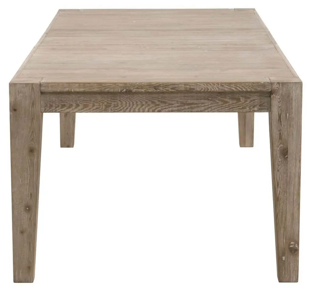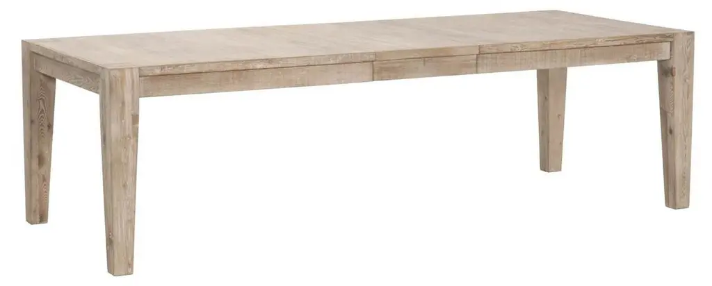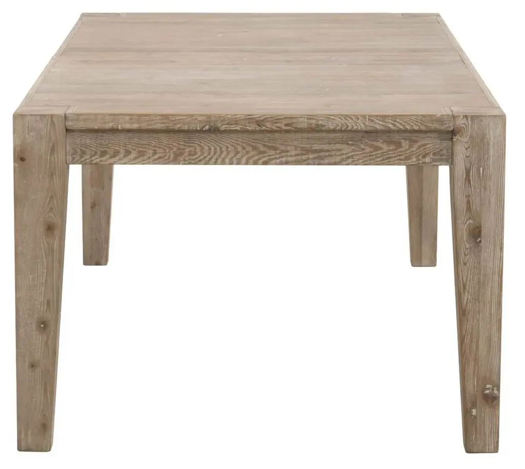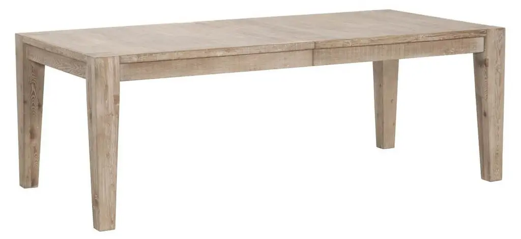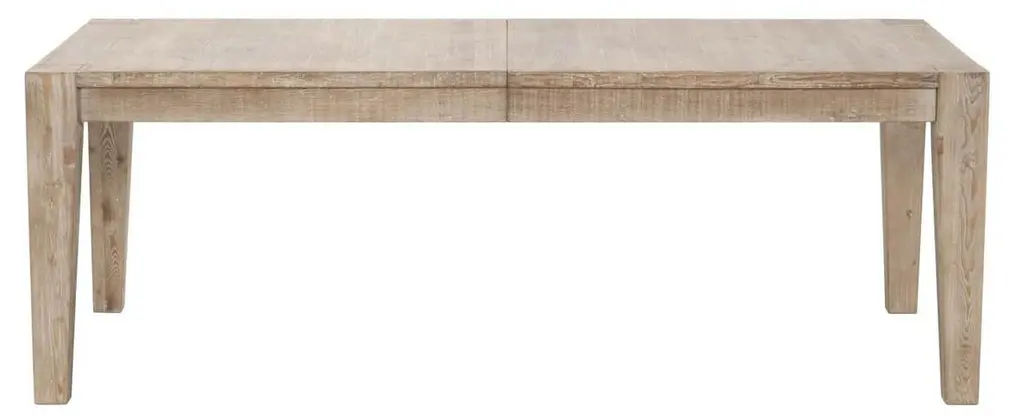 Crafted of pine, a shrink- and warp-resistant wood with a distinctive grain, this dining table features a simple form with an 18" center extension to accommodate up to ten guests.