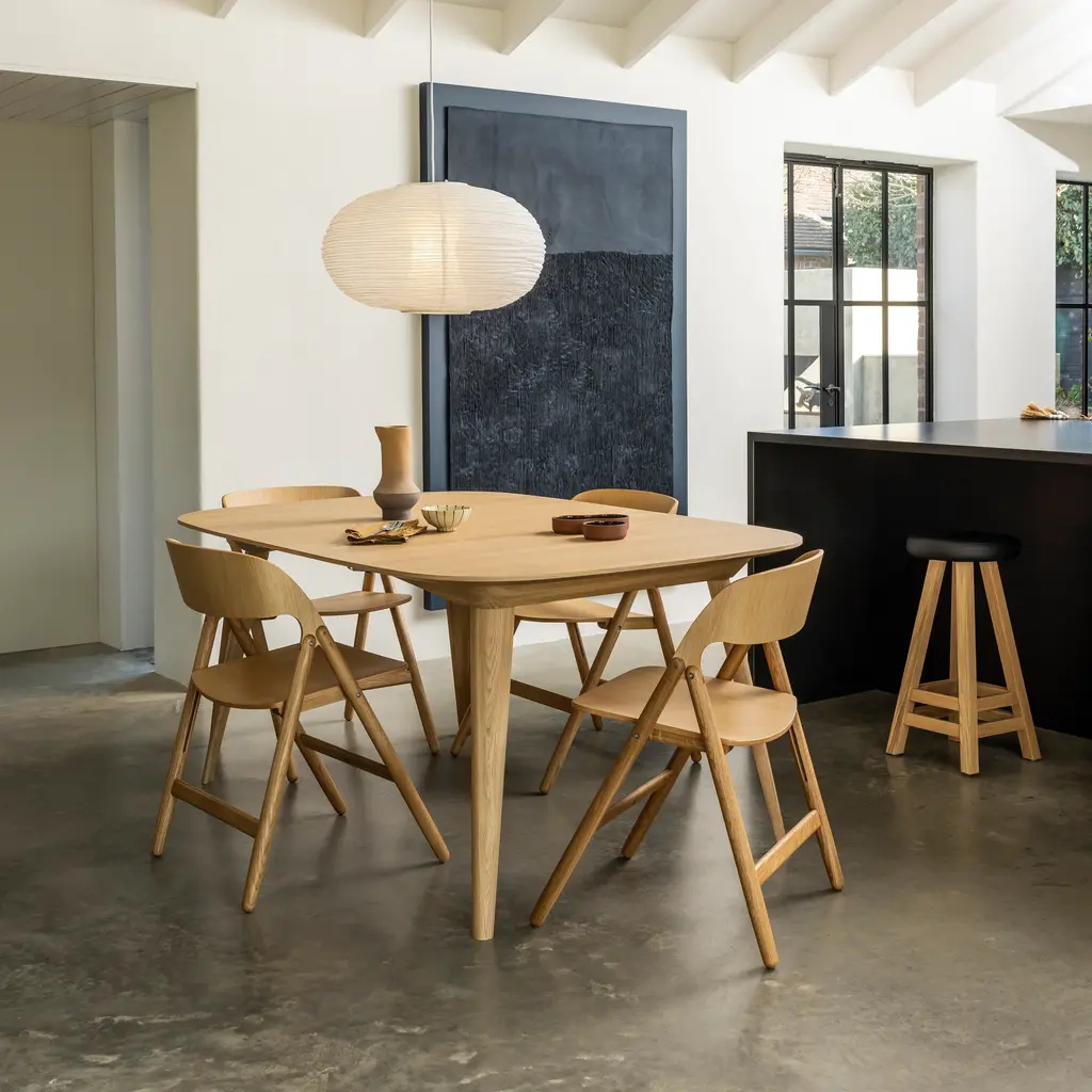 Award-winning designer Matthew Hilton’s gracefully minimalist Bridge Extension table features gently tapered legs in solid oak or walnut and a matching veneered tabletop. Offered in 2 sizes—to seat up to 6 persons at the smaller version and up to 10 at the larger—the table’s supporting frame arcs to allow the legs to face outwards, maximizing leg room underneath.