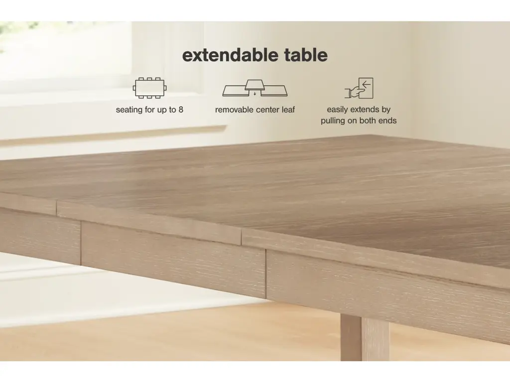 Satisfy your taste for casually cool simplicity with the Calmoro dining extension table. More than easy on the eyes, its gray wash finish with warm undertones is highlighted with a white glaze to enhance the wood grain texture. The timeless Parsons leg design exudes a relaxed aesthetic as you gather around the table. A removable leaf makes room for one and all.