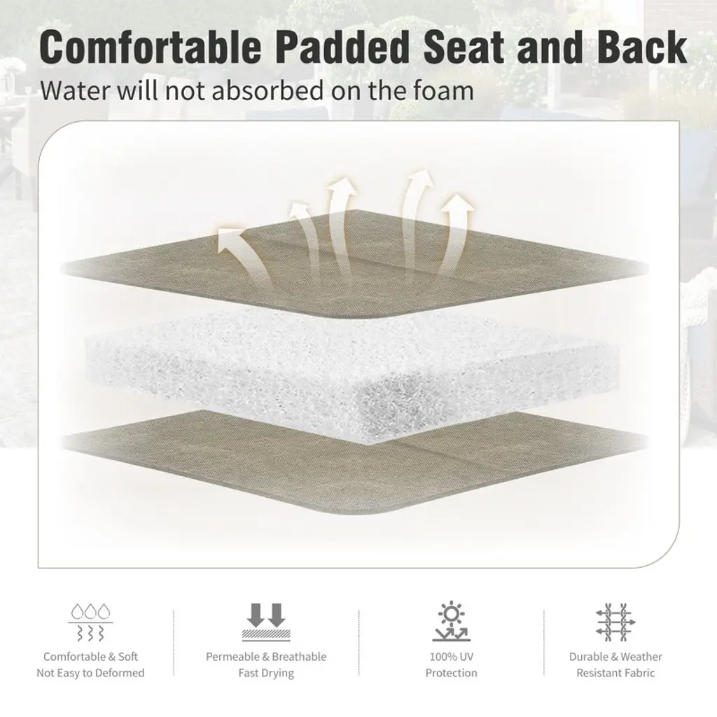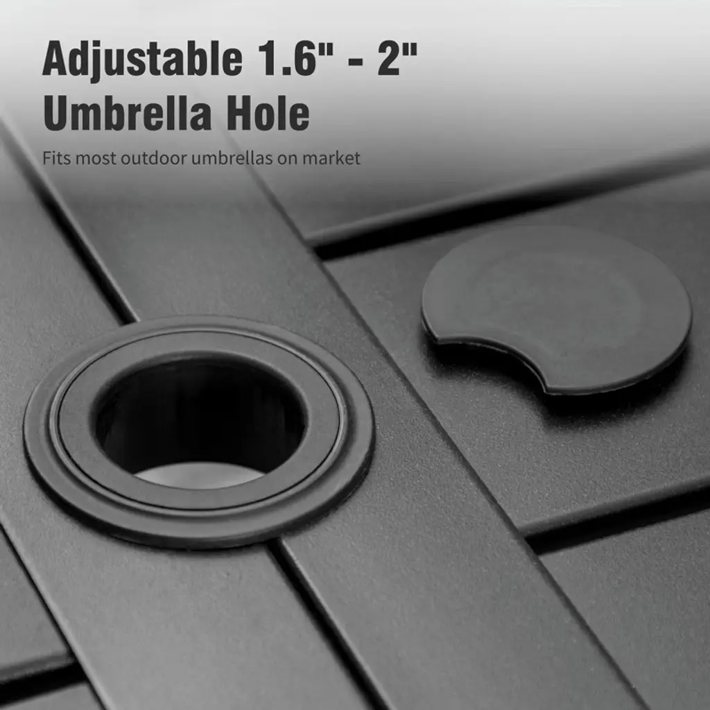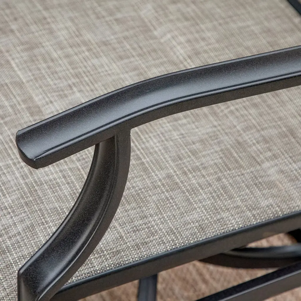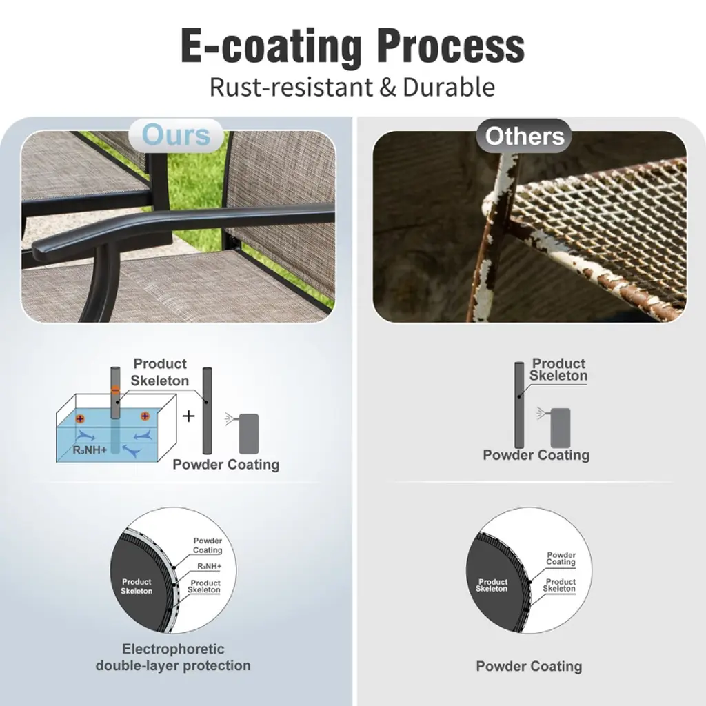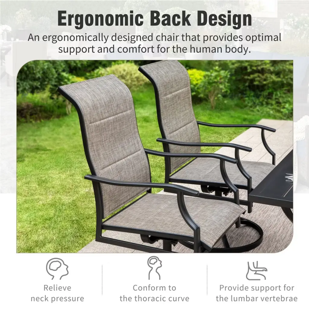 Enhance your outdoor dining experience with our Patio Dining Table. This Modern black rectangle table is crafted from E-coating and powder-coated metal frame. These 360-degree swivel chairs feature padded sling fabric for ultimate comfort, wave armrests for style and ergonomic support, and a sturdy triangle base with three steel bottom brackets. This durable set seamlessly blends style, function and durability, making it the perfect choice for your outdoor dining needs. Enjoy stylish and comfortable gatherings with this versatile dining set!