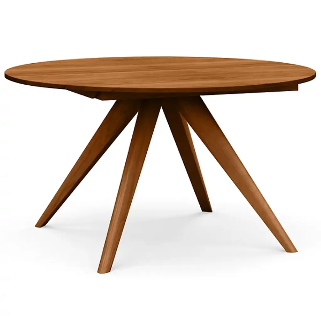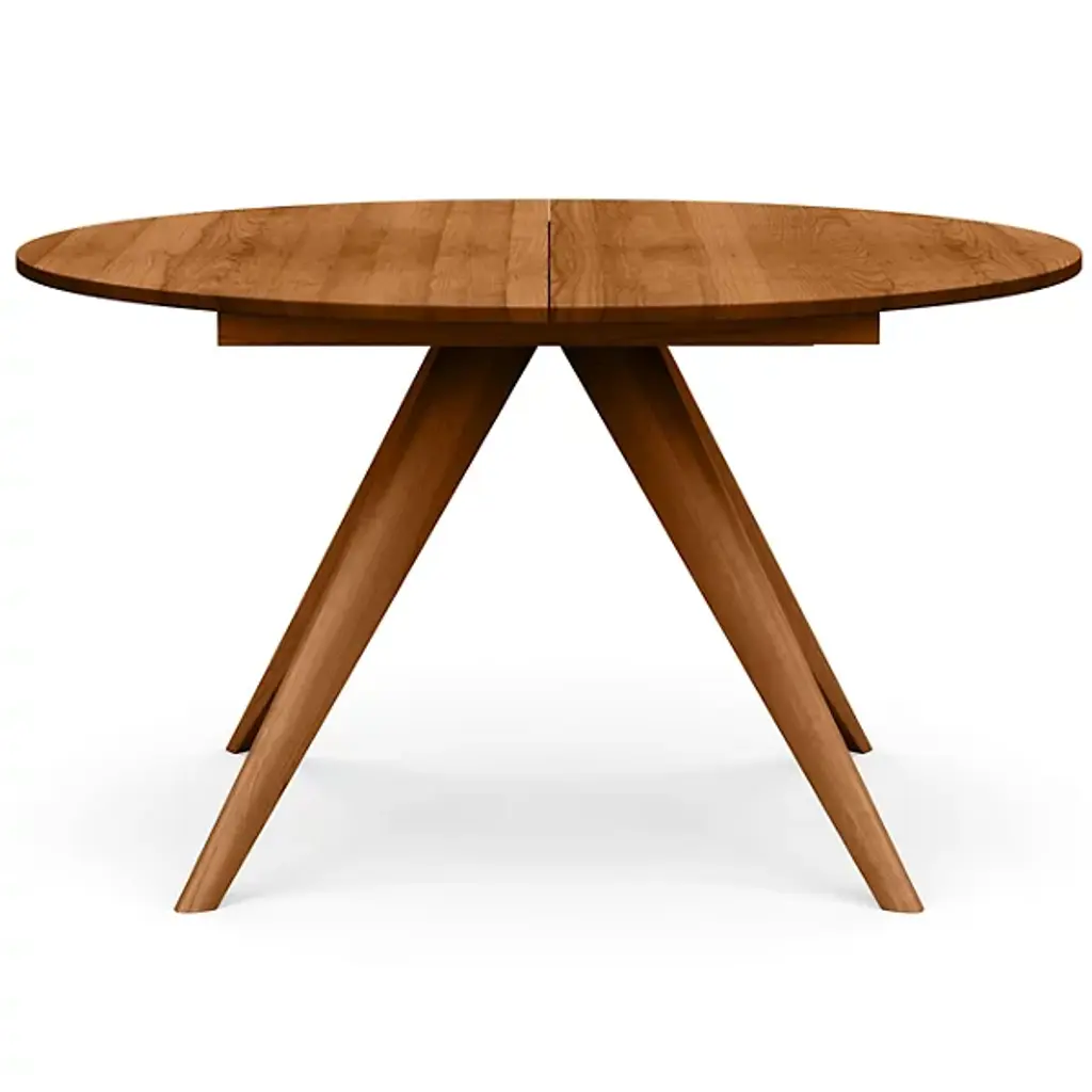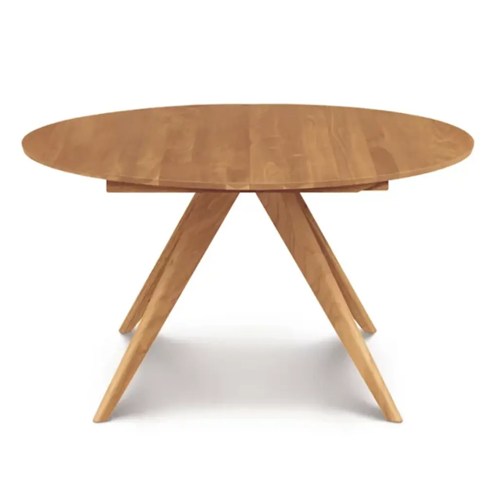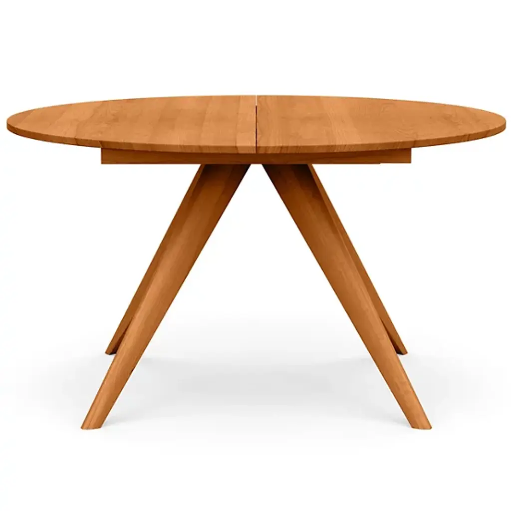 Cool mid-century style, now with curves. The Copeland Furniture Catalina Round Extension Table features a round surface atop deeply splayed legs, which provide superior balance regardless of whether the table's extended or retracted. The single self-storing butterfly leaf and self-equalizing ball bearing glides allow for smooth and easy single-handed operation.