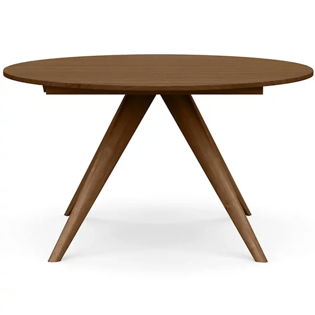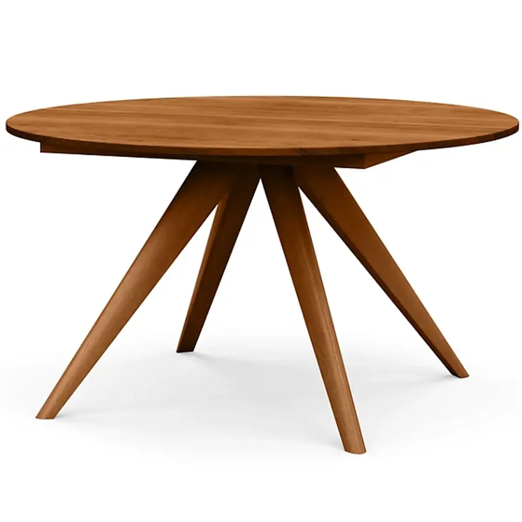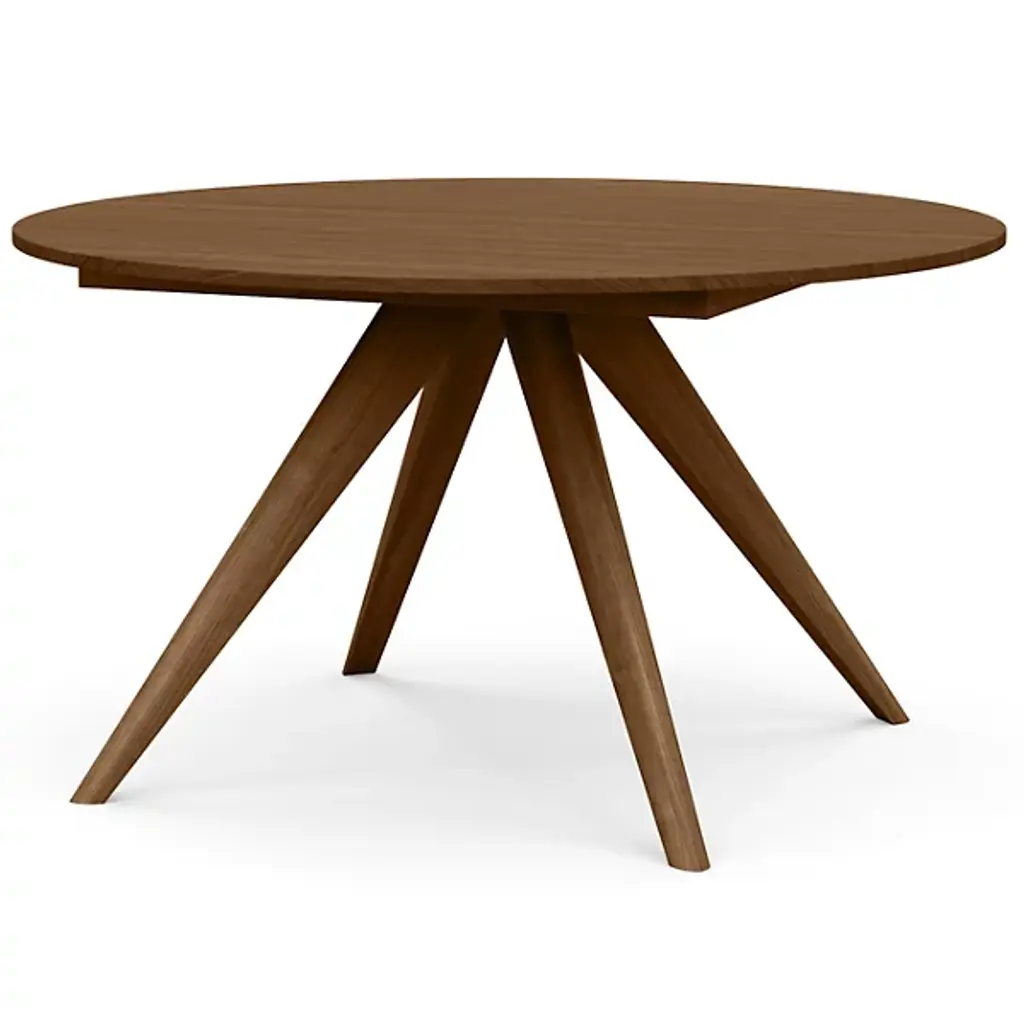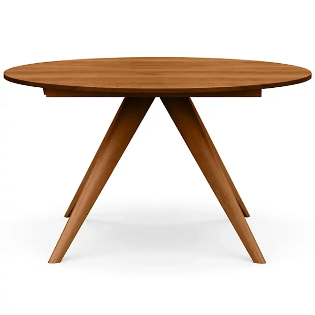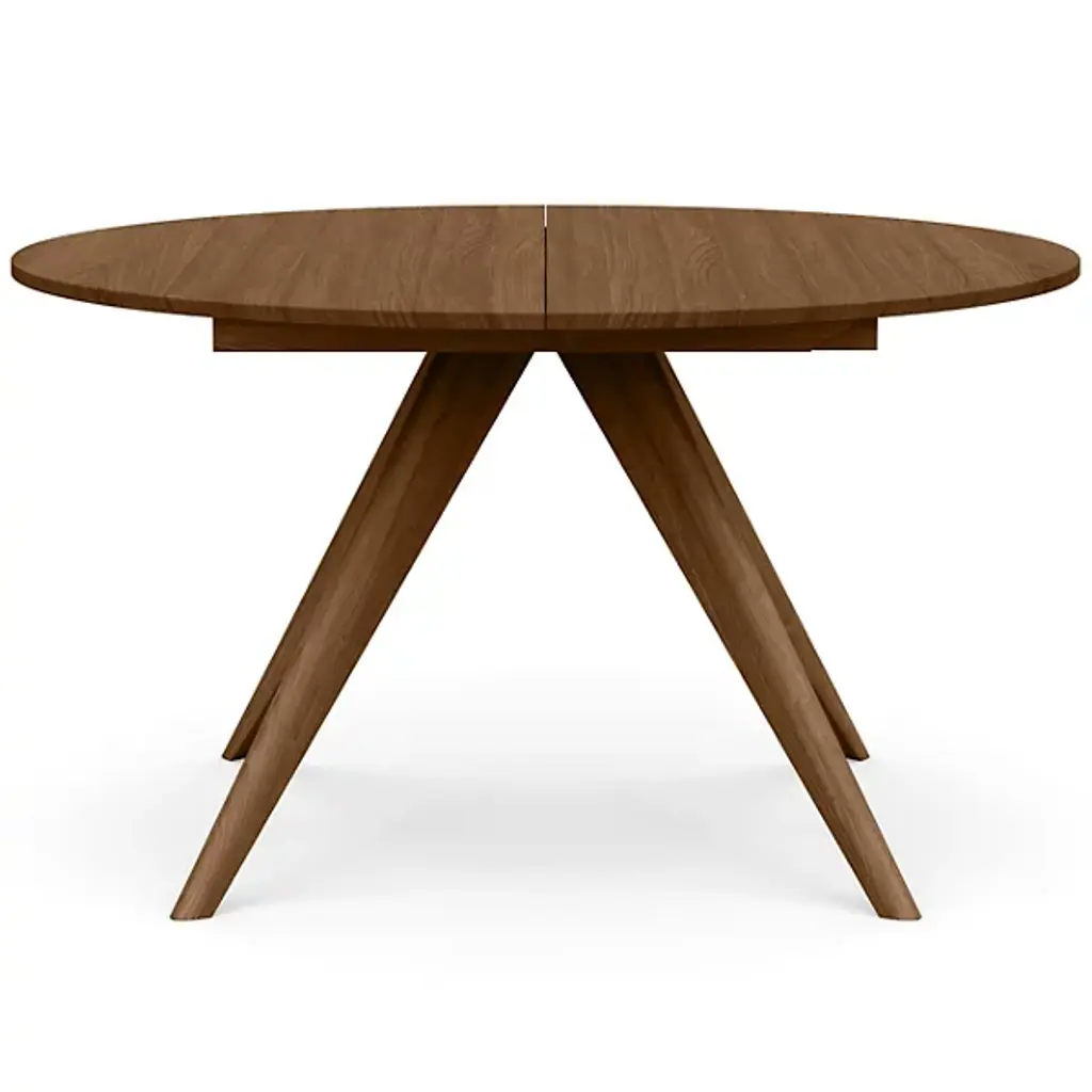 Cool mid-century style, now with curves. The Copeland Furniture Catalina Round Extension Table features a round surface atop deeply splayed legs, which provide superior balance regardless of whether the table's extended or retracted. The single self-storing butterfly leaf and self-equalizing ball bearing glides allow for smooth and easy single-handed operation.