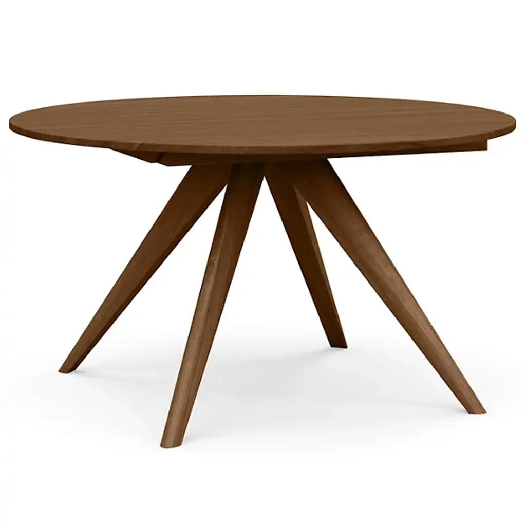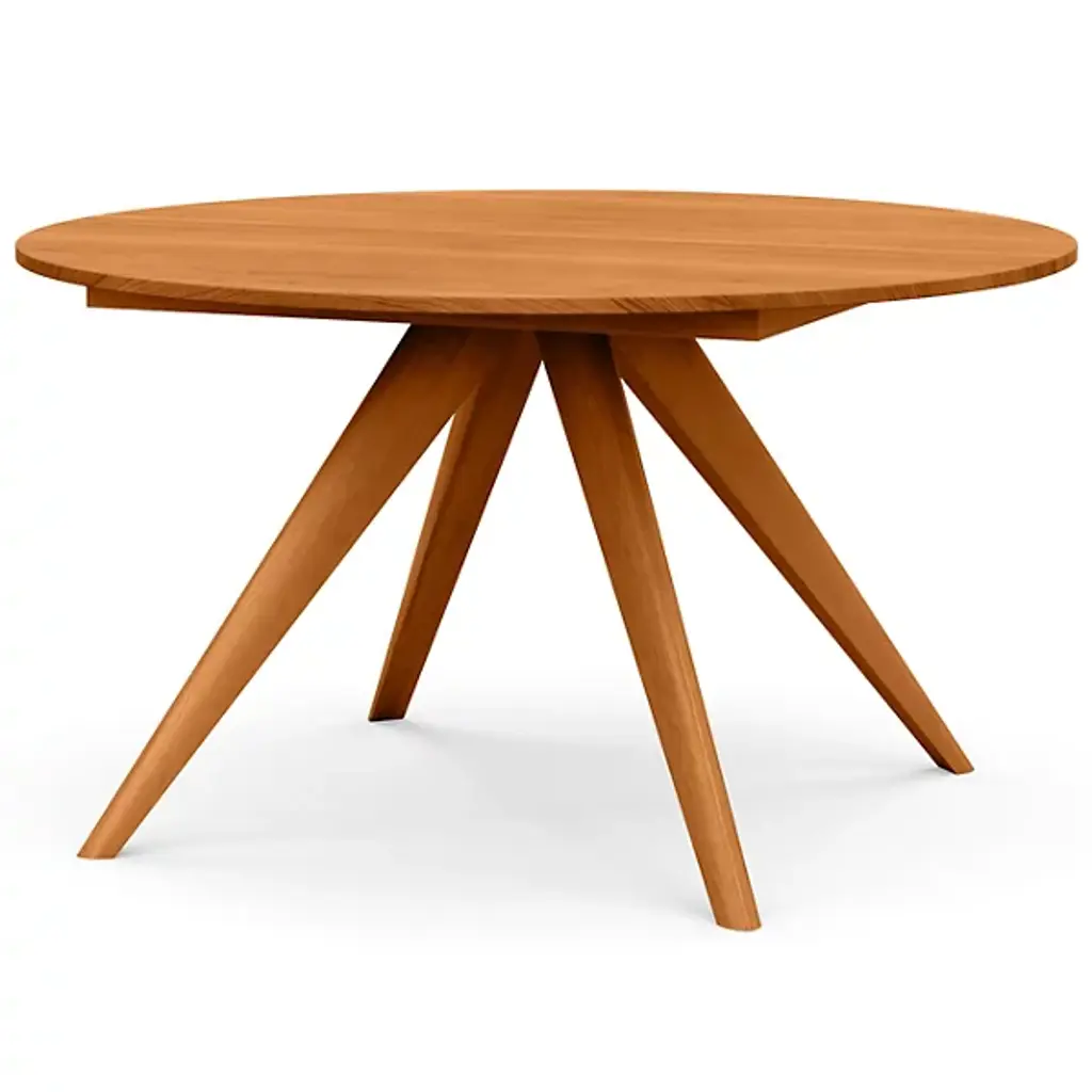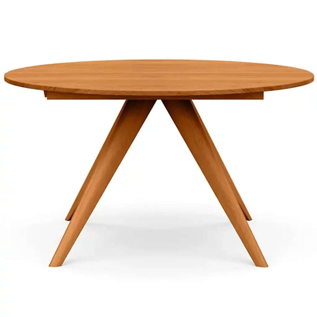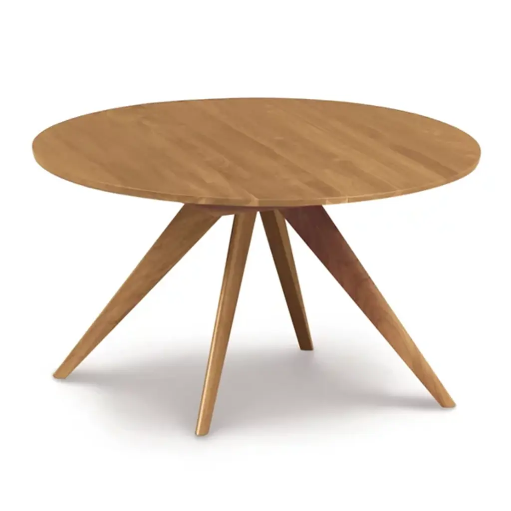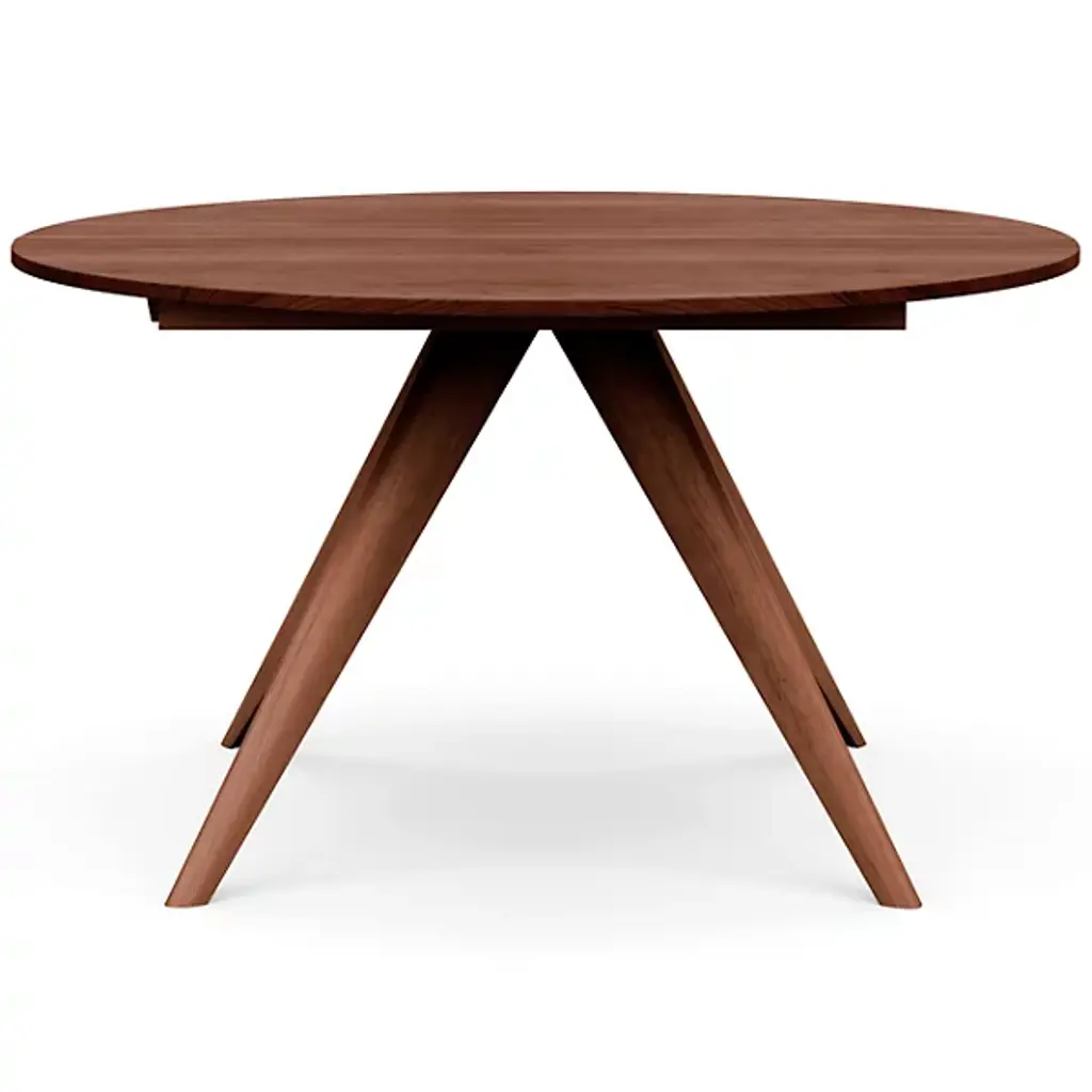 Cool mid-century style, now with curves. The Copeland Furniture Catalina Round Extension Table features a round surface atop deeply splayed legs, which provide superior balance regardless of whether the table's extended or retracted. The single self-storing butterfly leaf and self-equalizing ball bearing glides allow for smooth and easy single-handed operation.