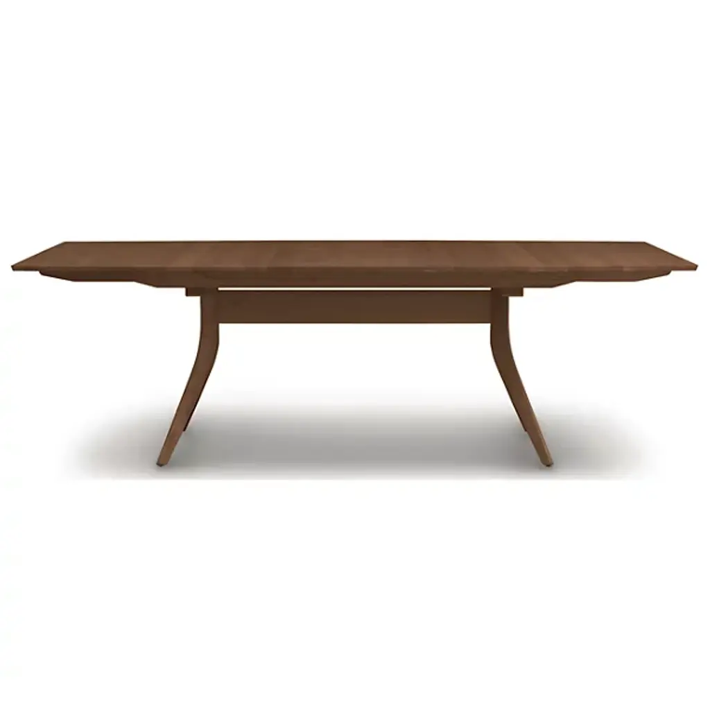 An inventive sort of elegance. The Copeland Furniture Catalina Trestle Extension Table has a number of traditional features, but those are all blended into an intricate and innovative design. The Solid Hardwood frame contains an assortment of carefully constructed pieces, each one cut, treated and assembled in Vermont. While the table presents natural materials and an elegant, rustic aesthetic, the piece also brings exceptional functionality with a self-storing butterfly leaf for easy extension. The compact base maximizes seating space without detracting from the unit’s appealing adaptability. Perfect for seating a family of 4 or extending for a dinner party, this table will enhance the style and seating arrangement in your dining room or kitchen.