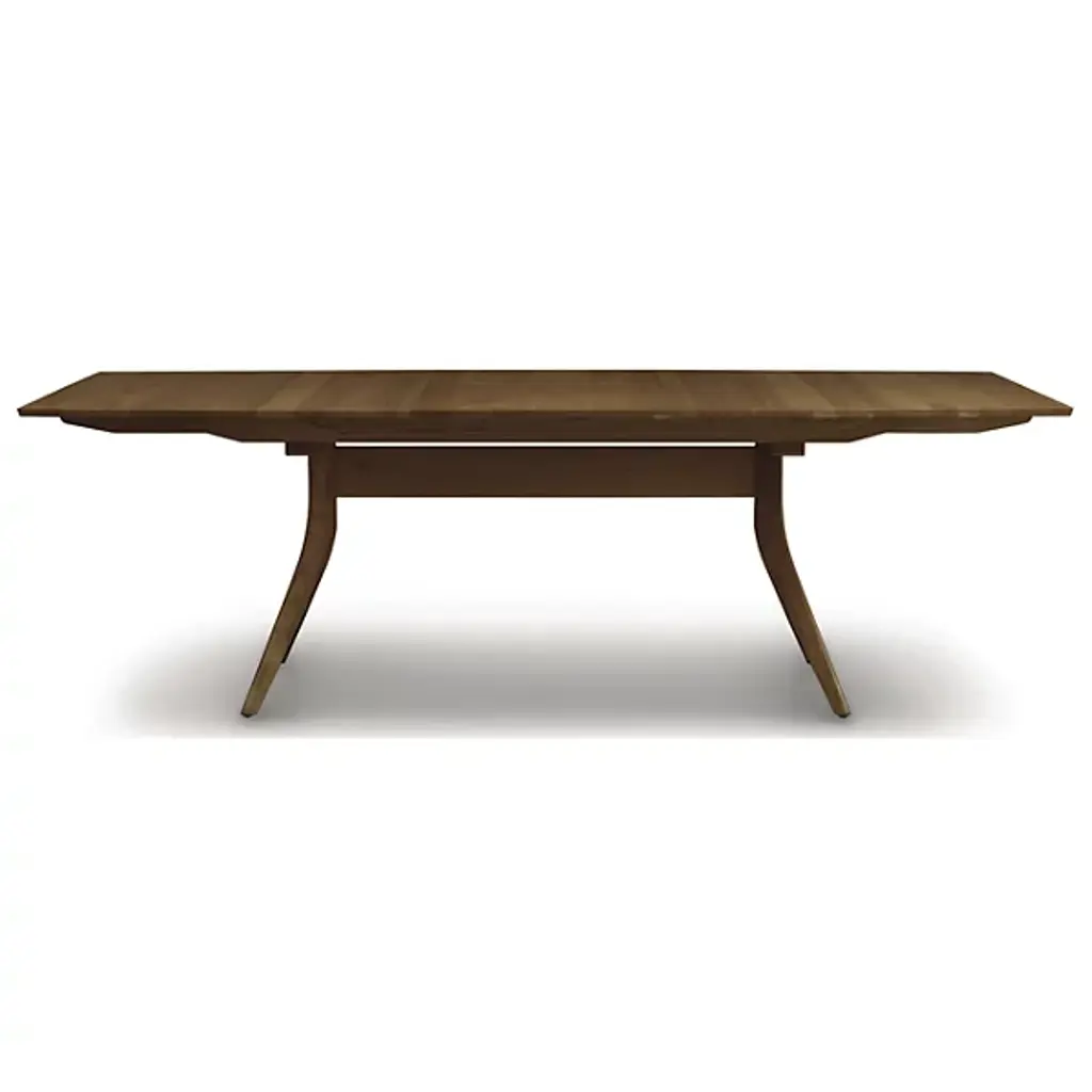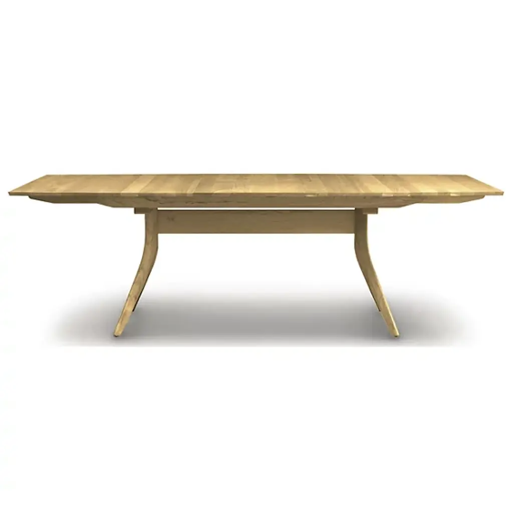 An inventive sort of elegance. The Copeland Furniture Catalina Trestle Extension Table has a number of traditional features, but those are all blended into an intricate and innovative design. The Solid Hardwood frame contains an assortment of carefully constructed pieces, each one cut, treated and assembled in Vermont. While the table presents natural materials and an elegant, rustic aesthetic, the piece also brings exceptional functionality with a self-storing butterfly leaf for easy extension. The compact base maximizes seating space without detracting from the unit’s appealing adaptability. Perfect for seating a family of 4 or extending for a dinner party, this table will enhance the style and seating arrangement in your dining room or kitchen.