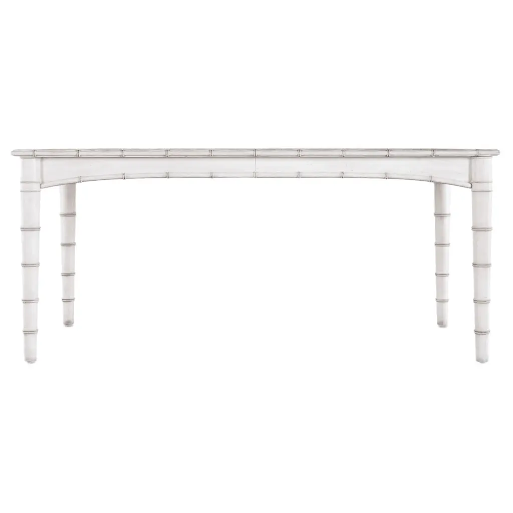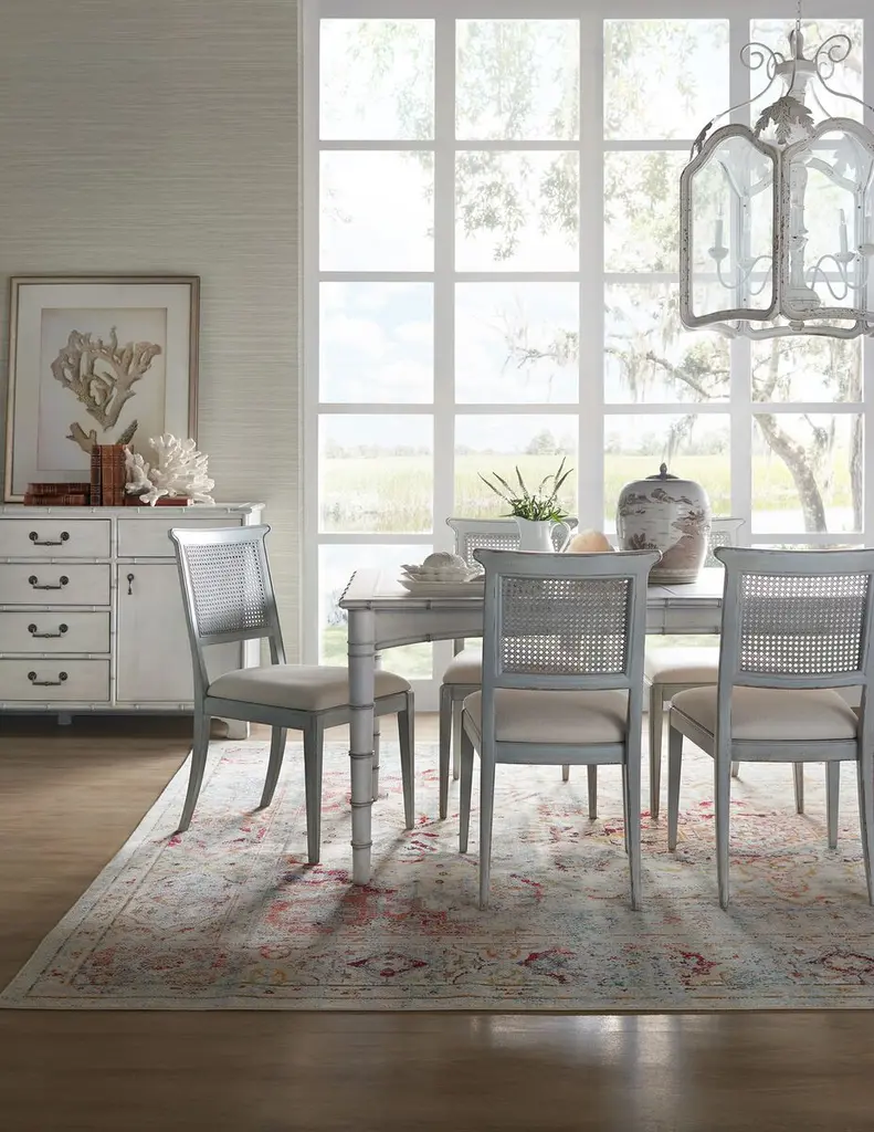 Capturing the vintage charm of the coastal South and the tropical craftsmanship of the West Indies, the Charleston Rectangle Dining Table features bamboo-motif accents and slender bamboo-style legs. The wood table has a Solid Wood Edge Top, delivering an heirloom-quality finish. With one 20-inch leaf in place, the table extends to 88 inches long. The table accommodates 4 side chairs and two arm chairs without the leaf and 6 side chairs and two arm chairs with the leaf.