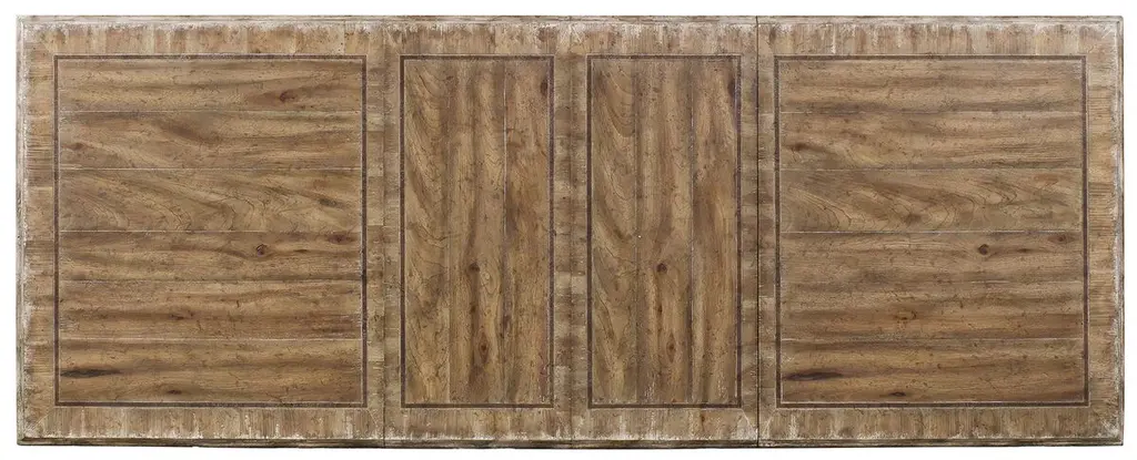 Enjoy a luxurious but casual dining experience with this elegant leg dining table inspired by timeless farm style antiques. Two 18-inch leaves extend the table to 108 inches to seat up to eight guests. Crafted of Poplar and Hardwood Solids with Pecan, Walnut and Maple Veneers with a solid wood edge.