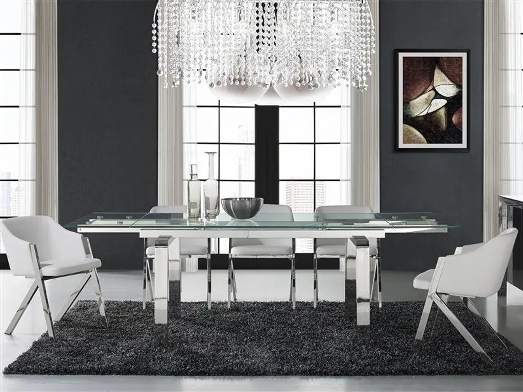 The Claudia Extendable Stainless Steel Dining Table features clean and modern lines adding a sophisticated look and modern edge to any room. Materials Stainless Steel / Glass , quality that is made to last.