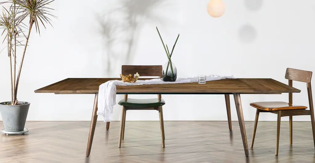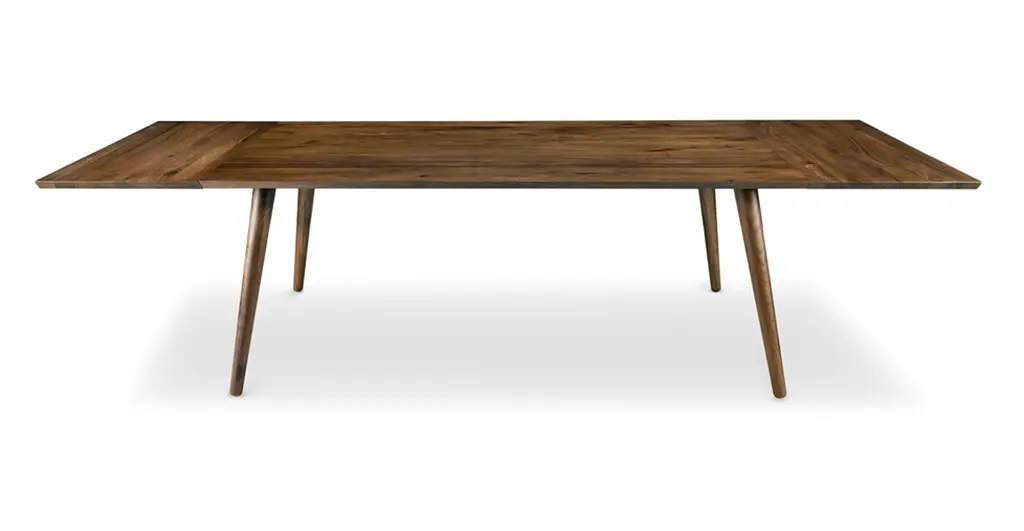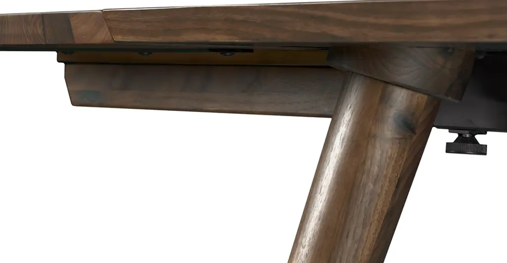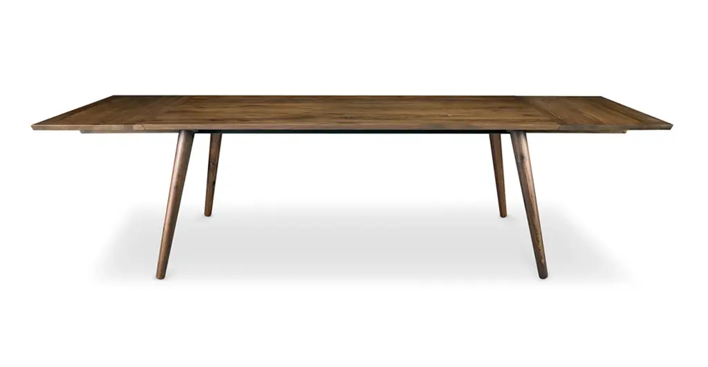Dinner parties and big family breakfasts serve up inviting ambiance with this retro-influenced yet contemporary dining table featuring attachable extension leaves at each end for guests. (FYI - extension leaves store separately). Crafted from solid American black walnut or solid American white oak wood that highlights a rich natural grain, it boasts crisp lines and eye-catching angles. Rounded tapered legs splay slightly to provide sturdiness and create ample room for 10 dining chairs to fit comfortably and 12 in a pinch, lending spacious appeal to every gathering.