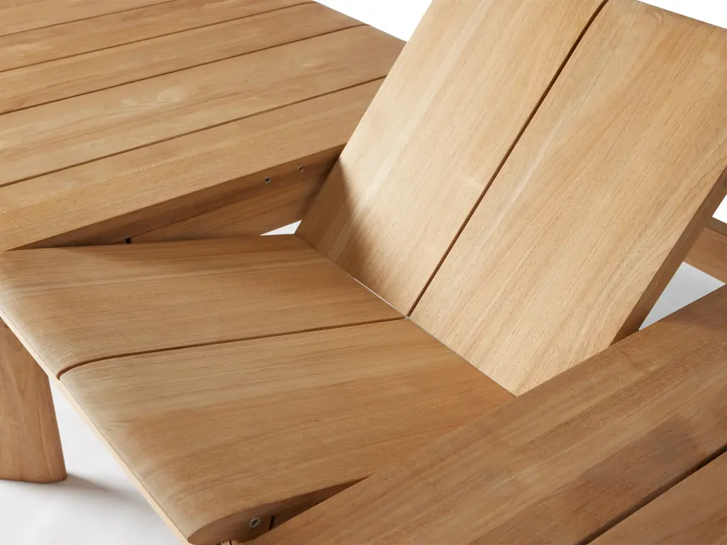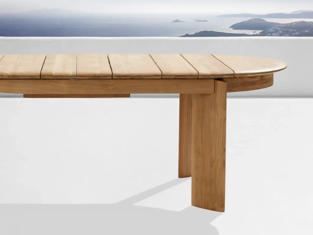 Inspired by European flair, our sleek Corfu Collection is crafted in wide planks of sustainably sourced natural teak, with striking, angular legs. A balanced blend of curves and angles, Corfu’s expansive silhouette offers more than enough space for every gathering.