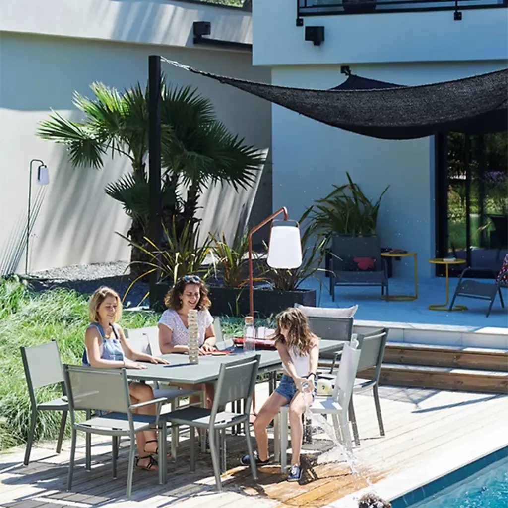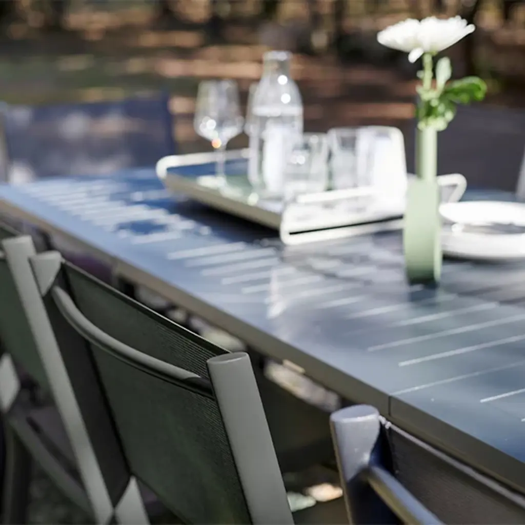 The Fermob Costa Extension Table combines practicality with clean, crisp lines. The sleek, versatile design of this aluminum table is made even more versatile with a central extension that increases the capacity from six to ten people. When not in use, the extension folds away seamlessly and discretely into the table structure underneath.