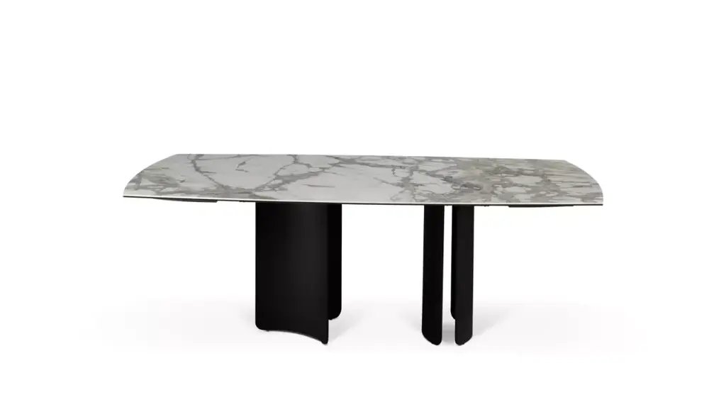 Designed by Maurizio Manzoni, the Deltalis table draws an elegant line through space. With or without extensions, its oblong ceramic top, both luminous and durable, reflects light and brings a sophisticated presence. The steel base, with its symmetrical and airy lines, combines stability and fluidity, forming a silhouette where form elevates function.