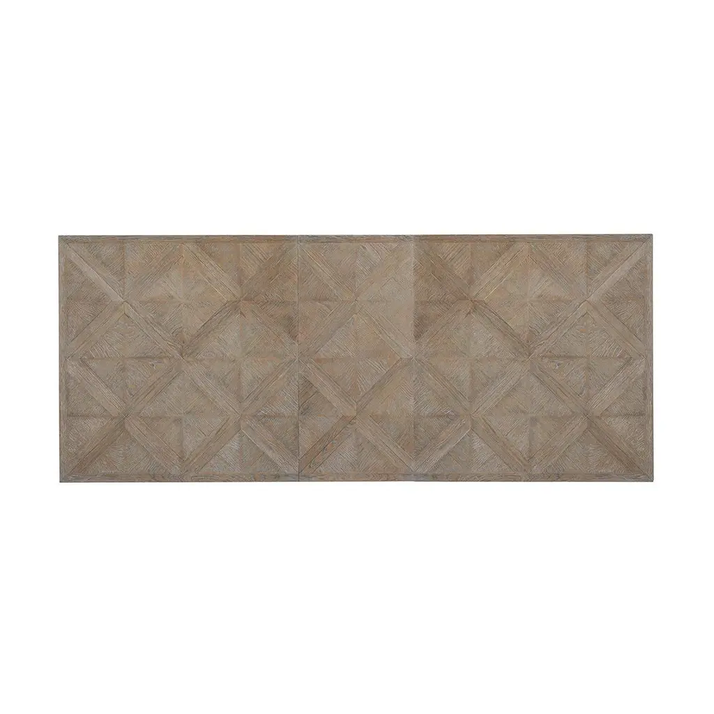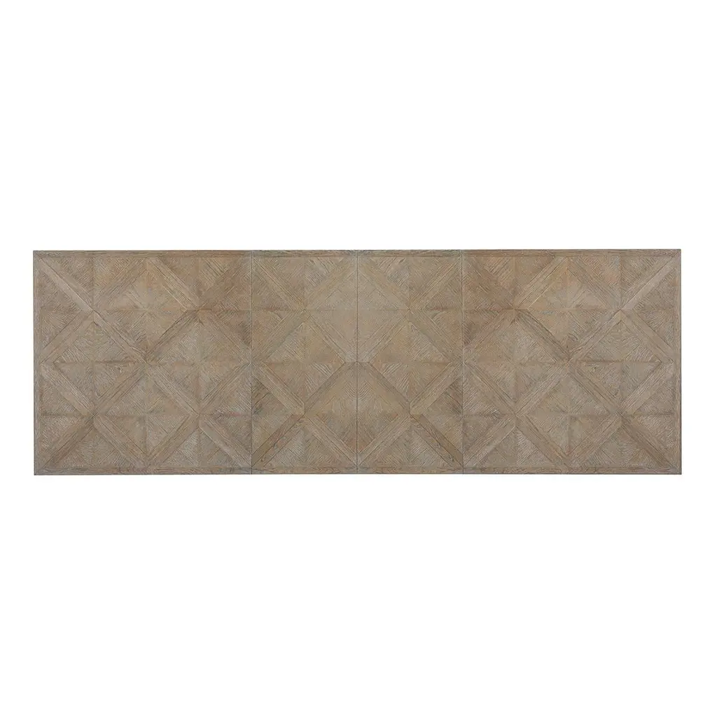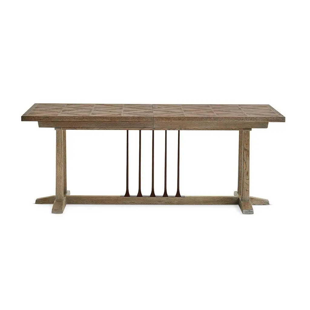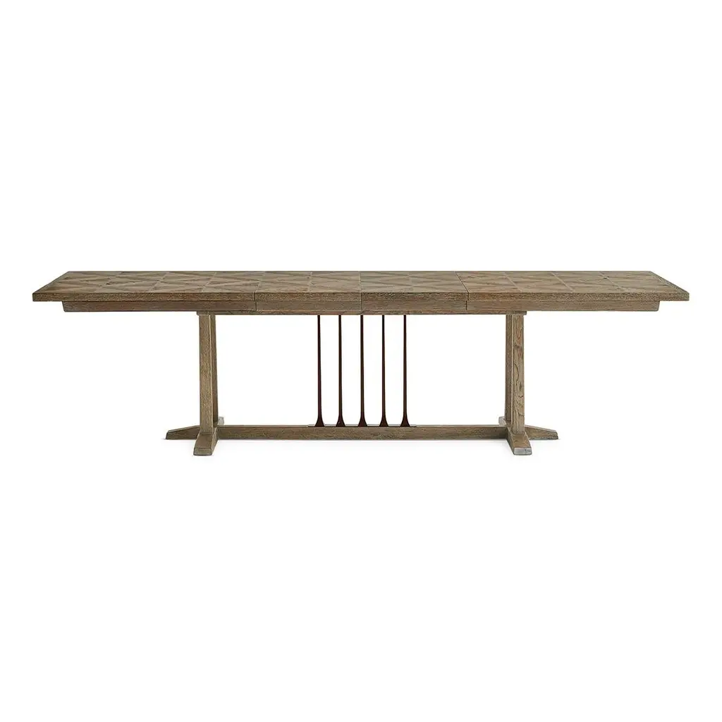 Its diamond tabletop features a wire-brushed finish in Ash Driftwood. Candlestick metal legs at the center lend a traditional element in a rich Chocolate Bronze finish. Its expert craftsmanship mixes casual finishes and textures with classic design elements for a timeless style to last through generations. It can comfortably seat up to 14.DIMENSIONSClosed: 114.5" W x 40" D x 29.5" HOpen: 77.25" W x 40" D x 29.5" HIncludes two 18.625" leaves with equalizing slides for stability.