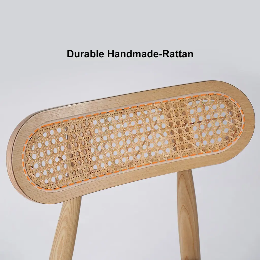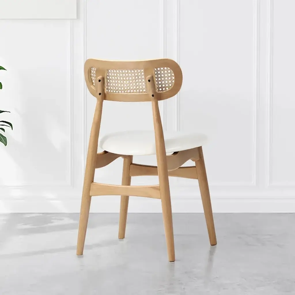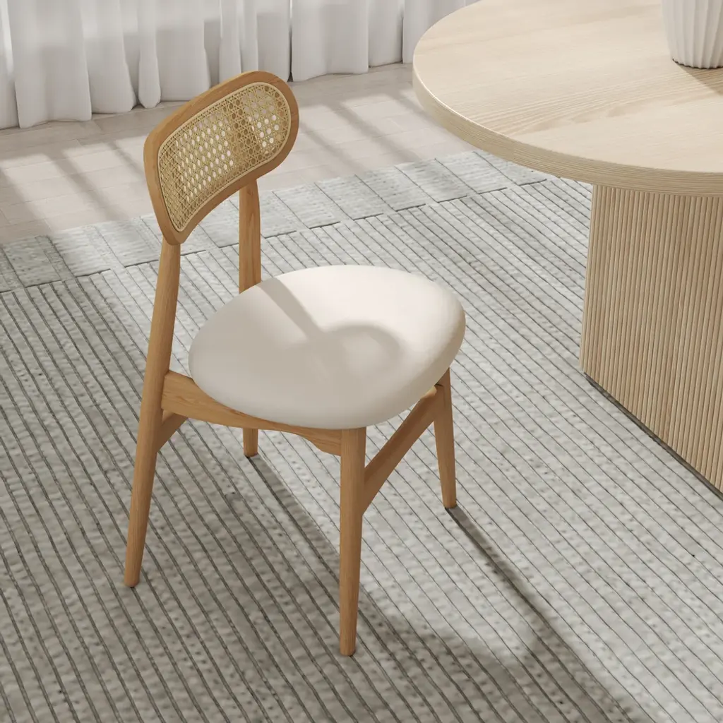 This Japandi Dining Chair combines wood with faux leather upholstery and rattan accents, referencing the traditional in modern nuance. It has a sturdy ash wood frame that imparts strength to the curved design at the back, lending elegance and more support.