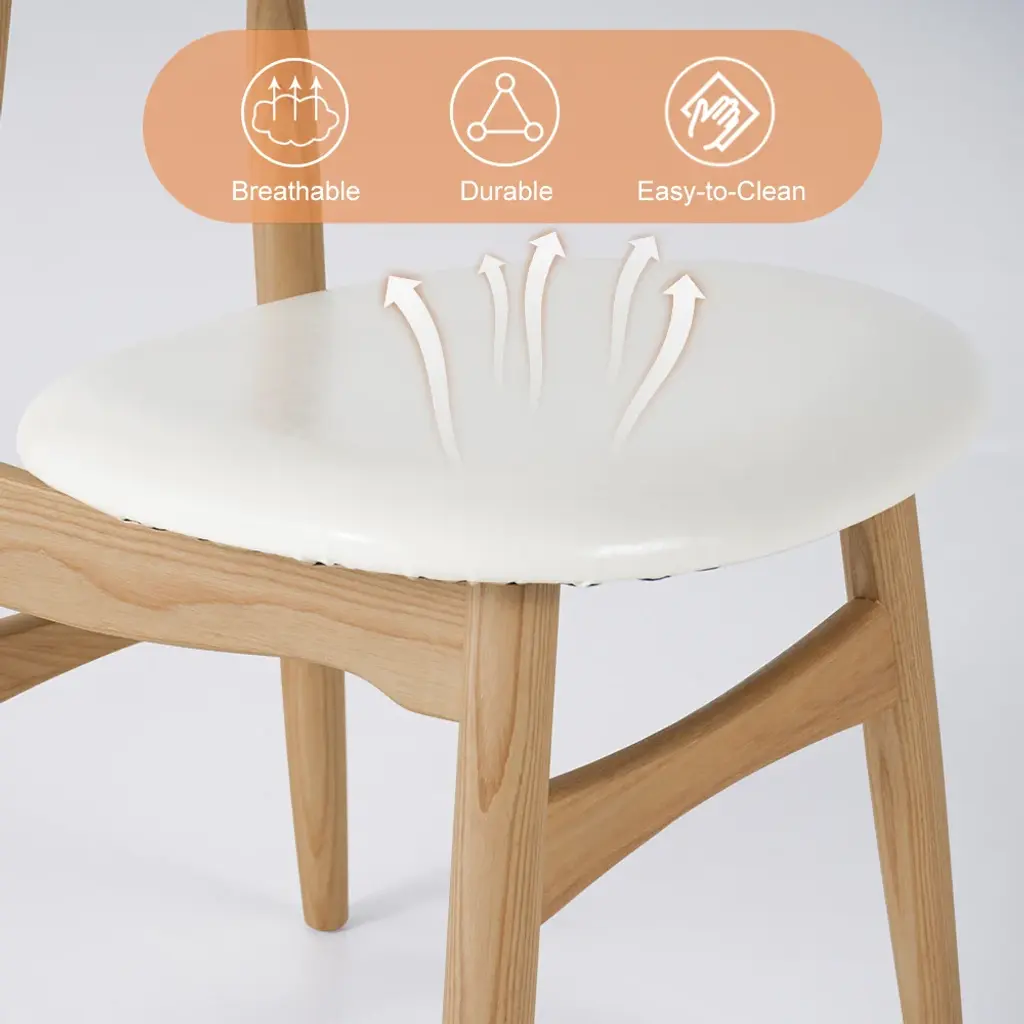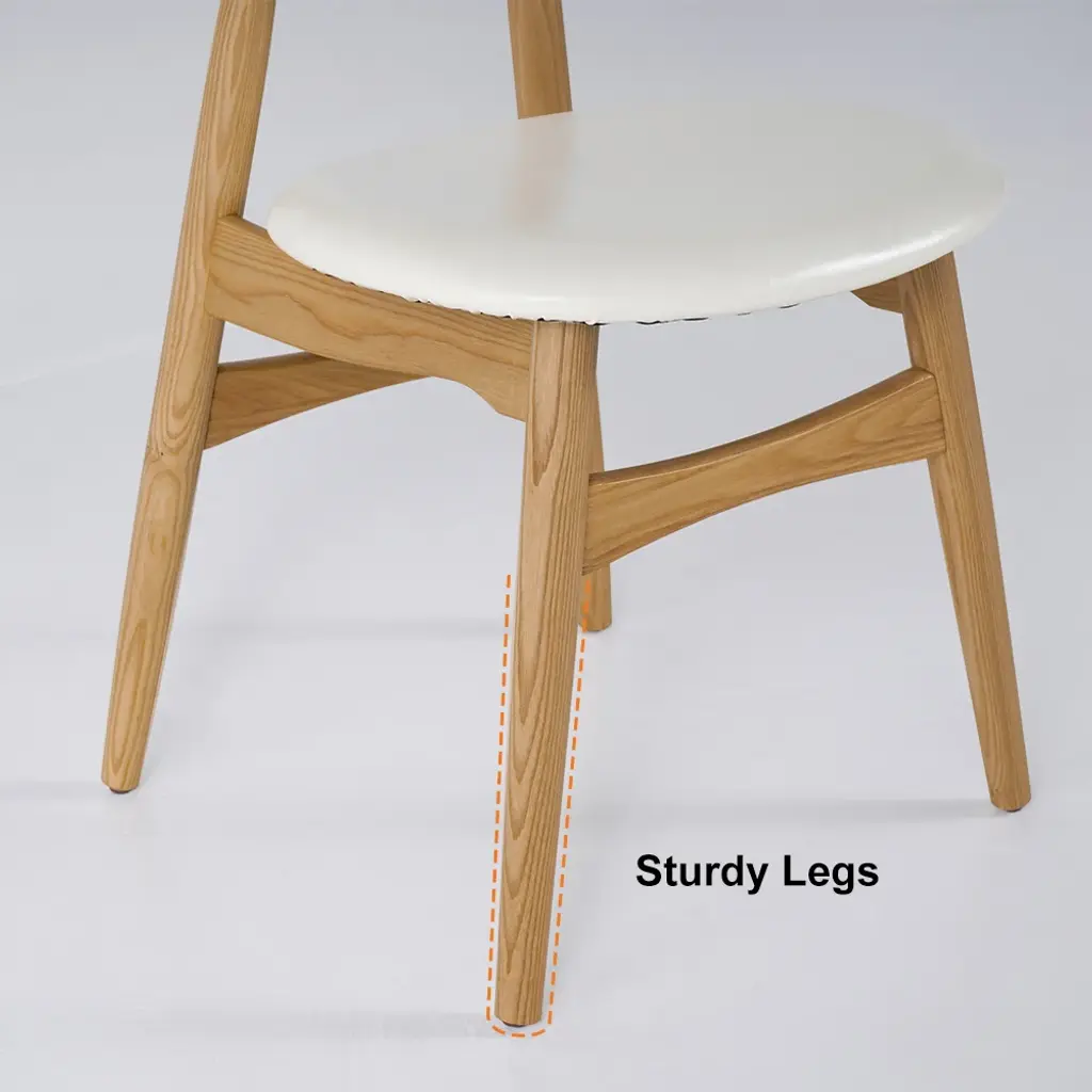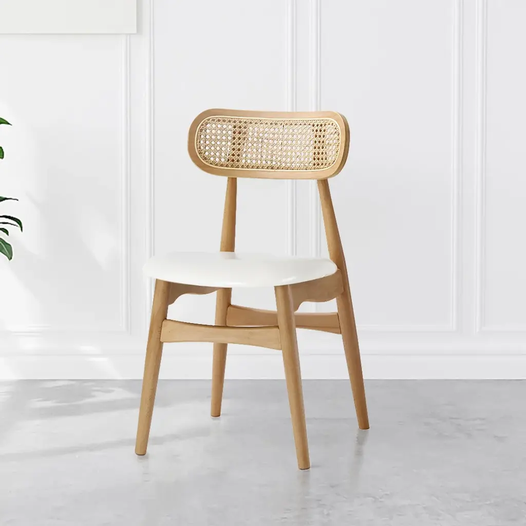 This Japandi Dining Chair combines wood with faux leather upholstery and rattan accents, referencing the traditional in modern nuance. It has a sturdy ash wood frame that imparts strength to the curved design at the back, lending elegance and more support.