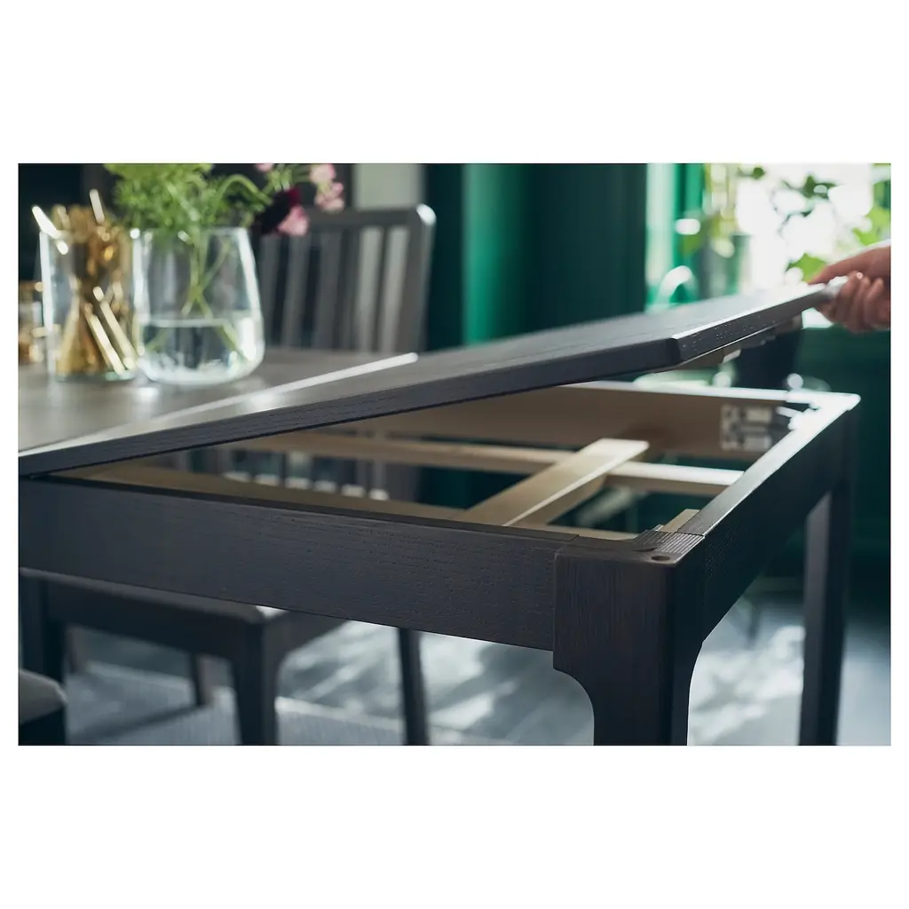 EKEDALEN Extendable table - dark brown 47 1/4/70 7/8x31 1/2 ". With comfortable seating for 6 people, this spacious table is perfect for various-sized families. Solid wood underframe makes the construction very sturdy. One person can quickly and smoothly extend the table before the guests arrive.