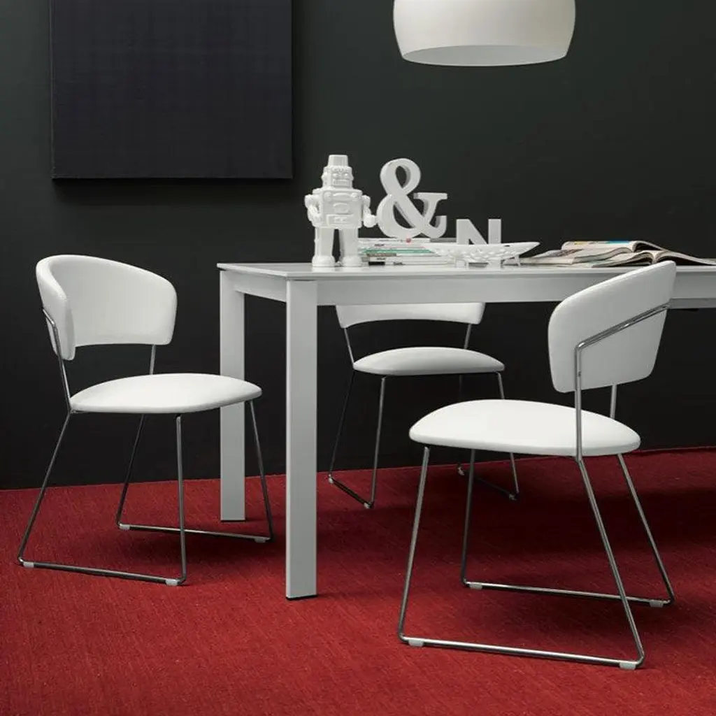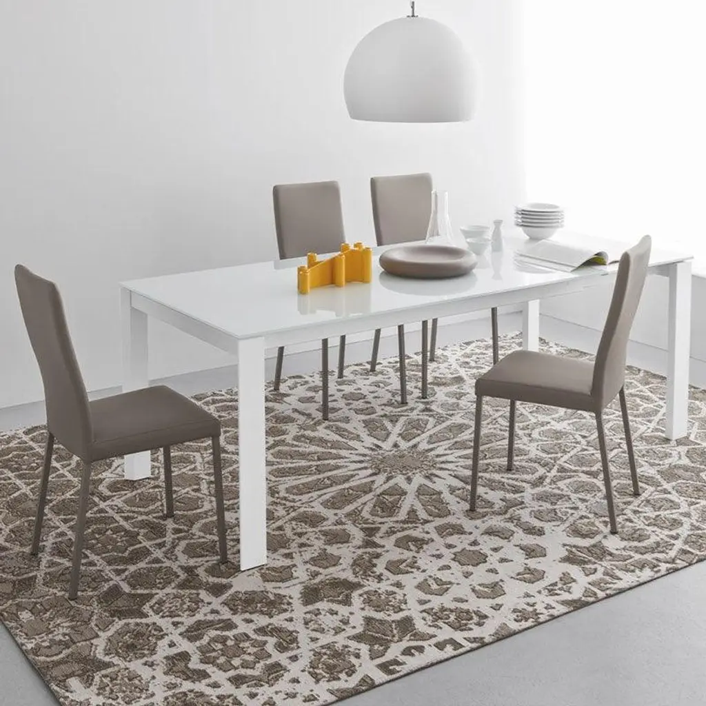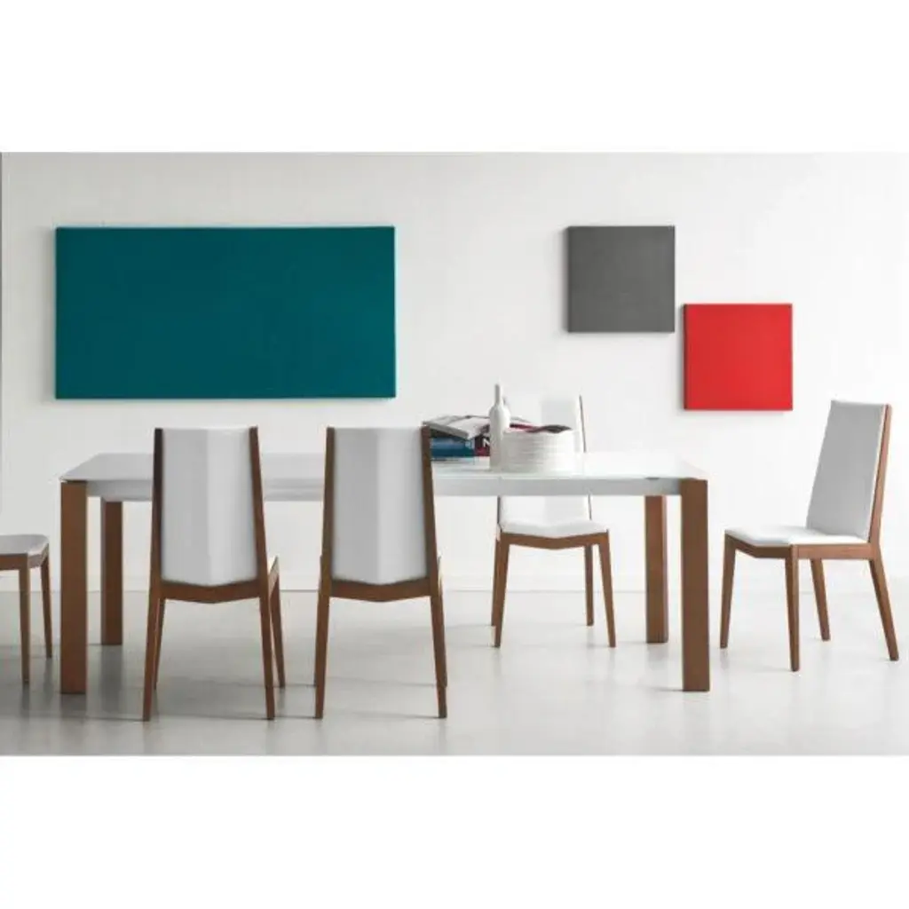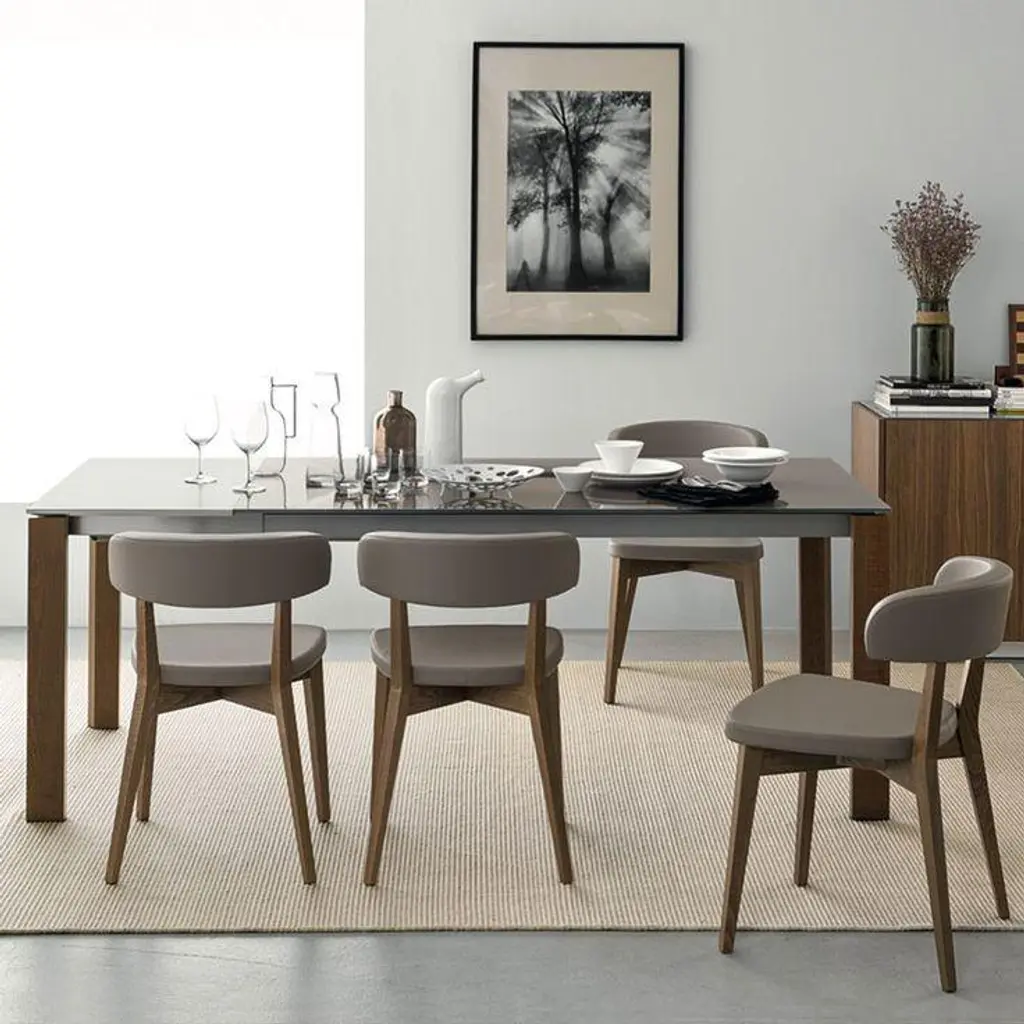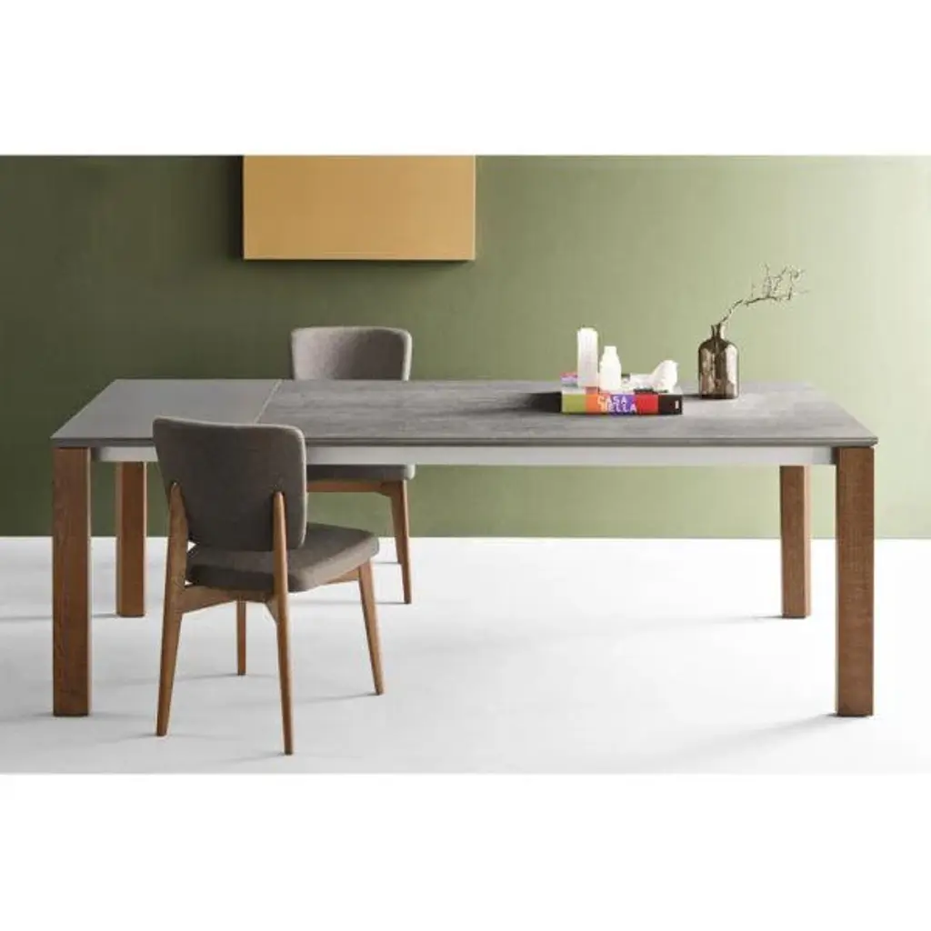 Eminence extending table with metal base and top in mixed materials. Single laminate extension leaf in the same colour as the edging of the main tabletop, where wood sits alongside ceramic, tempered glass or wood veneer. This wide range of modular tables can adapt to any space and design.