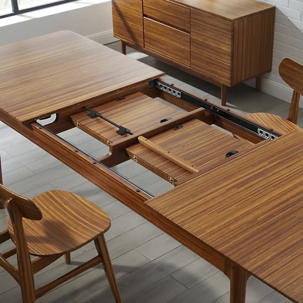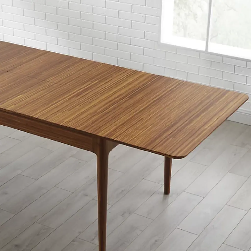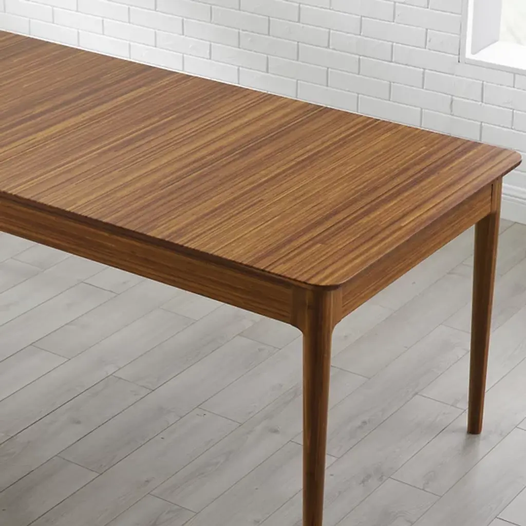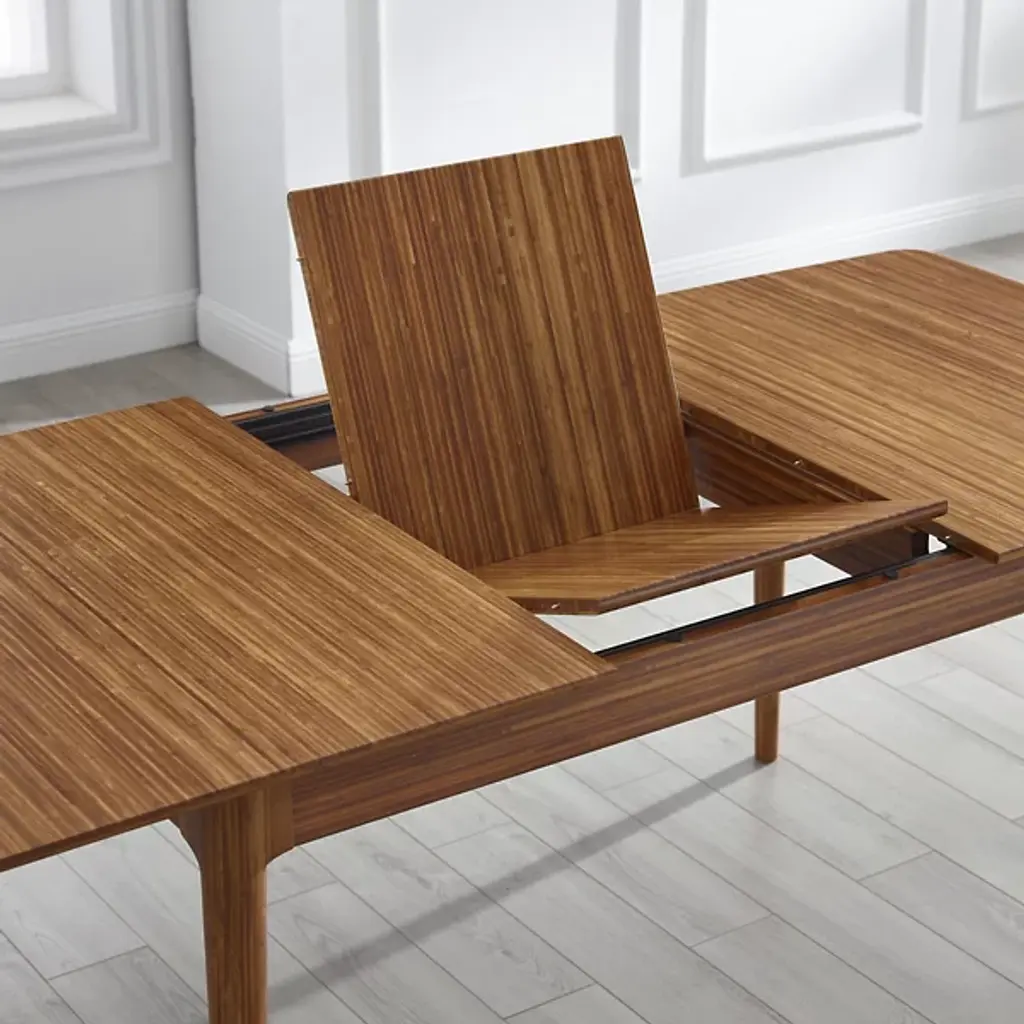 Expand your living and dining spaces with the appealing intricacy of the Erikka Double-Leaves Extendable Dining Tablee from Greenington. An appealing, authentic piece made from tough and sustainably harvested bamboo, it starts with four tapered legs that ascend to a curve-cornered rectangular top, concealing two leaves that can slide out from its center to support additional diners with ease. A proprietary heat-treating process uses steam and pressure to give each table an individual amber grain that enhances its stylish modern design.