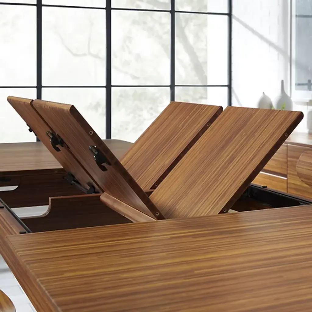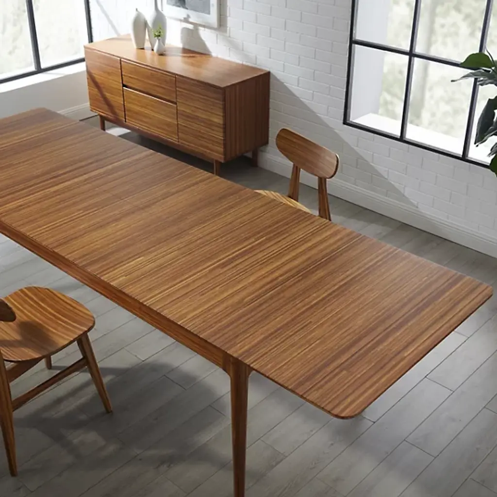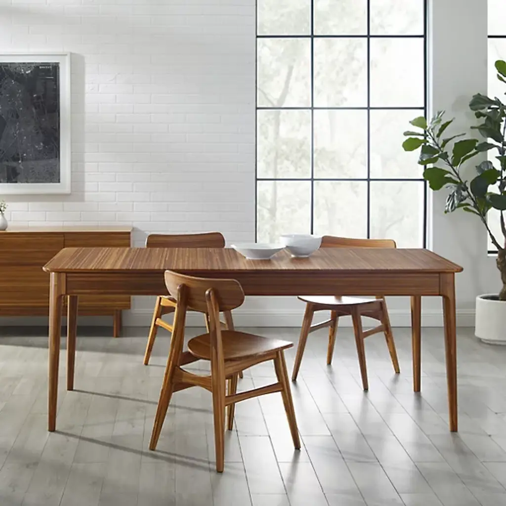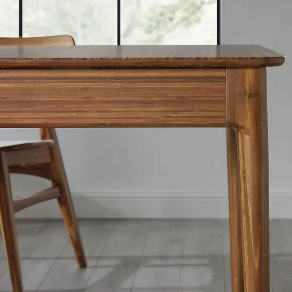 Expand your living and dining spaces with the appealing intricacy of the Erikka Double-Leaves Extendable Dining Tablee from Greenington. An appealing, authentic piece made from tough and sustainably harvested bamboo, it starts with four tapered legs that ascend to a curve-cornered rectangular top, concealing two leaves that can slide out from its center to support additional diners with ease. A proprietary heat-treating process uses steam and pressure to give each table an individual amber grain that enhances its stylish modern design.