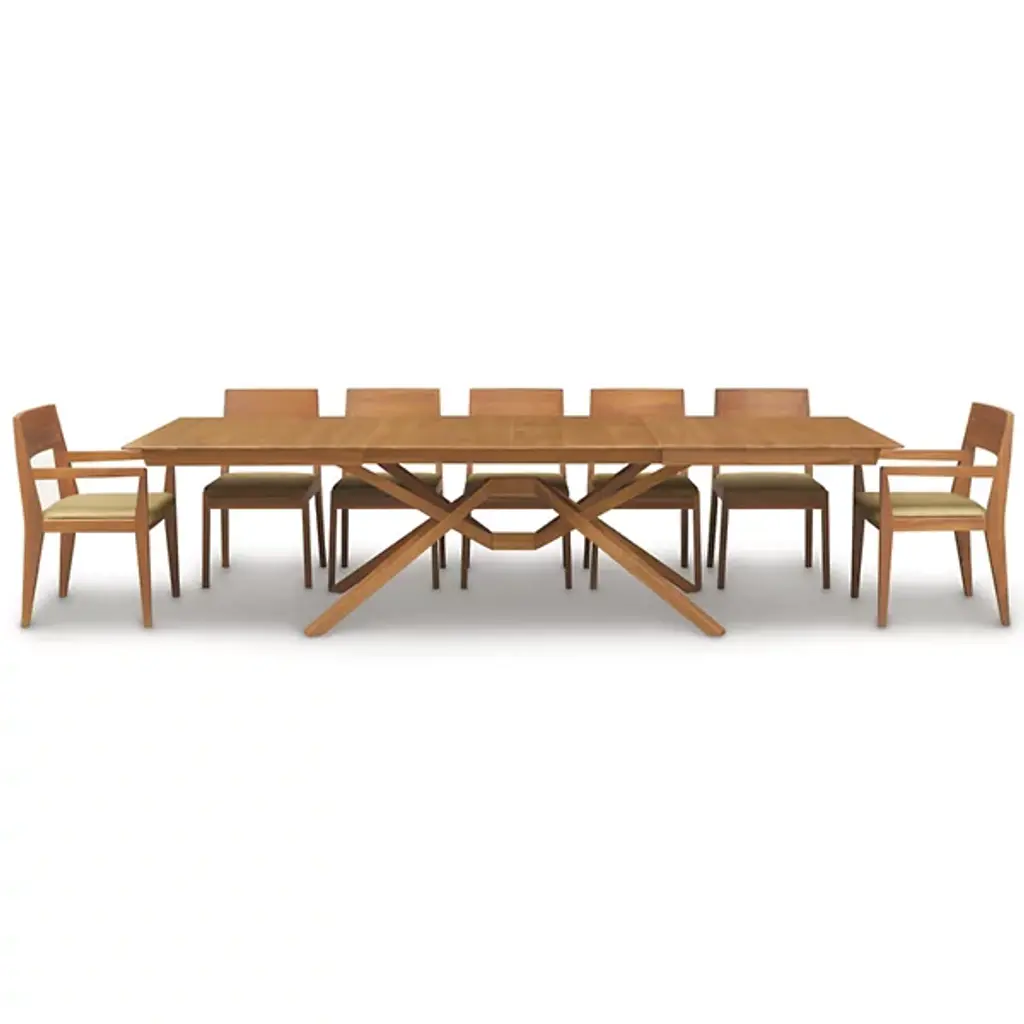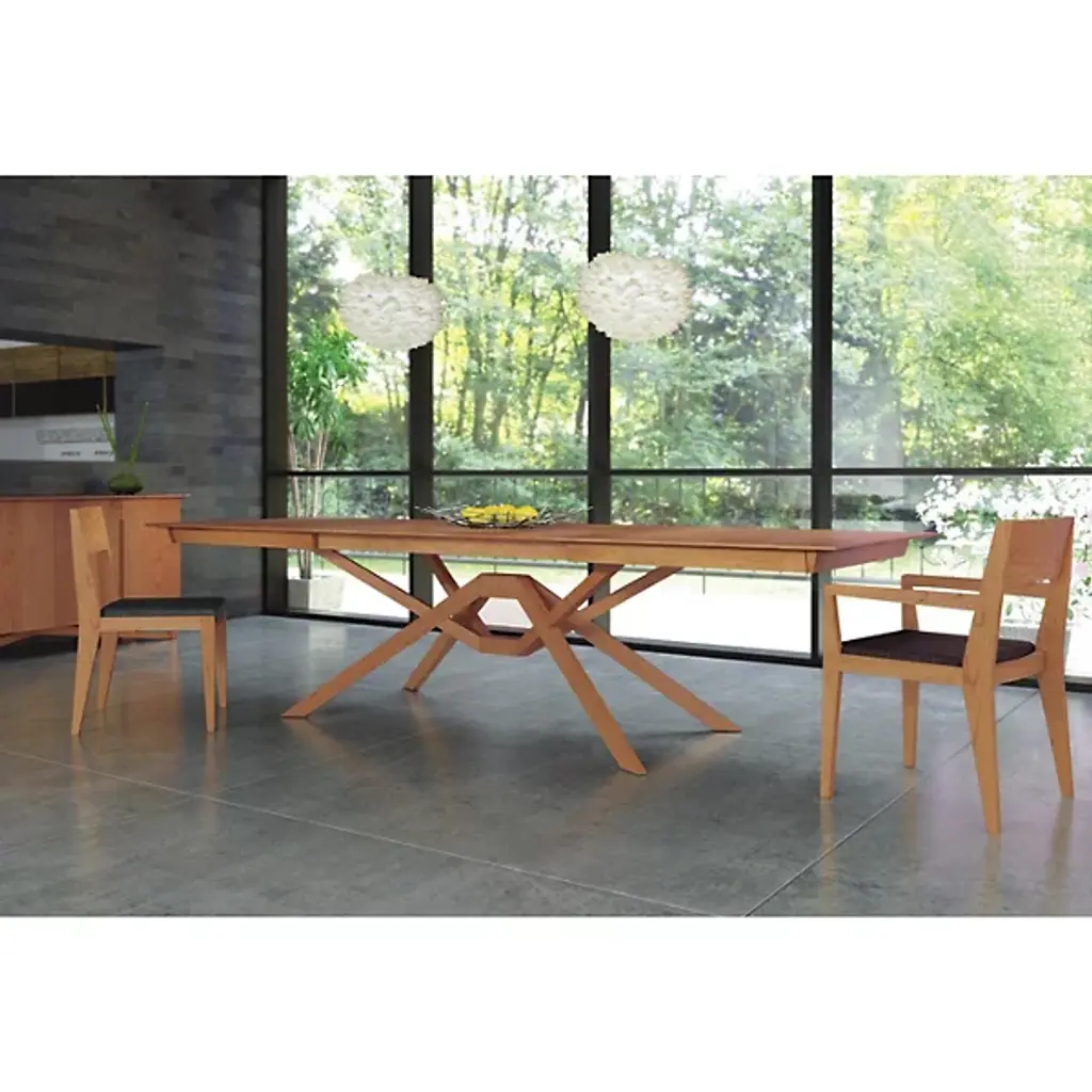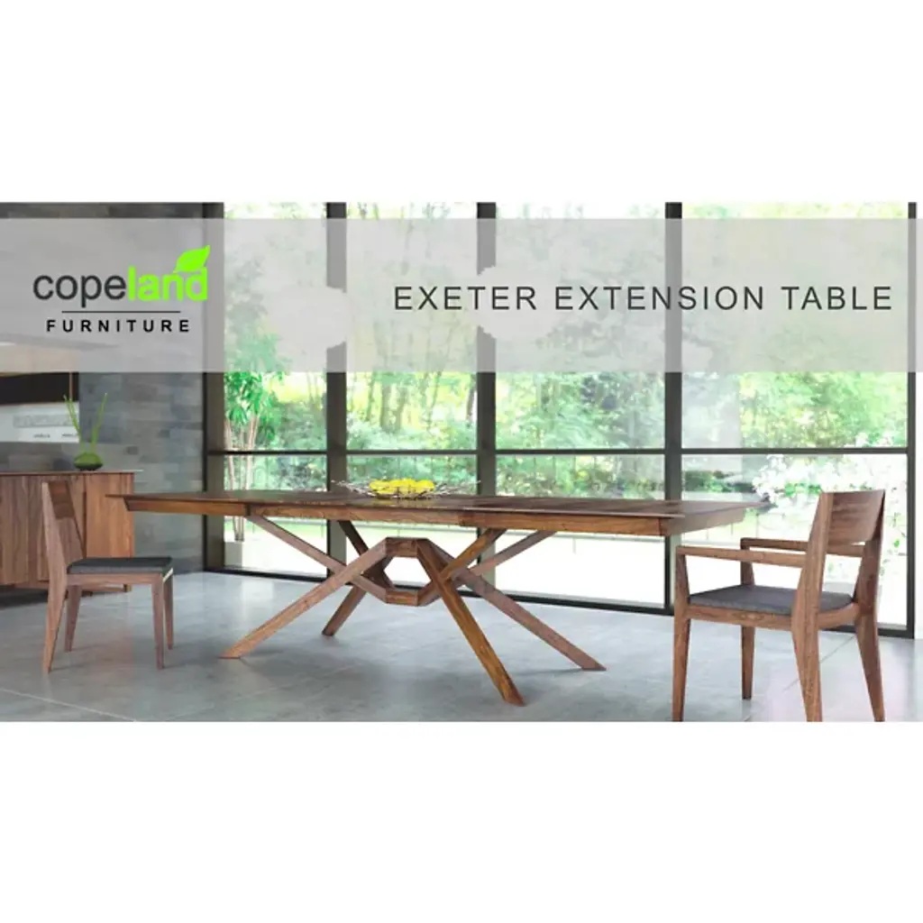 A whole new angle on contemporary dining. The distinctive base of the Copeland Furniture Exeter Extension Table is doubly angular and--due to the isometric tension that results--exceptionally strong. It, the top and the contained butterfly extension leaf (or leaves) are all made out of Solid American Black Walnut or Solid Cherry Hardwood. When you need a whole lot of seating space, the double leaf option can be used with one or both leaves to seat up to 12.