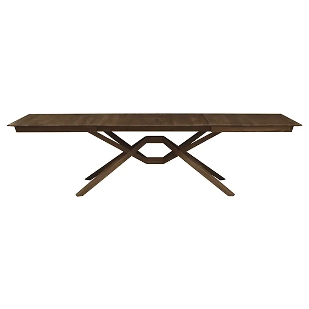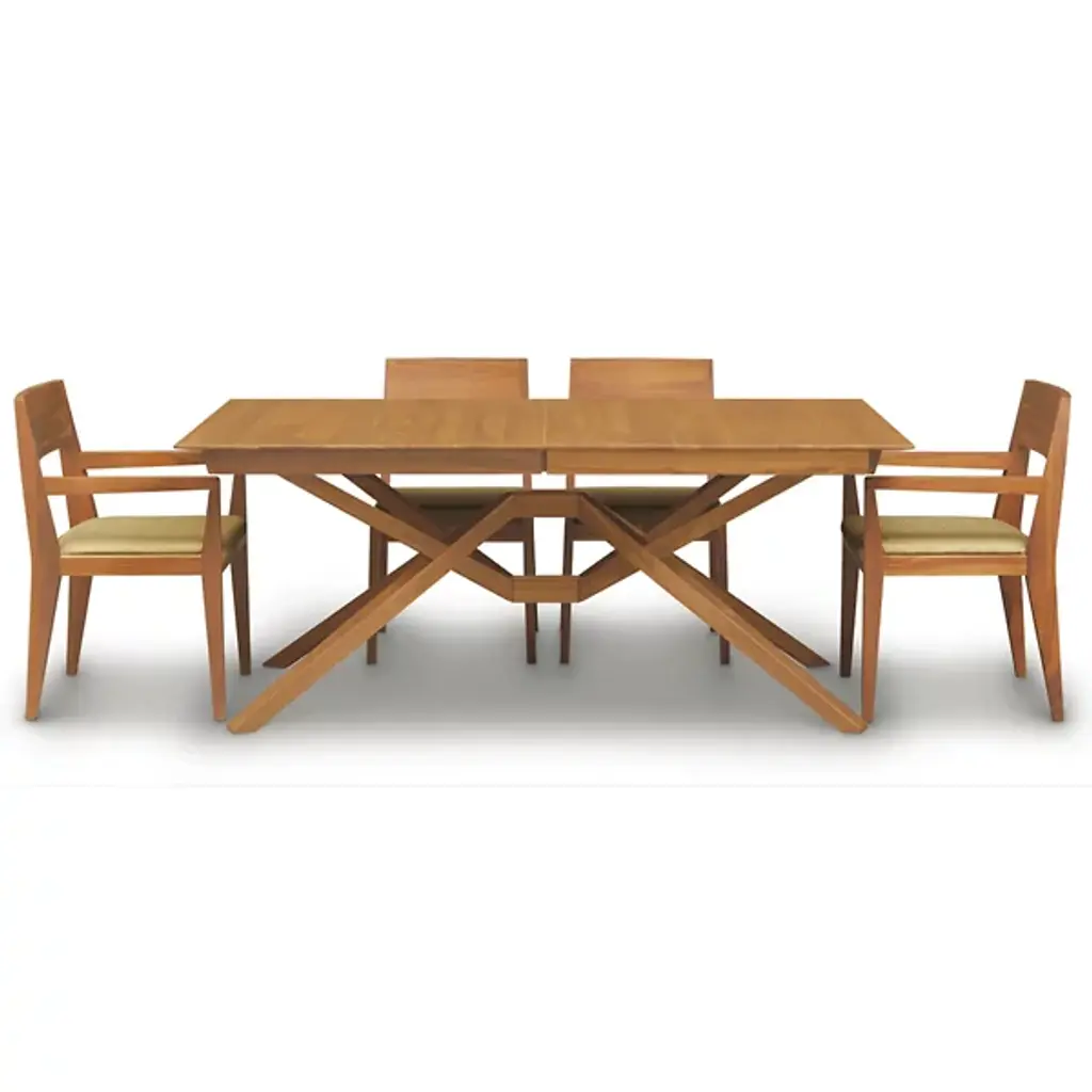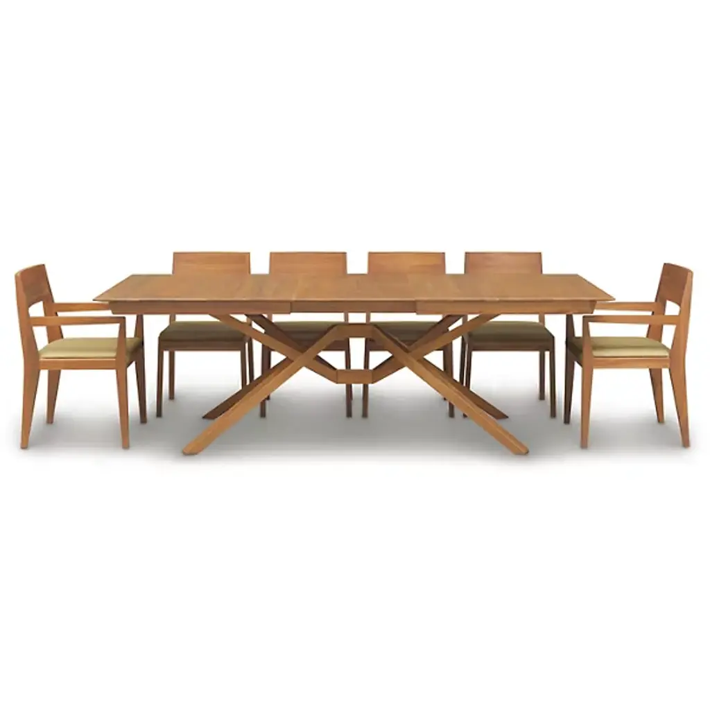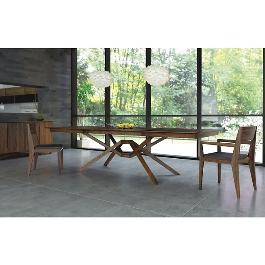 A whole new angle on contemporary dining. The distinctive base of the Copeland Furniture Exeter Extension Table is doubly angular and--due to the isometric tension that results--exceptionally strong. It, the top and the contained butterfly extension leaf (or leaves) are all made out of Solid American Black Walnut or Solid Cherry Hardwood. When you need a whole lot of seating space, the double leaf option can be used with one or both leaves to seat up to 12.