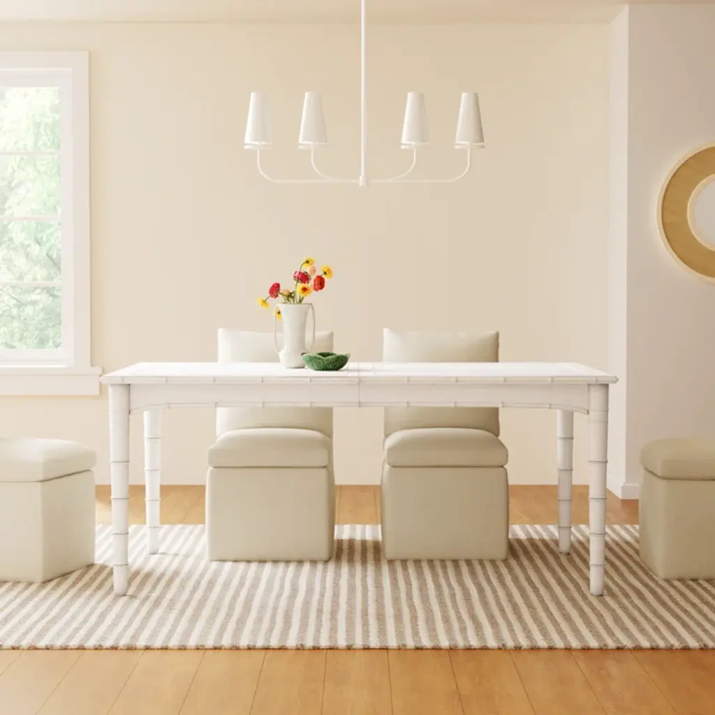 Capturing the vintage charm of the coastal South and the tropical craftsmanship of the West Indies, the rectangle dining table has bamboo-motif accents and slender bamboo-style legs. The wood table has a solid wood edge top and is finished in a white heron, a softer interpretation of the classic southern limestone white with a slightly brighter sheen, delivering an heirloom-quality finish. With one 20-inch leaf in place, the table extends to 88 inches long. The table accommodates 4 side chairs and two armchairs without the leaf and 6 side chairs and two armchairs with the leaf.