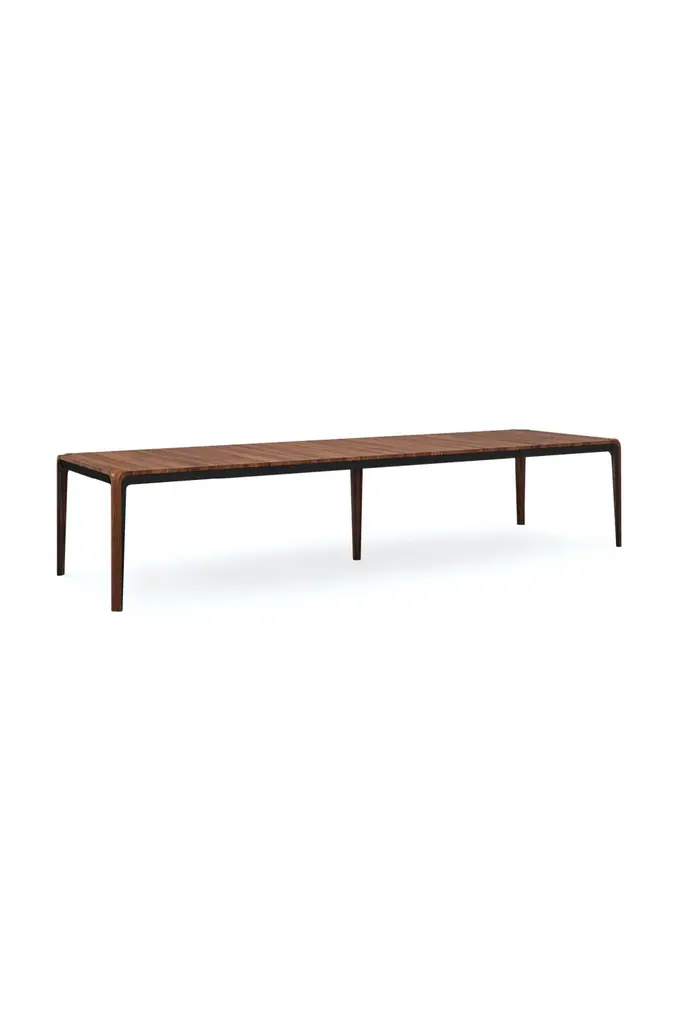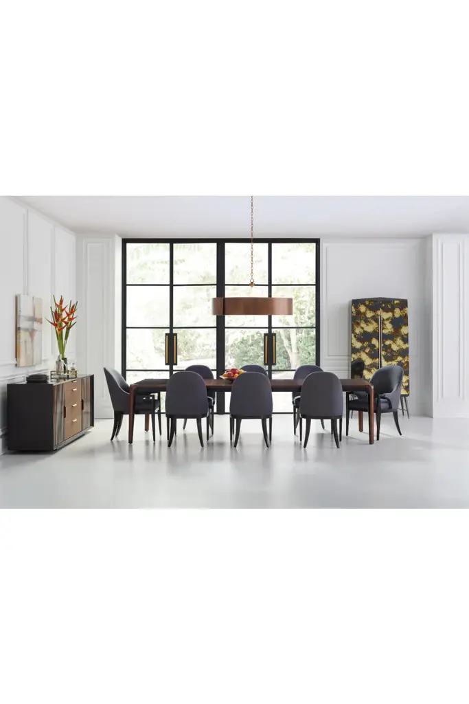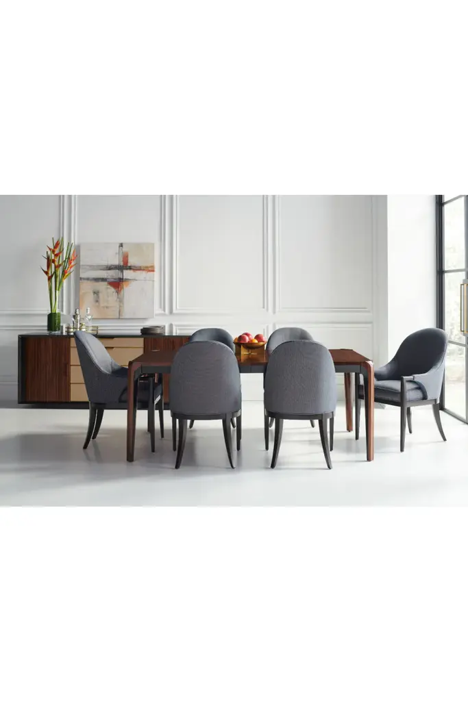 There’s always room for more with this extension dining table, evoking a balance between refined simplicity and modern functionality. Highlighting the intricate wood grain, the tabletop is finished in Rich Walnut or Moonstone. Tapered legs, also trimmed in Dark Chocolate, appear to flow from the tabletop like a waterfall. Comfortably seats 8 without leaves, and seats 14 when fully expanded with three leaves.