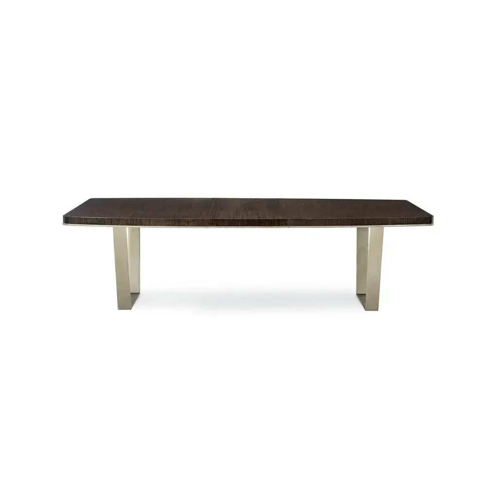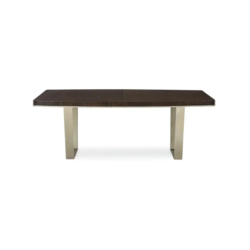 Fumed figured eucalyptus comes to life atop a dining table that is suspended by angled, contemporary metal braces. The wood’s Aged Bourbon finish results in a commanding presence that can be expanded to easily seat 10 people. The accent molding is showcased in a band of Smoked Bronze that matches the sculptural metallic legs. The rounded rectangular shape of this table encourages conversation over a great meal. Dimensions: 104" W x 46" D x 30" H Closed 82" W w one 22" leaf
