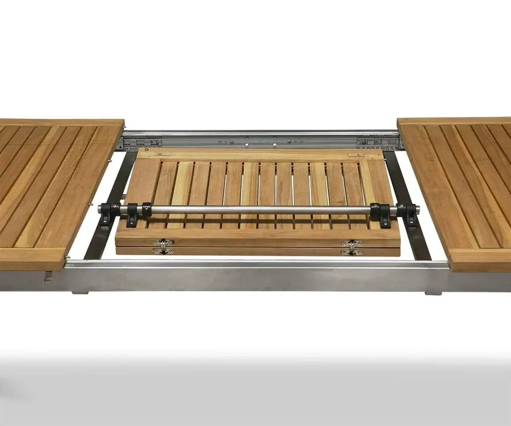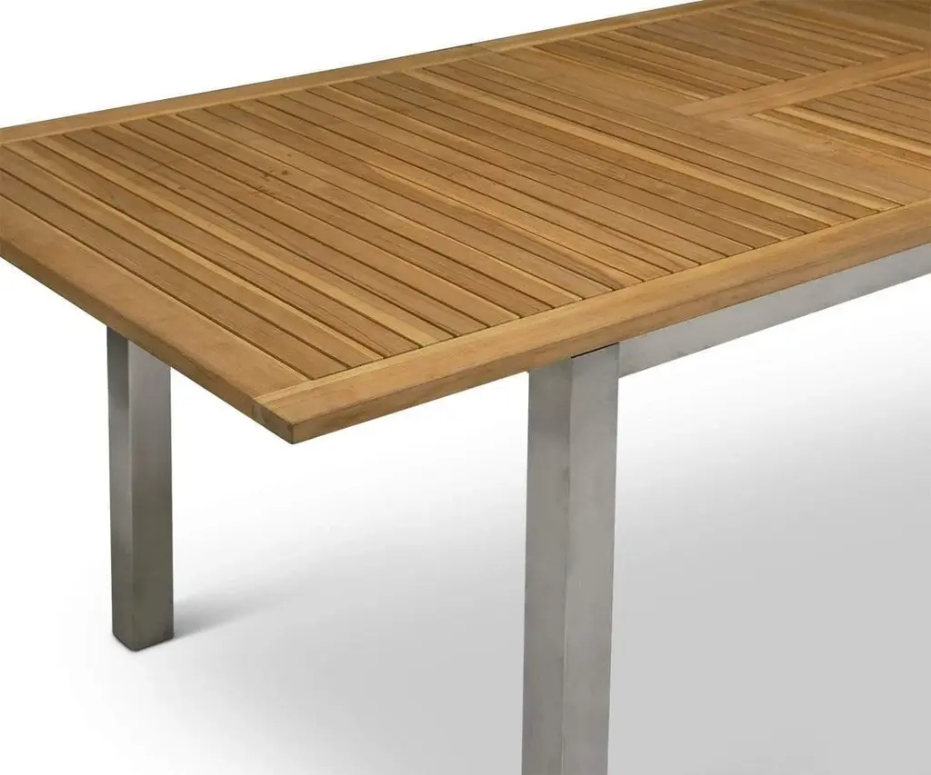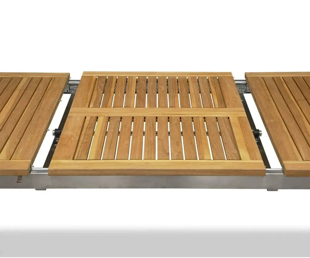 Get ready for everything from backyard barbecues to summertime soirees with the Farino Outdoor Extension Dining Table. The slatted top of this piece is crafted from natural teak, which boasts superior longevity and resilience to the elements. Stainless steel legs add a modern, angular aesthetic and plenty of durability. Not enough room? No problem! Use the extra leaf to extend the Farino Outdoor Extension Dining Table up to 94.5" when more guests arrive.