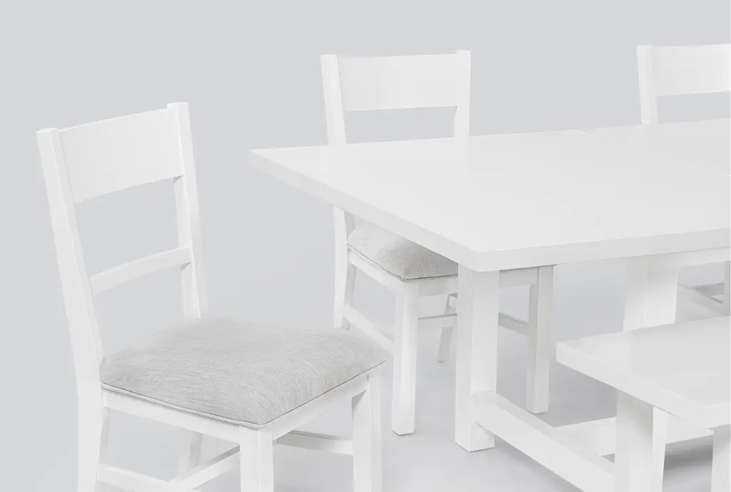 Enhance your dining experience with the Felipe White 72-90" Extendable Dining Table with Bench Set for 6. This modern dining set features a clean, white finish that complements any dining room decor. Crafted from wood, MDF, and veneer, the extendable table offers flexibility for both everyday meals and special occasions.