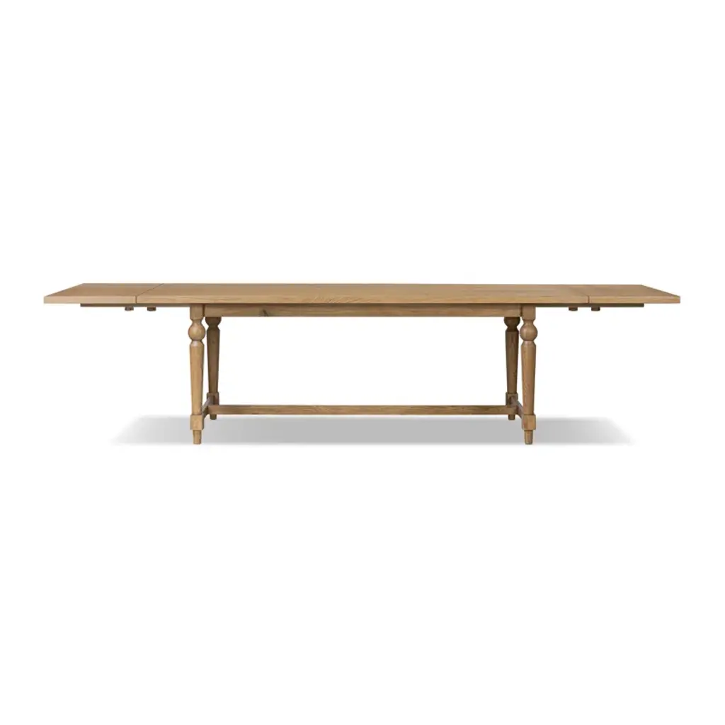 This extendable dining table invites you to gather around and celebrate life's moments, big or small. Crafted with a rectangular engineered wood top and a solid wood base, it features a distressed ivory finish that adds a sense of timeless elegance to your dining space. The table's standout feature is its removable leaf, allowing you to effortlessly expand your seating capacity to accommodate up to 12 guests. The turned, tapered legs offer a nod to classic design, while the natural wood knots bring a warm, rustic charm. This table is a versatile addition to your home, ideal for everything from intimate dinners to festive gatherings.
